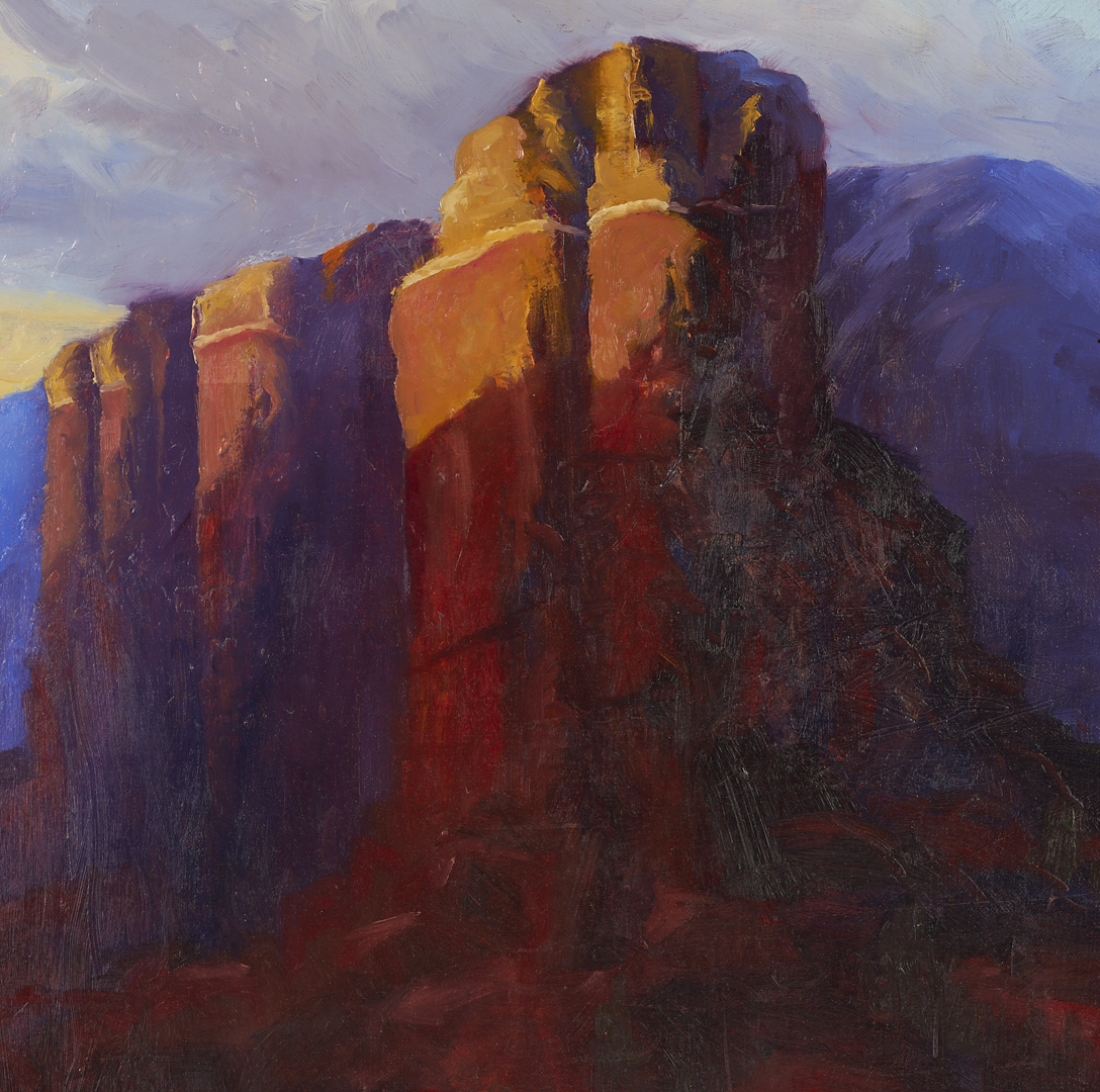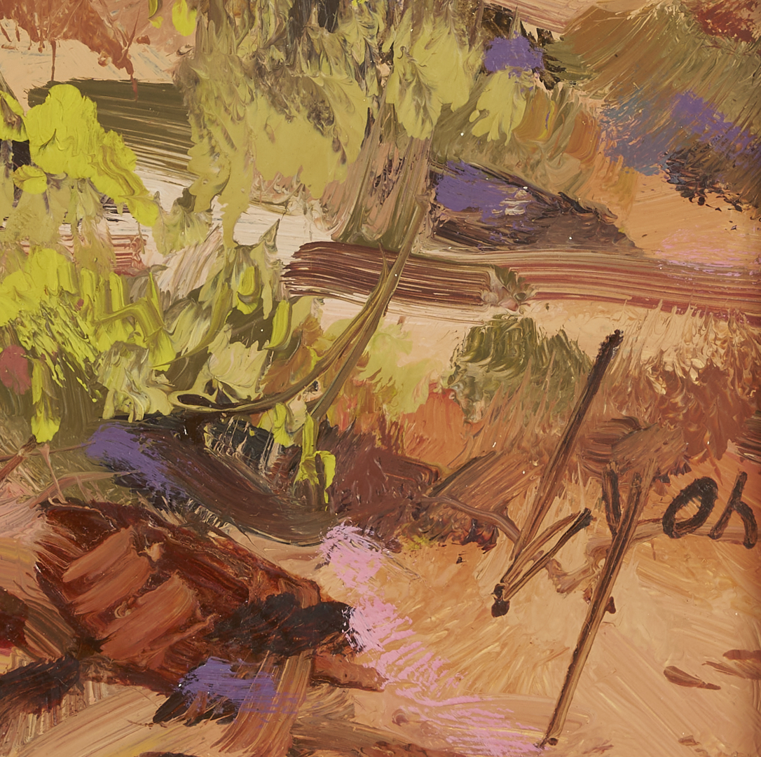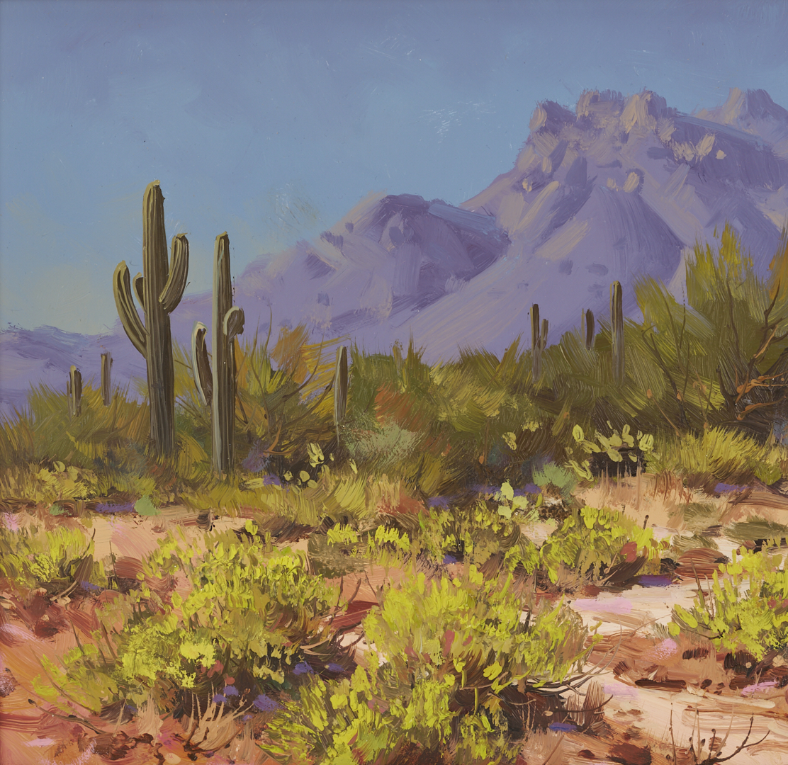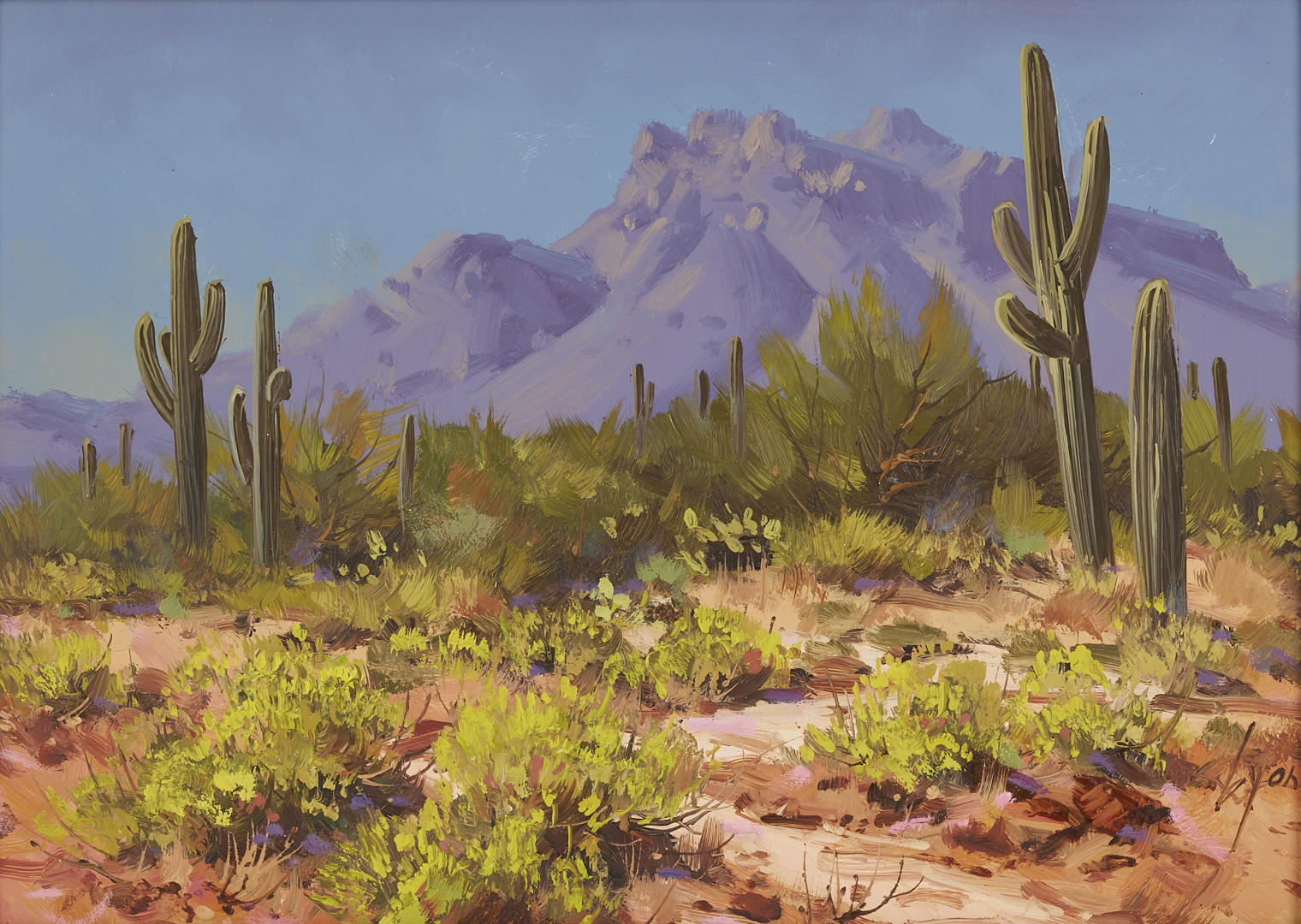 1st item: Harold Lyon (Arizona/Canada, 1930-2020) oil on board Southwest desert, likely Arizona, landscape painting with sagebrush and cacti in the foreground and purple mountains in the background. Signed lower right. Housed in a molded giltwood frame with carved corner elements and linen liner. Sight: 9 3/4 in. H x 13 5/8 in. W. Framed: 17 3/4 in. H x 22 in. W. 2nd item: Darryl Glenn Steele (Tennessee, b.1956) oil on canvas landscape painting, “Echoes of Sedona,” that depicts a steep red rock formation in front of a blue mountainous background. Signed “Steele” lower left. Additionally signed, titled, and dated “1992” en verso. Housed in a contemporary gilt frame with a linen liner. Sight: 19 3/4 in. H x 15 3/4 in. W. Framed: 26 in. H x 21 3/4 in. W.