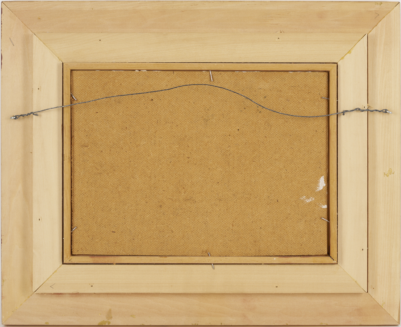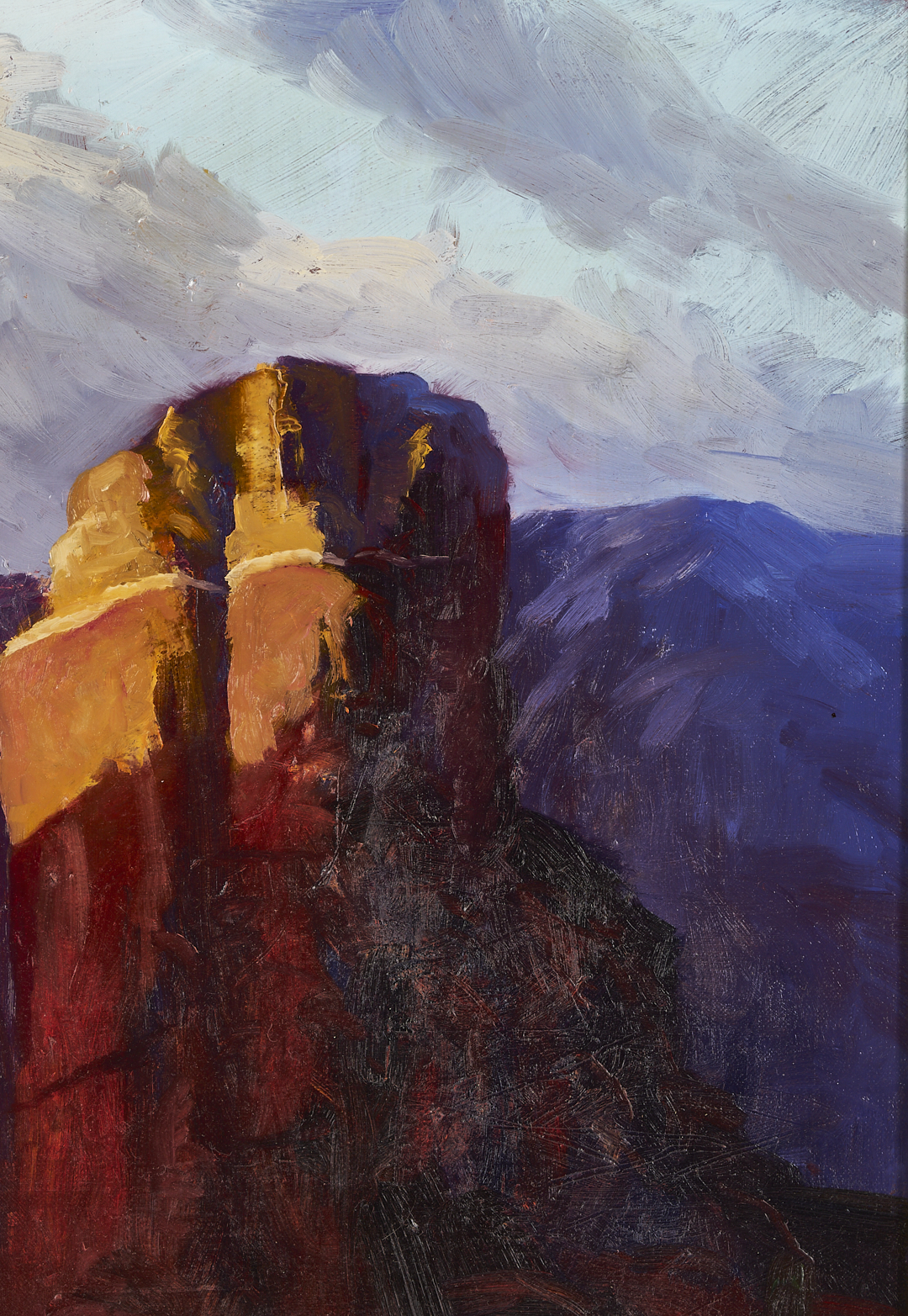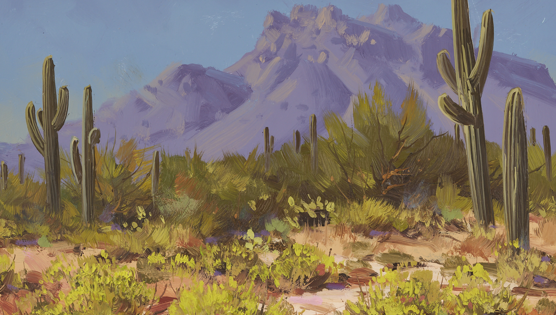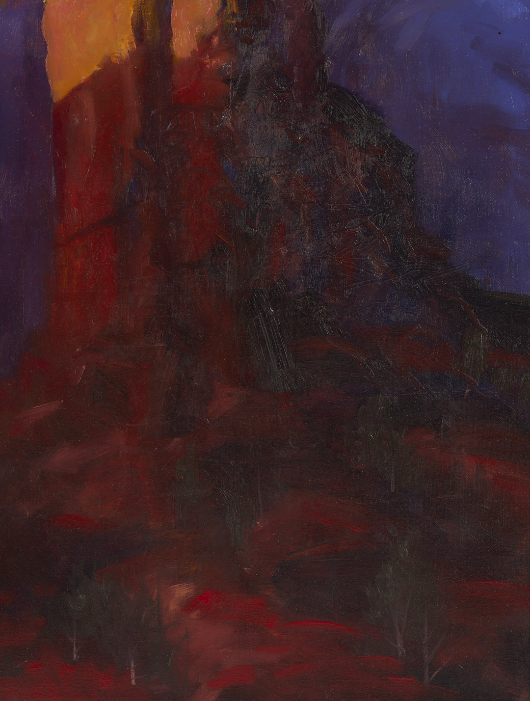 1st item: Harold Lyon (Arizona/Canada, 1930-2020) oil on board Southwest desert, likely Arizona, landscape painting with sagebrush and cacti in the foreground and purple mountains in the background. Signed lower right. Housed in a molded giltwood frame with carved corner elements and linen liner. Sight: 9 3/4 in. H x 13 5/8 in. W. Framed: 17 3/4 in. H x 22 in. W. 2nd item: Darryl Glenn Steele (Tennessee, b.1956) oil on canvas landscape painting, “Echoes of Sedona,” that depicts a steep red rock formation in front of a blue mountainous background. Signed “Steele” lower left. Additionally signed, titled, and dated “1992” en verso. Housed in a contemporary gilt frame with a linen liner. Sight: 19 3/4 in. H x 15 3/4 in. W. Framed: 26 in. H x 21 3/4 in. W.