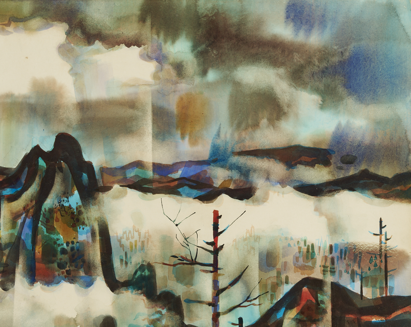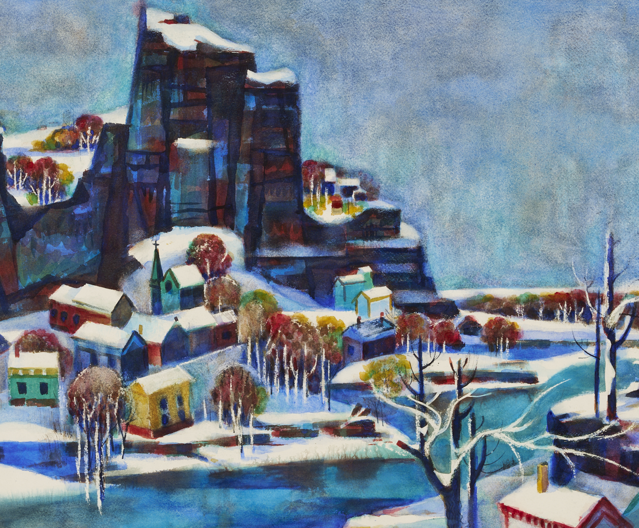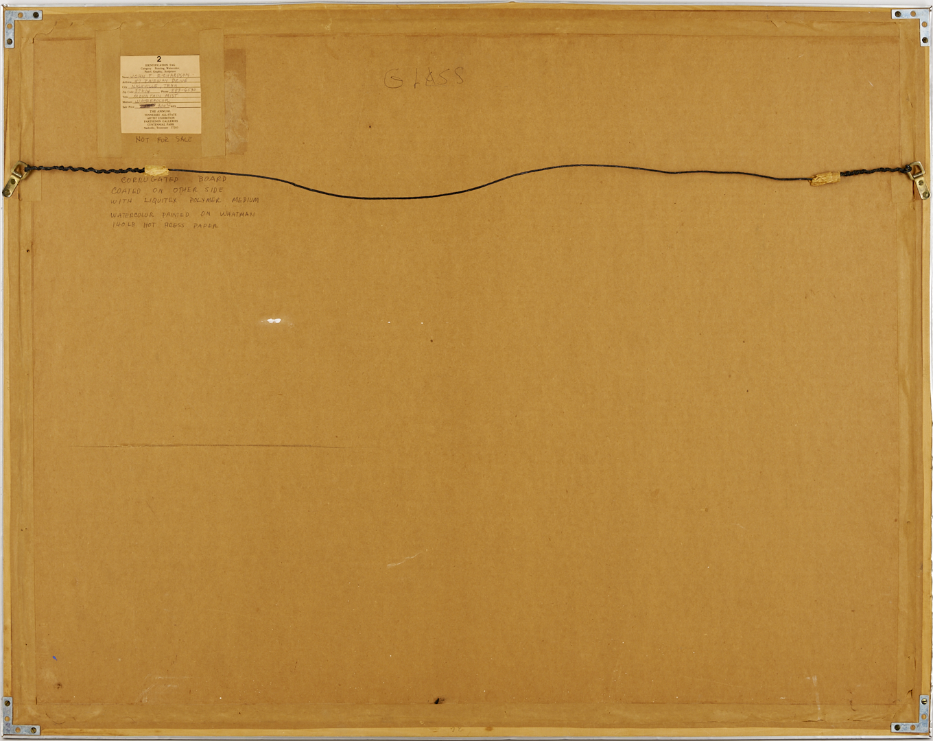Both paintings in overall very good condition. “Mountain Mist” with pinhole punctures to corners plus even toning to sheet. Date is faded. “Mountain Mist” frame with minor abrasions and toning to mat. “Cliff Town” with pinhole punctures to lower right corner. Not examined out of frames.