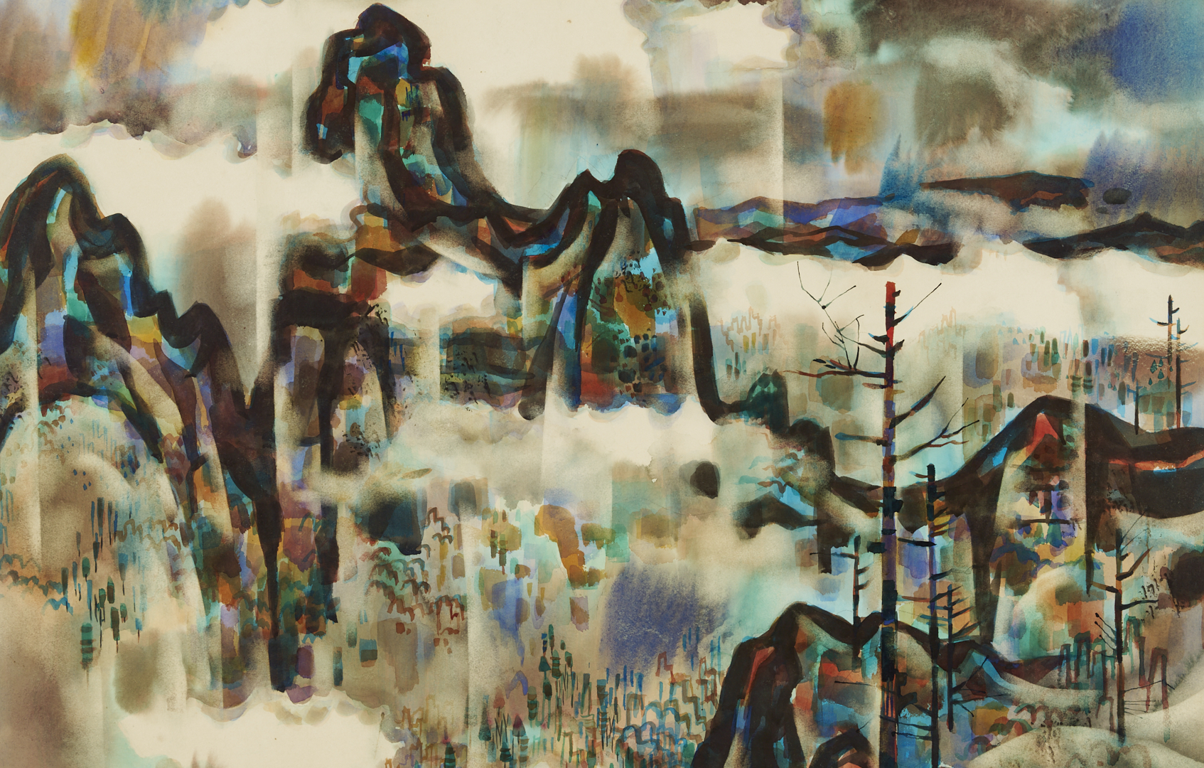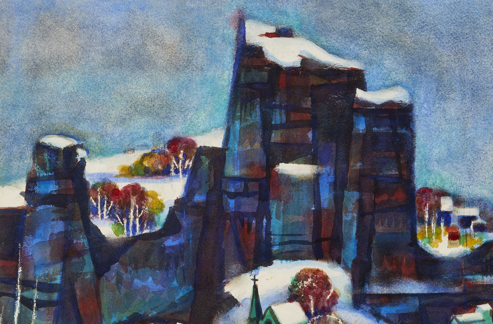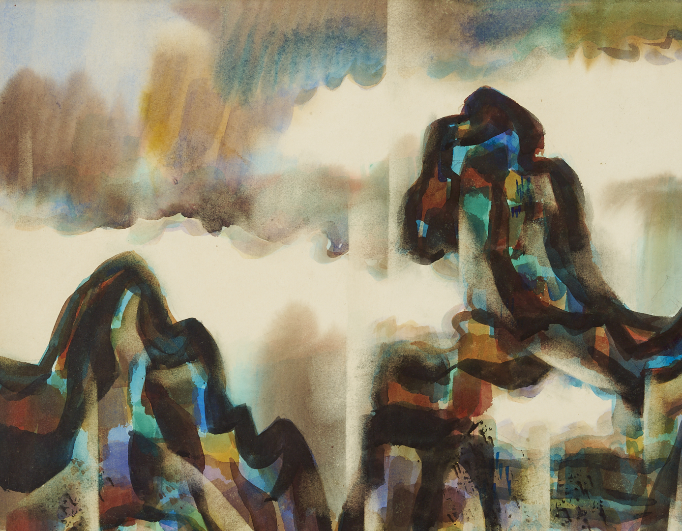 Both paintings in overall very good condition. “Mountain Mist” with pinhole punctures to corners plus even toning to sheet. Date is faded. “Mountain Mist” frame with minor abrasions and toning to mat. “Cliff Town” with pinhole punctures to lower right corner. Not examined out of frames.