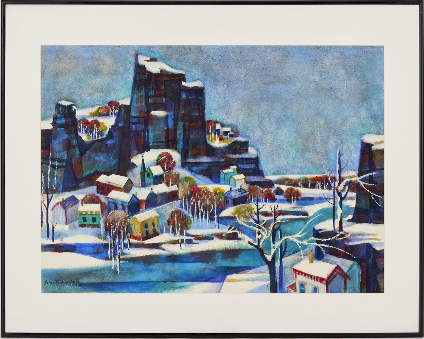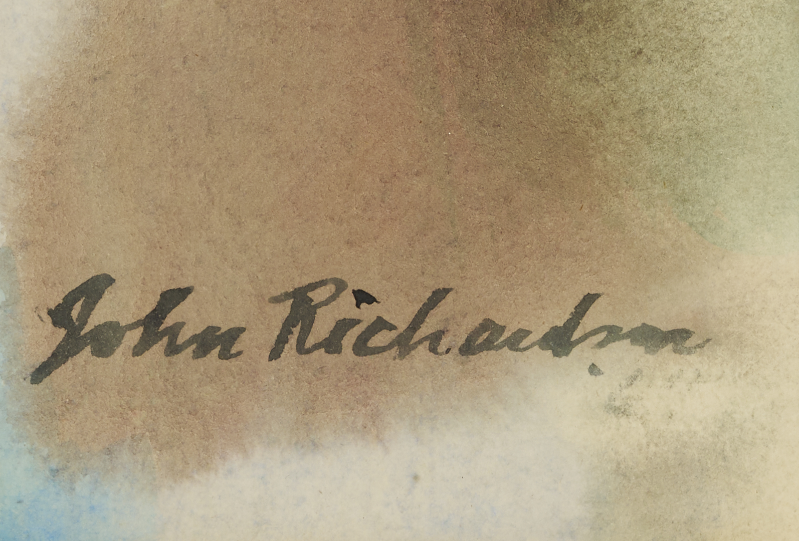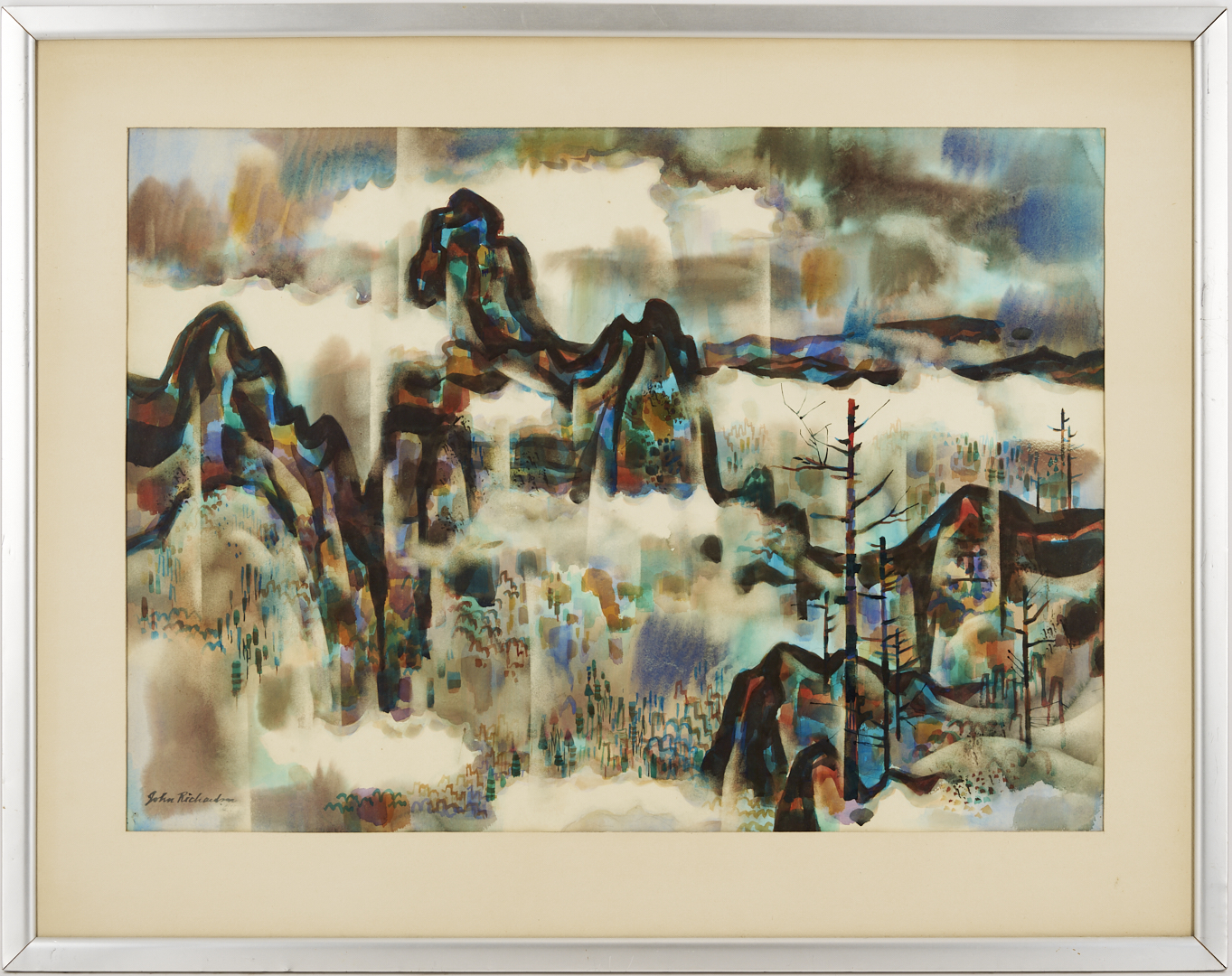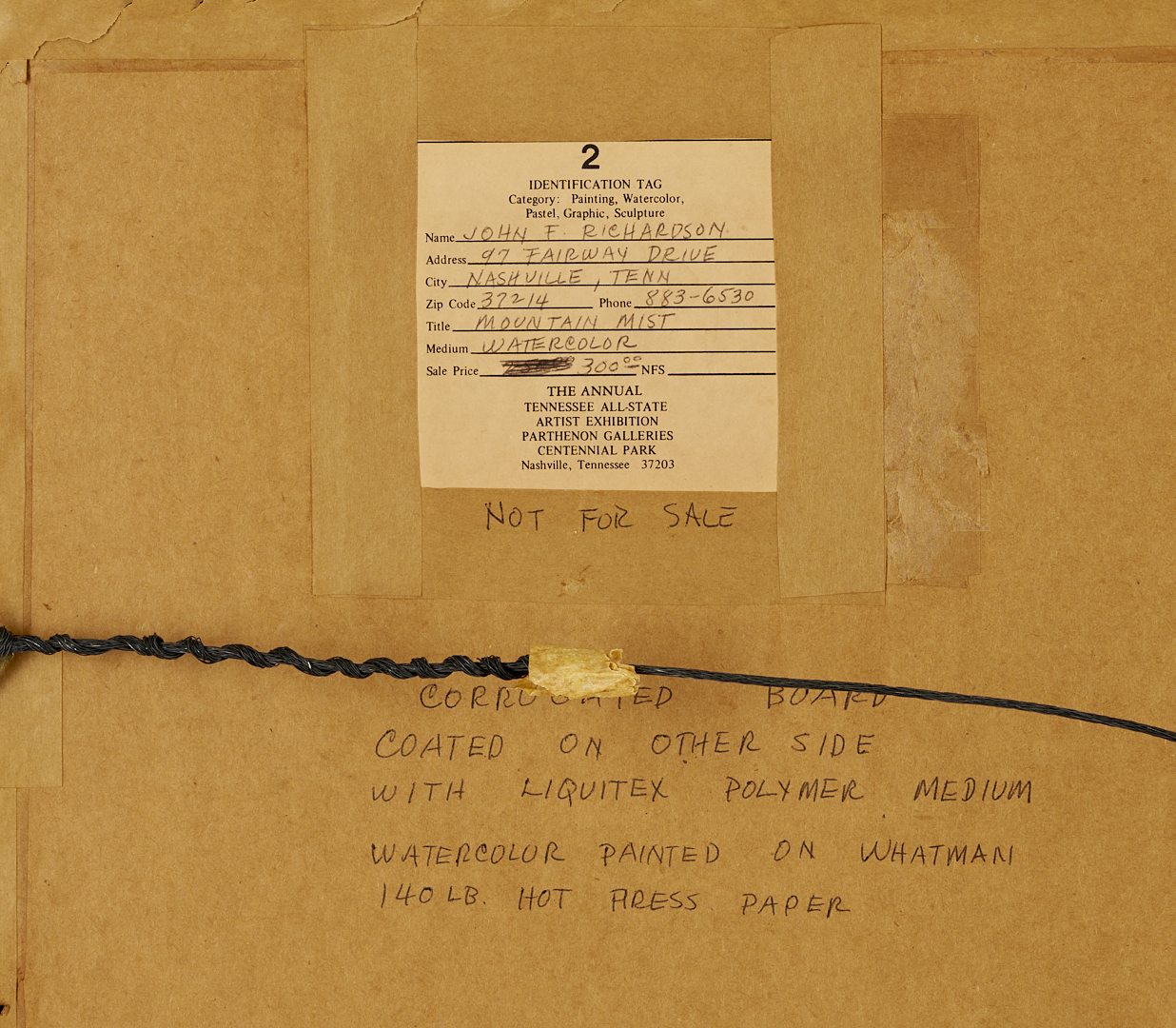 Two (2) John Frederick Richardson (Tennessee/Illinois, 1906-1998) watercolor winter western landscape paintings, “Mountain Mist” and “Cliff Town.” Both signed lower left. “Mountain Mist” dated 196[?] and “Cliff Town” dated 1965. “Mountain Mist” with The Annual Tennessee All-State Artist Exhibition, Parthenon Galleries, Centennial Park, Nashville, TN exhibition label affixed to backing. Both housed under glass in modern metal frames. “Mountain Mist” sight: 21 3/8In H x 29 3/4 in. W. “Mountain Mist” framed: 29 1/2 in. H x 37 5/8 in. W. “Cliff Town” sight: 20 3/4 in. H x 28 3/4 in. W. “Cliff Town” framed: 28 1/2 in. H x 35 3/4 in. W. Biographical note: “Preferring watercolor to oil, John Richardson had a long career painting landscapes in many styles and mediums and in many places from Tennessee to Arizona to Washington State. He lived in Tennessee and Illinois. He studied at Vanderbilt University, Pennsylvania Academy of the Fine Arts and the University of Chicago. Exhibition venues included the Pennsylvania Academy, Art Institute of Chicago and Vanderbilt University. Richardson taught at Watkins Institute in Nashville from 1938 to 1942 and from 1949 to 1969 at the University of Illinois in Chicago Circle.” (Source: Peter Falk, “Who Was Who in American Art”)