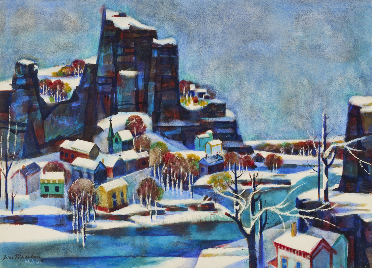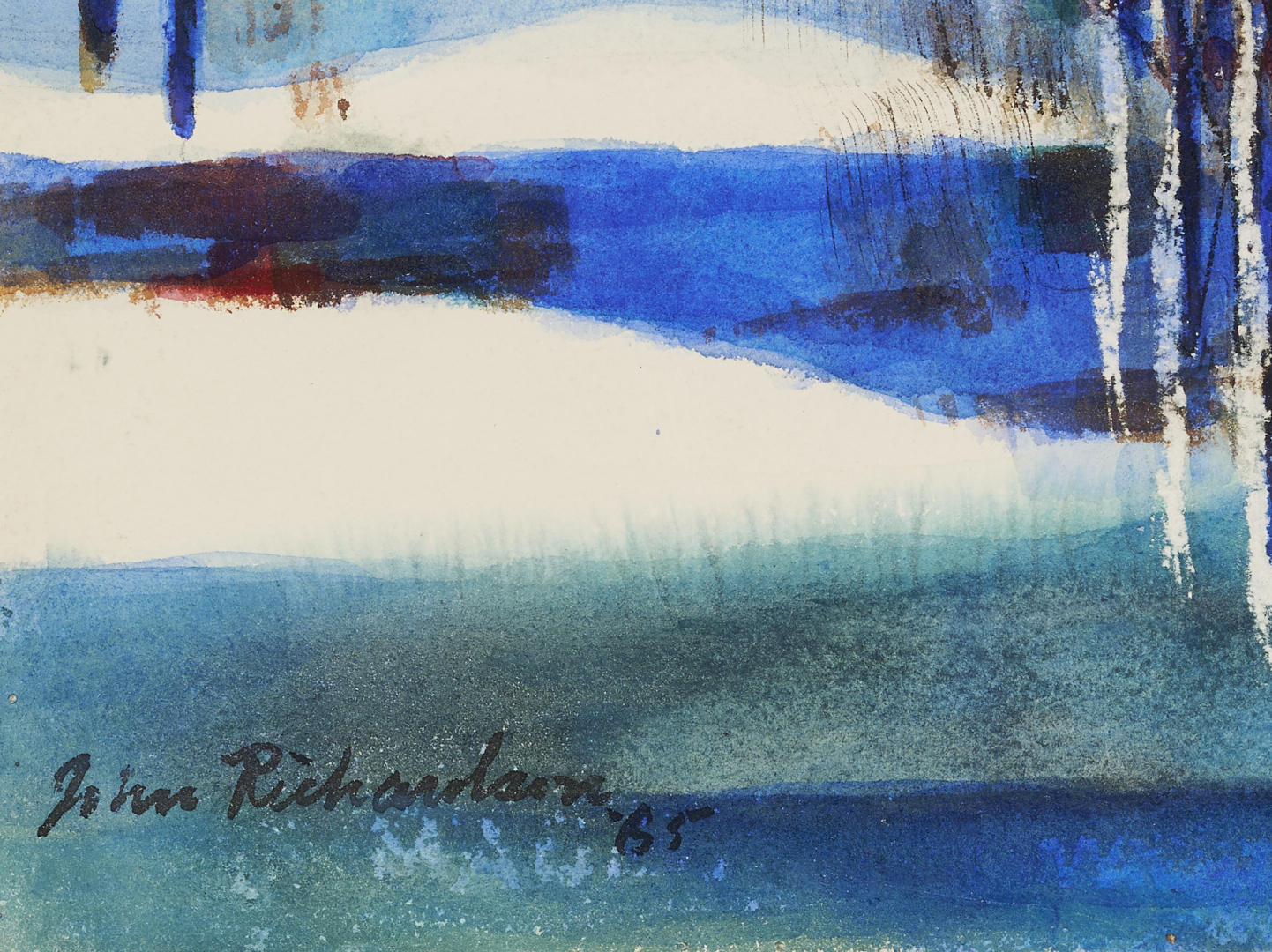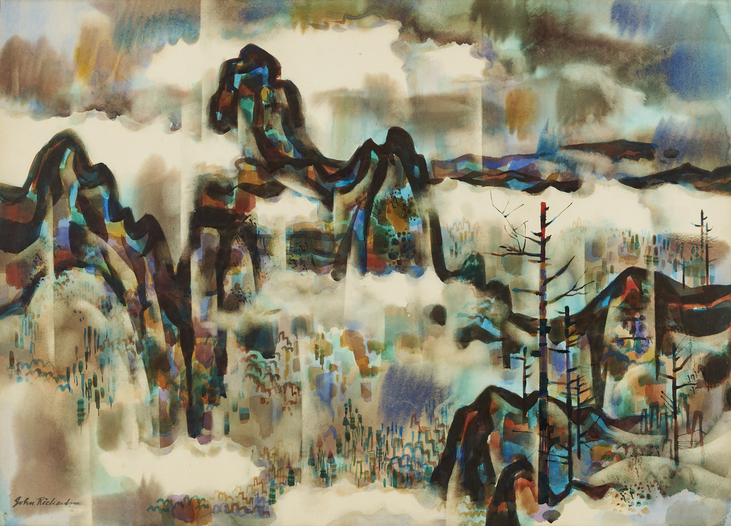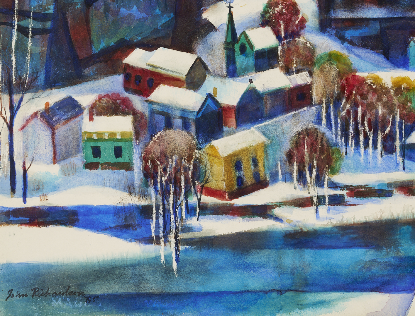 Two (2) John Frederick Richardson (Tennessee/Illinois, 1906-1998) watercolor winter western landscape paintings, “Mountain Mist” and “Cliff Town.” Both signed lower left. “Mountain Mist” dated 196[?] and “Cliff Town” dated 1965. “Mountain Mist” with The Annual Tennessee All-State Artist Exhibition, Parthenon Galleries, Centennial Park, Nashville, TN exhibition label affixed to backing. Both housed under glass in modern metal frames. “Mountain Mist” sight: 21 3/8In H x 29 3/4 in. W. “Mountain Mist” framed: 29 1/2 in. H x 37 5/8 in. W. “Cliff Town” sight: 20 3/4 in. H x 28 3/4 in. W. “Cliff Town” framed: 28 1/2 in. H x 35 3/4 in. W. Biographical note: “Preferring watercolor to oil, John Richardson had a long career painting landscapes in many styles and mediums and in many places from Tennessee to Arizona to Washington State. He lived in Tennessee and Illinois. He studied at Vanderbilt University, Pennsylvania Academy of the Fine Arts and the University of Chicago. Exhibition venues included the Pennsylvania Academy, Art Institute of Chicago and Vanderbilt University. Richardson taught at Watkins Institute in Nashville from 1938 to 1942 and from 1949 to 1969 at the University of Illinois in Chicago Circle.” (Source: Peter Falk, “Who Was Who in American Art”)