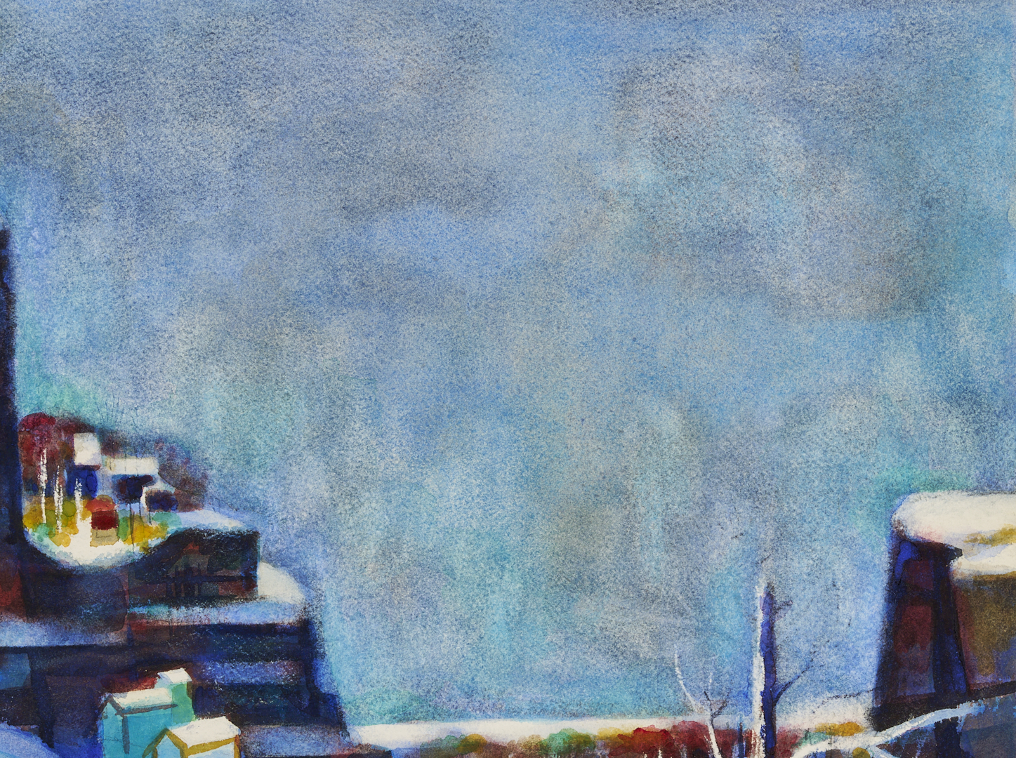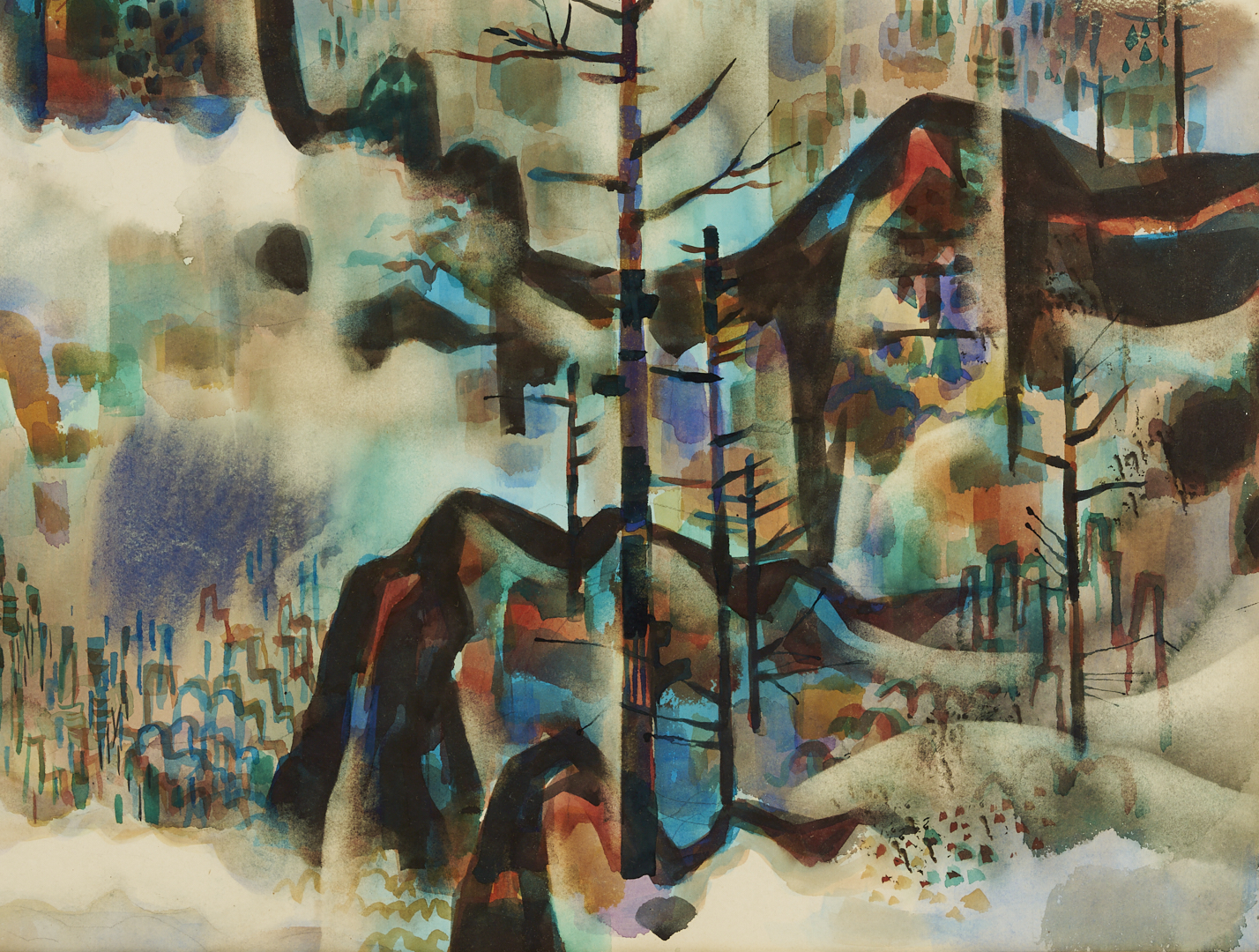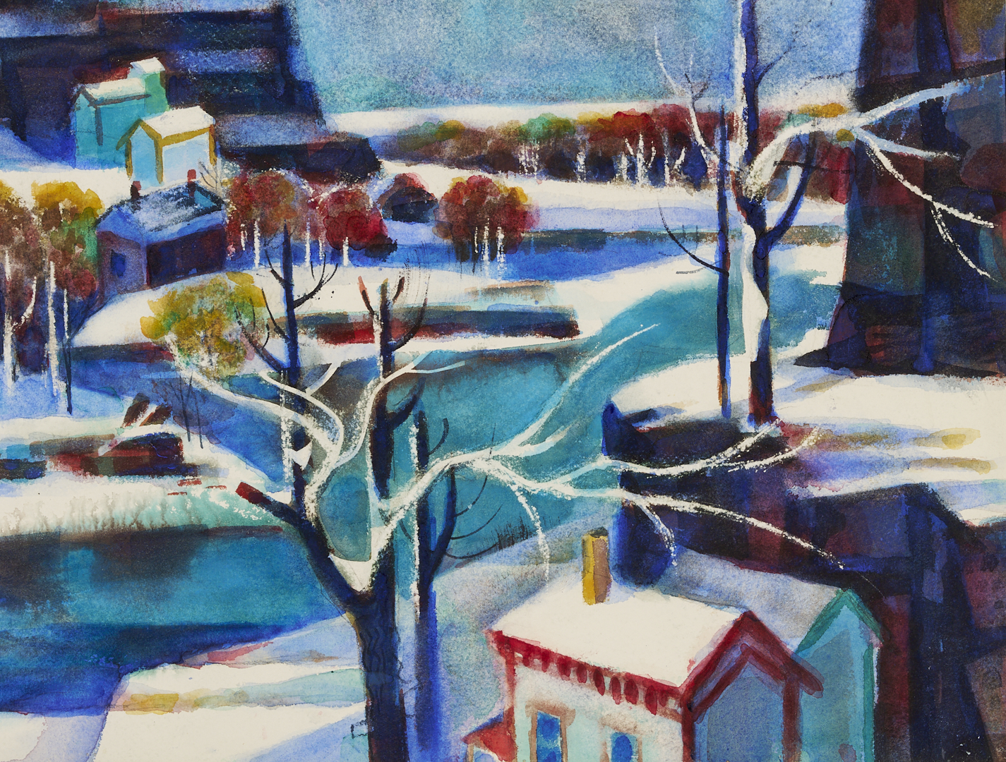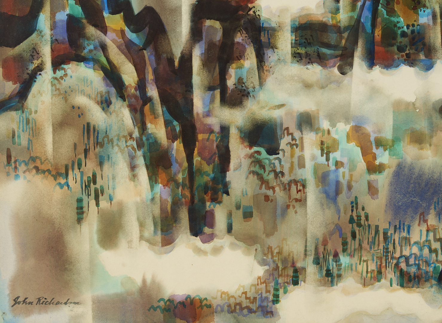Two (2) John Frederick Richardson (Tennessee/Illinois, 1906-1998) watercolor winter western landscape paintings, “Mountain Mist” and “Cliff Town.” Both signed lower left. “Mountain Mist” dated 196[?] and “Cliff Town” dated 1965. “Mountain Mist” with The Annual Tennessee All-State Artist Exhibition, Parthenon Galleries, Centennial Park, Nashville, TN exhibition label affixed to backing. Both housed under glass in modern metal frames. “Mountain Mist” sight: 21 3/8In H x 29 3/4 in. W. “Mountain Mist” framed: 29 1/2 in. H x 37 5/8 in. W. “Cliff Town” sight: 20 3/4 in. H x 28 3/4 in. W. “Cliff Town” framed: 28 1/2 in. H x 35 3/4 in. W. Biographical note: “Preferring watercolor to oil, John Richardson had a long career painting landscapes in many styles and mediums and in many places from Tennessee to Arizona to Washington State. He lived in Tennessee and Illinois. He studied at Vanderbilt University, Pennsylvania Academy of the Fine Arts and the University of Chicago. Exhibition venues included the Pennsylvania Academy, Art Institute of Chicago and Vanderbilt University. Richardson taught at Watkins Institute in Nashville from 1938 to 1942 and from 1949 to 1969 at the University of Illinois in Chicago Circle.” (Source: Peter Falk, “Who Was Who in American Art”)