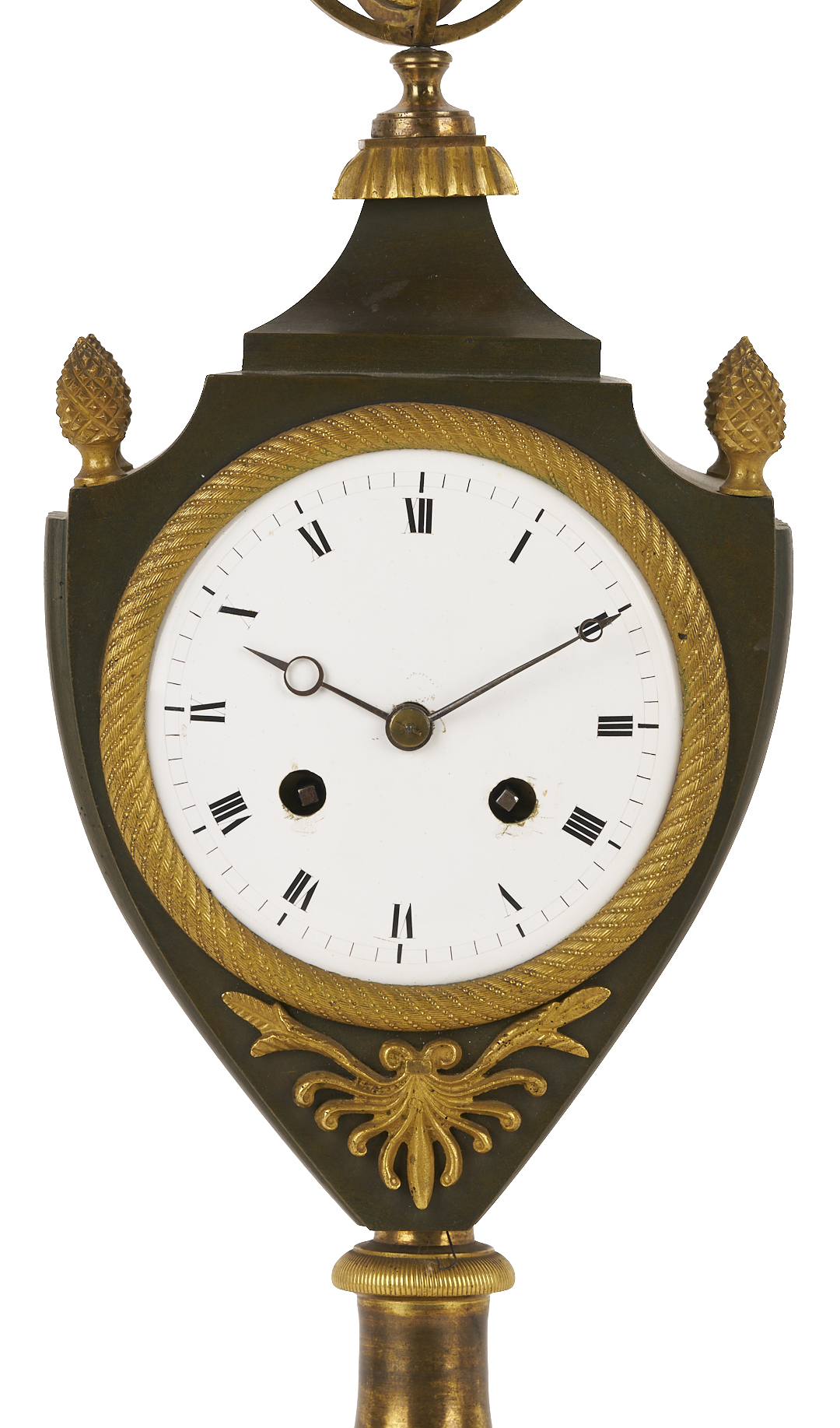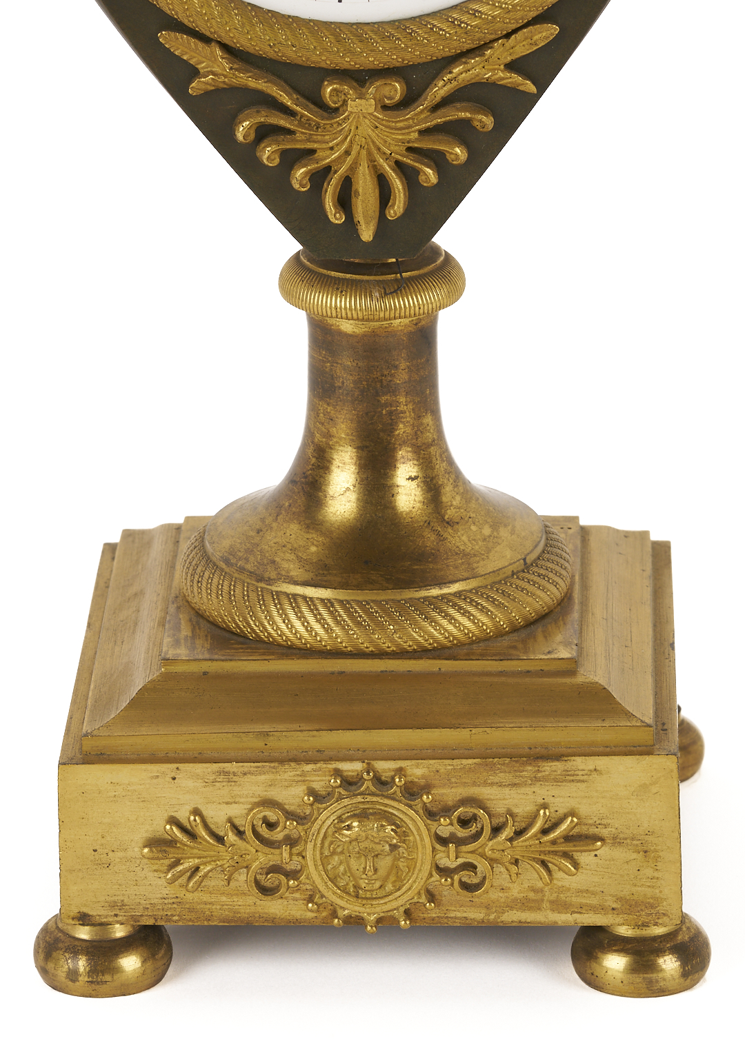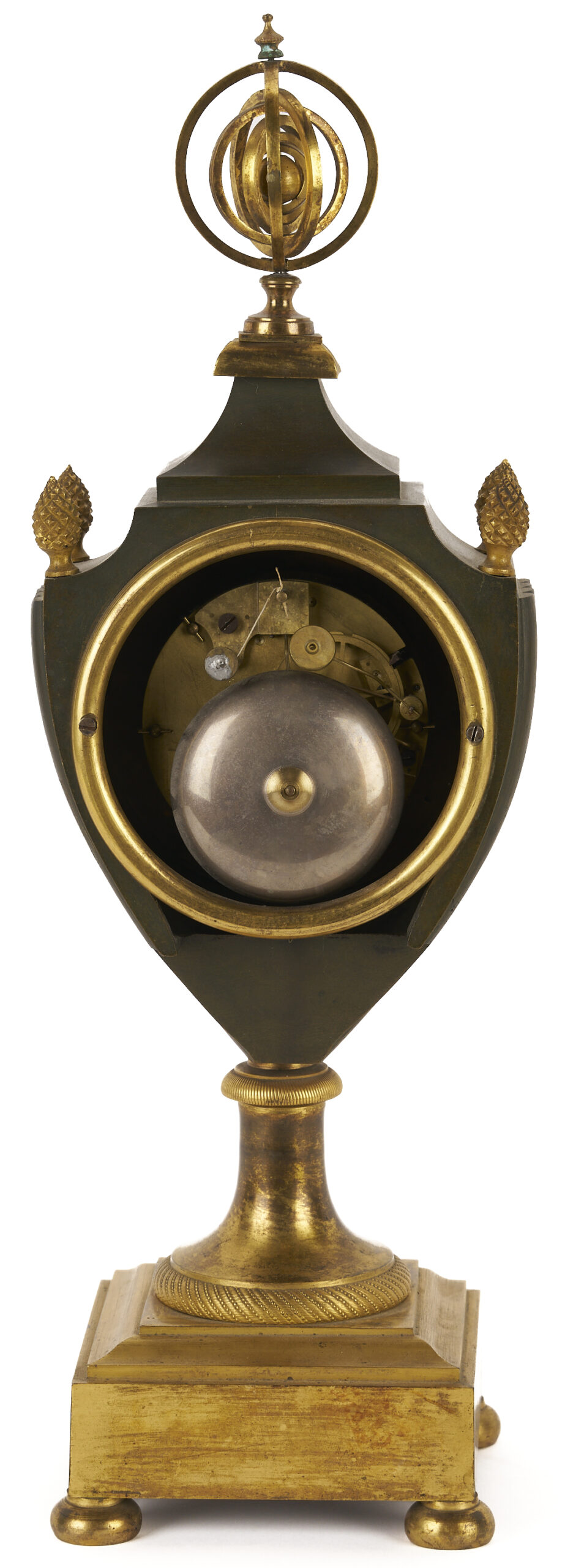 French Empire mantel clock, patinated bronze urn-form case mounted with gilt-bronze pineapple finials, a white enamel circular clock dial framed in gilt bronze, raised on a gilt-bronze square plinth with bun feet, surmounted by a gilt-bronze armillary sphere. Works marked “199 6”. 17 in. H x 5 3/4 in. W. 1st Qtr. 19th century.