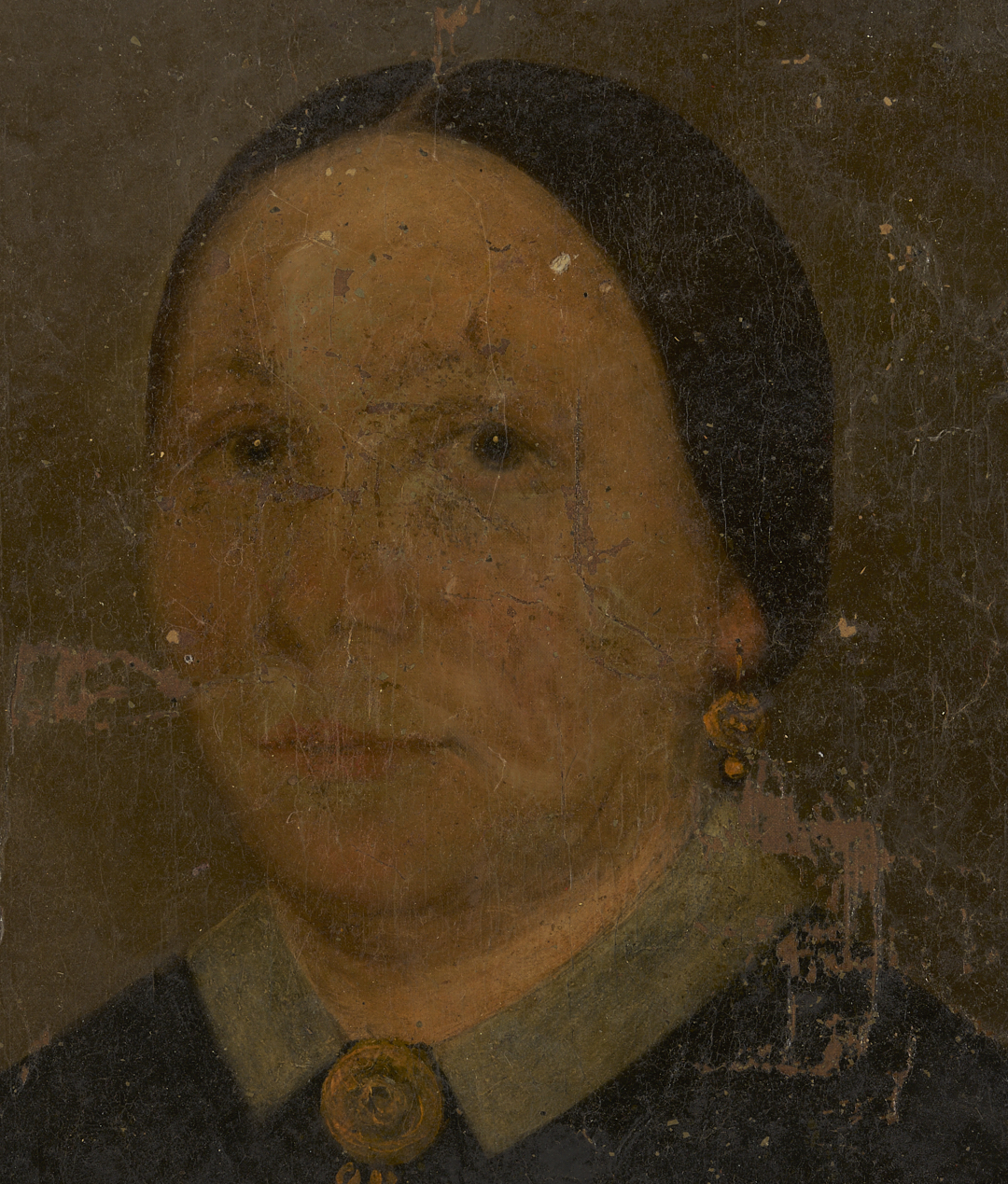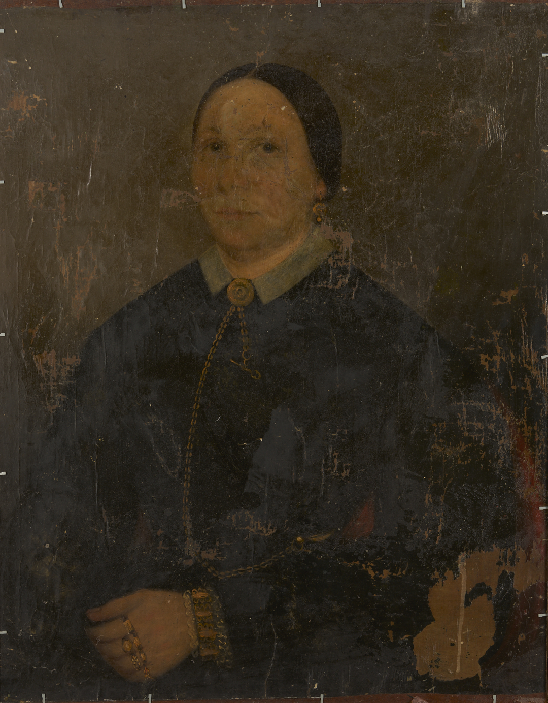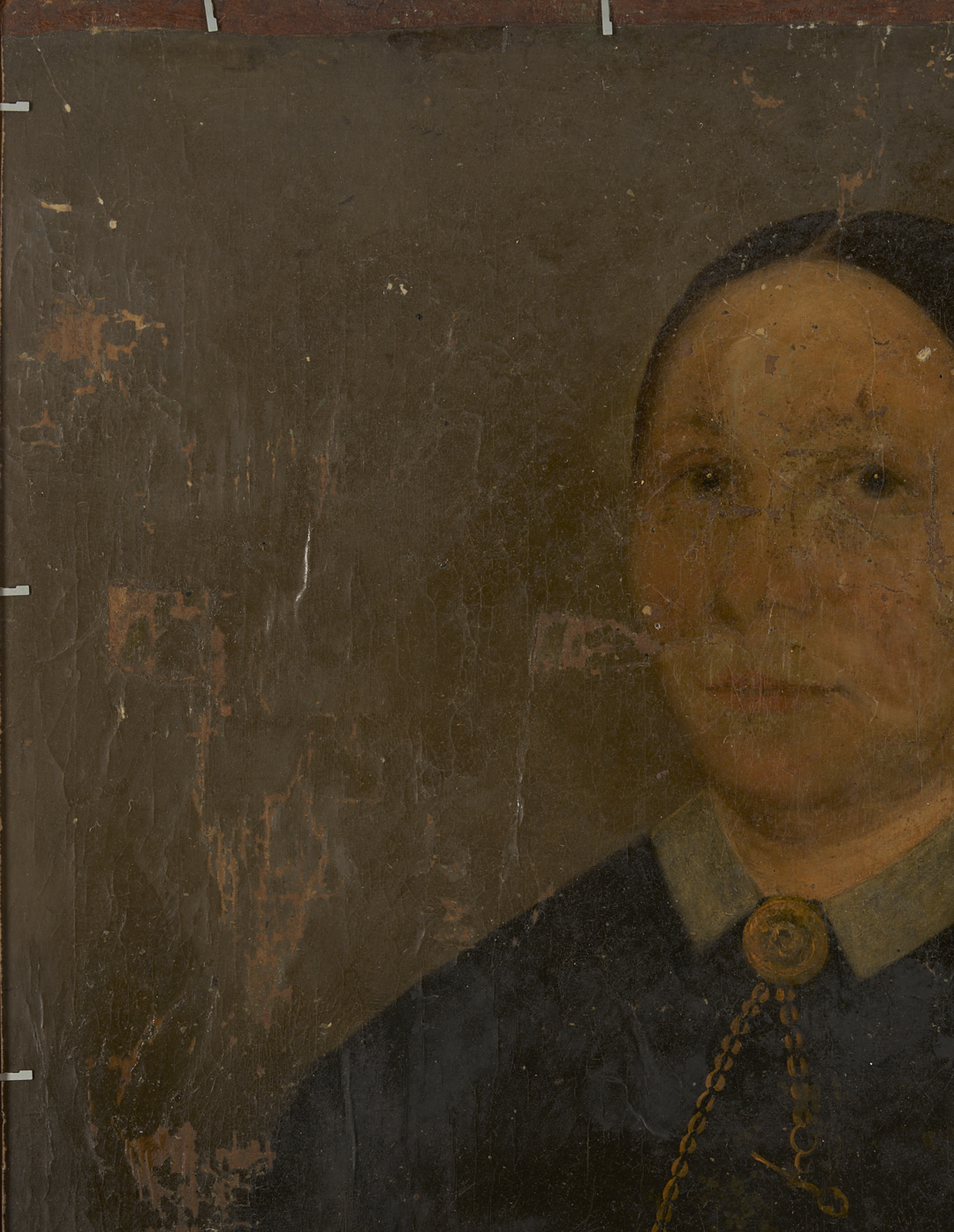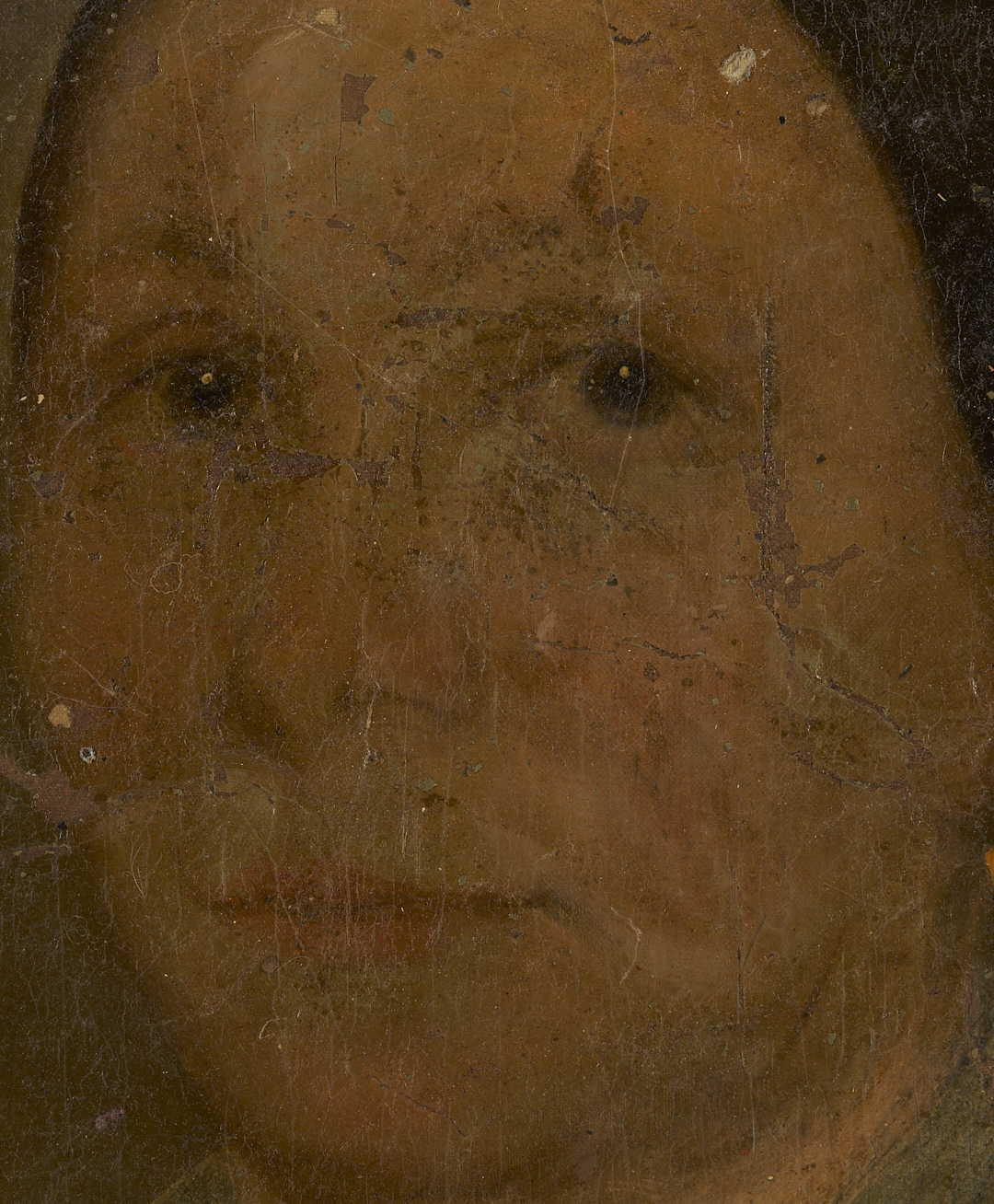 Side 1: In need of restoration. Canvas has been mounted to the board and exhibits significant delamination, flaking and losses. Side 2: Canvas mounted to board. Repaired square tear lower left corner and repaired tear to lower edge. Craquelure throughout. Repairs to upper right background, lower left sleeve area, and bonnet (refer to UV photos). 1/4 in flake to subject’s forehead.