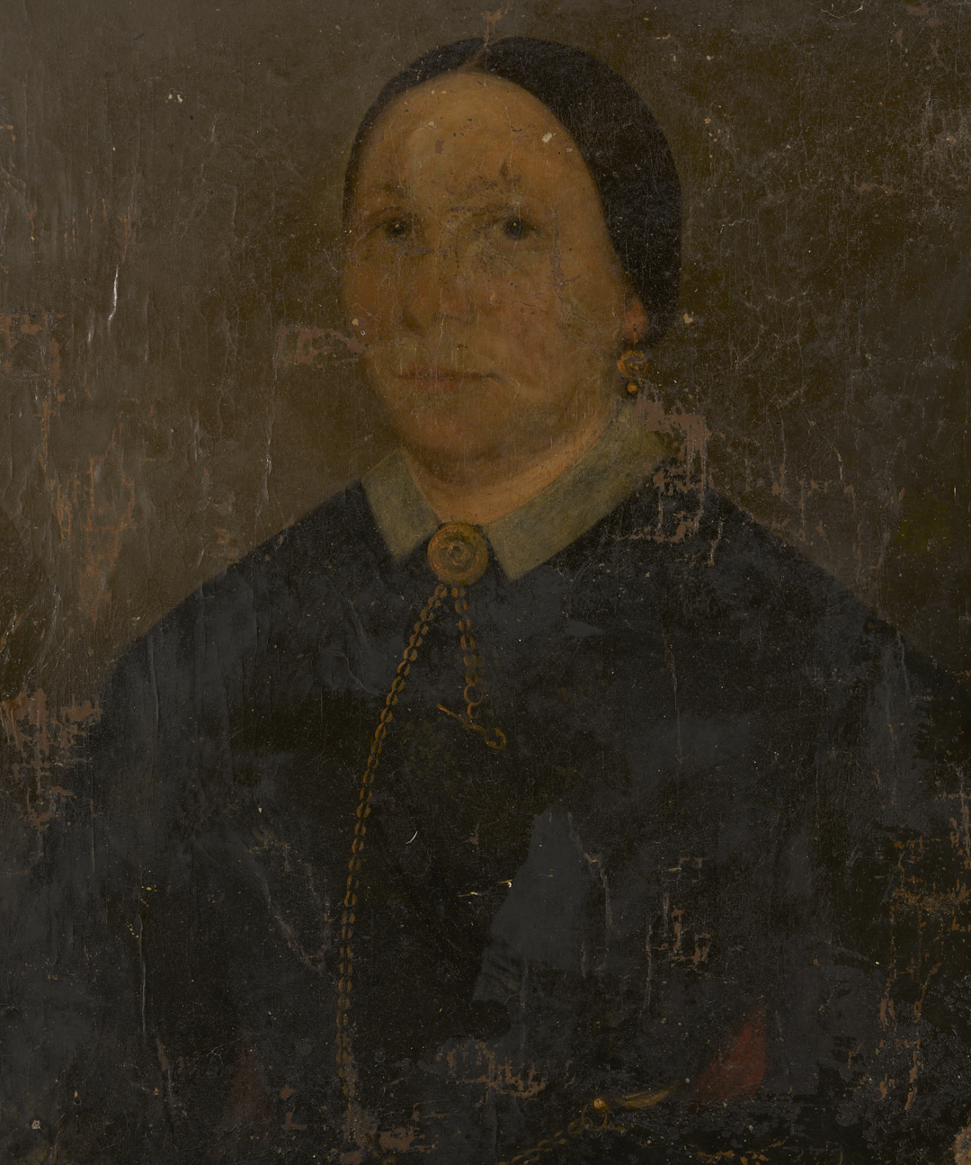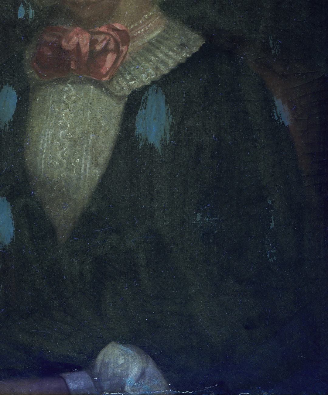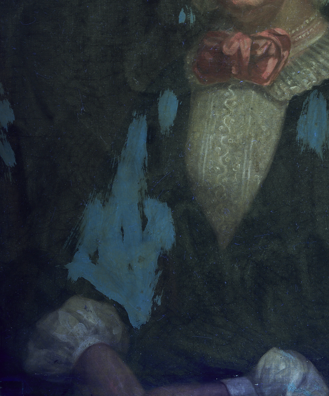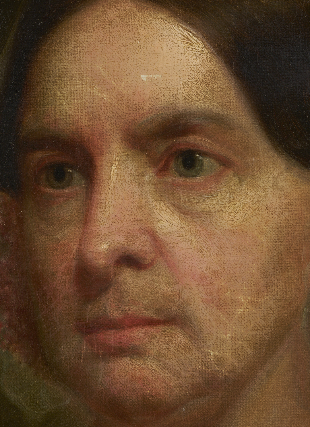 Side 1: In need of restoration. Canvas has been mounted to the board and exhibits significant delamination, flaking and losses. Side 2: Canvas mounted to board. Repaired square tear lower left corner and repaired tear to lower edge. Craquelure throughout. Repairs to upper right background, lower left sleeve area, and bonnet (refer to UV photos). 1/4 in flake to subject’s forehead.