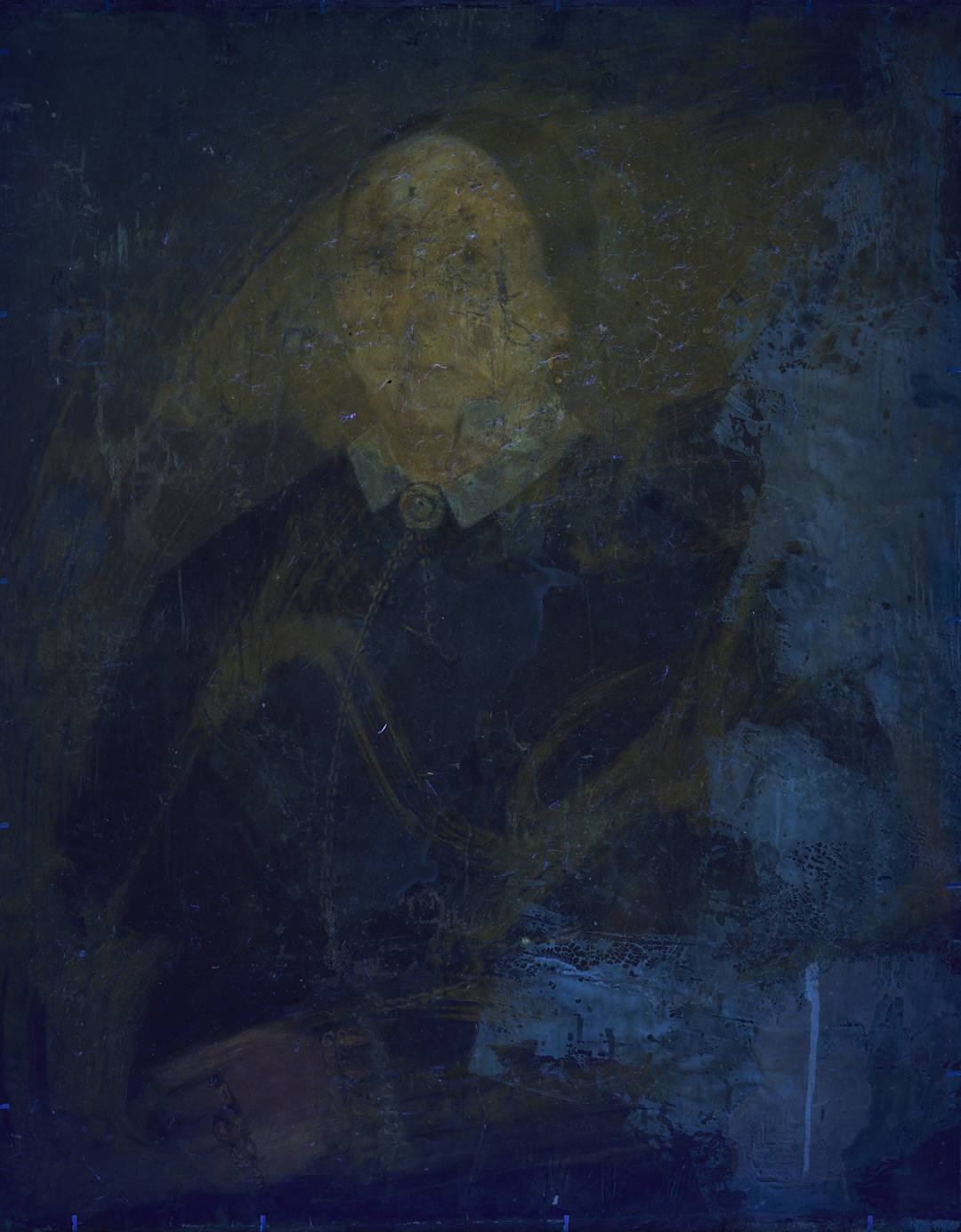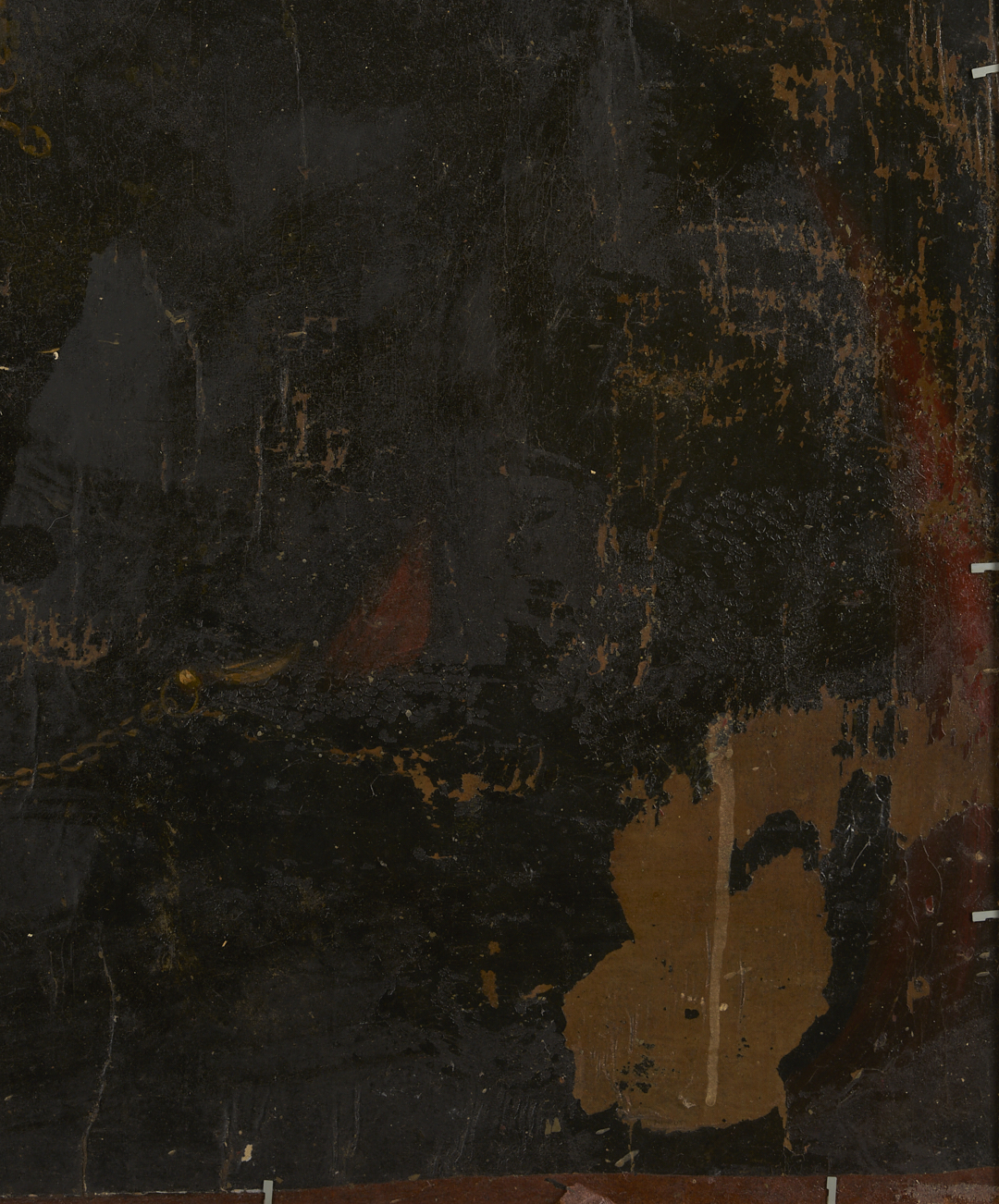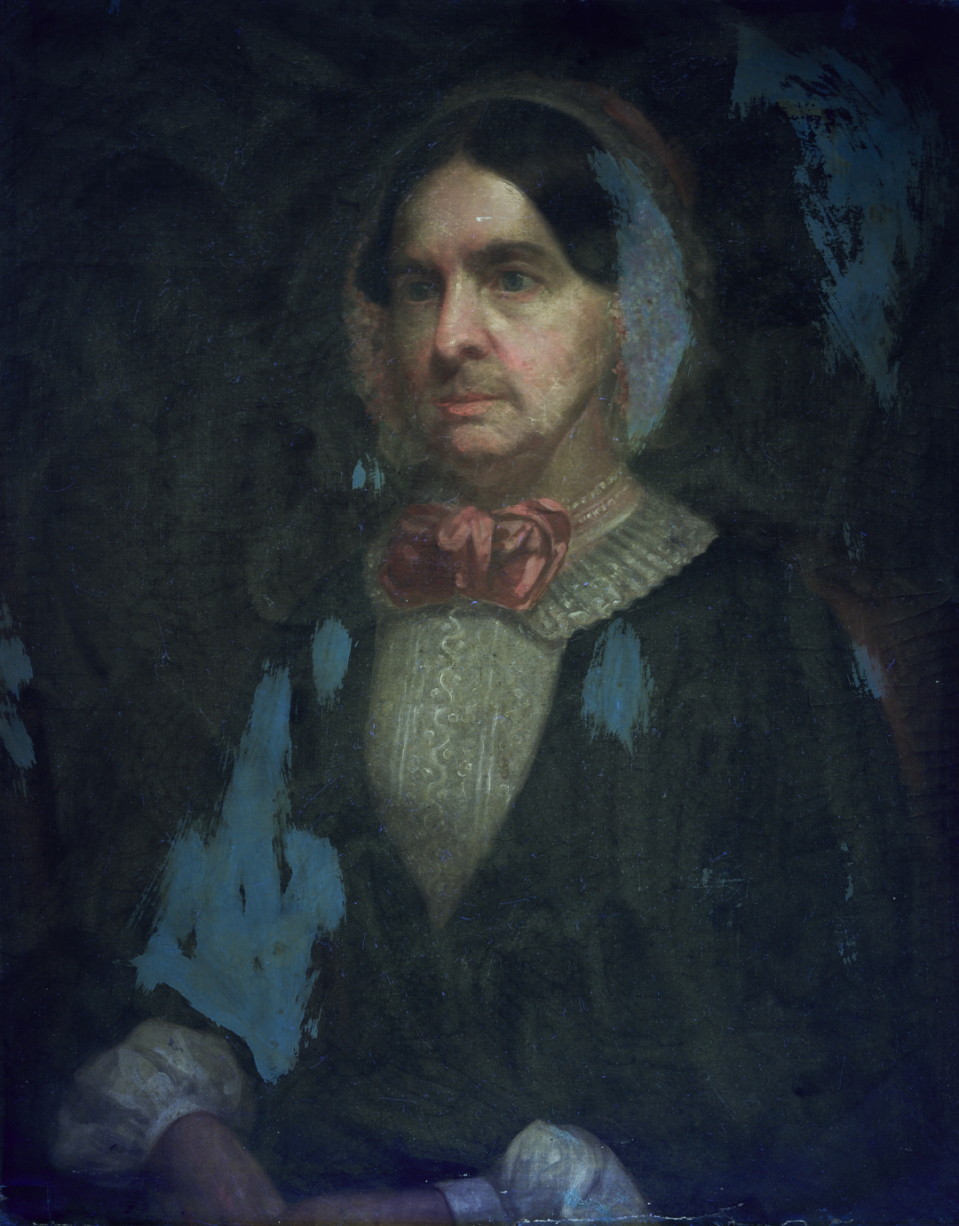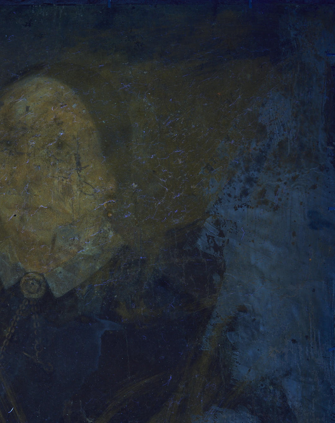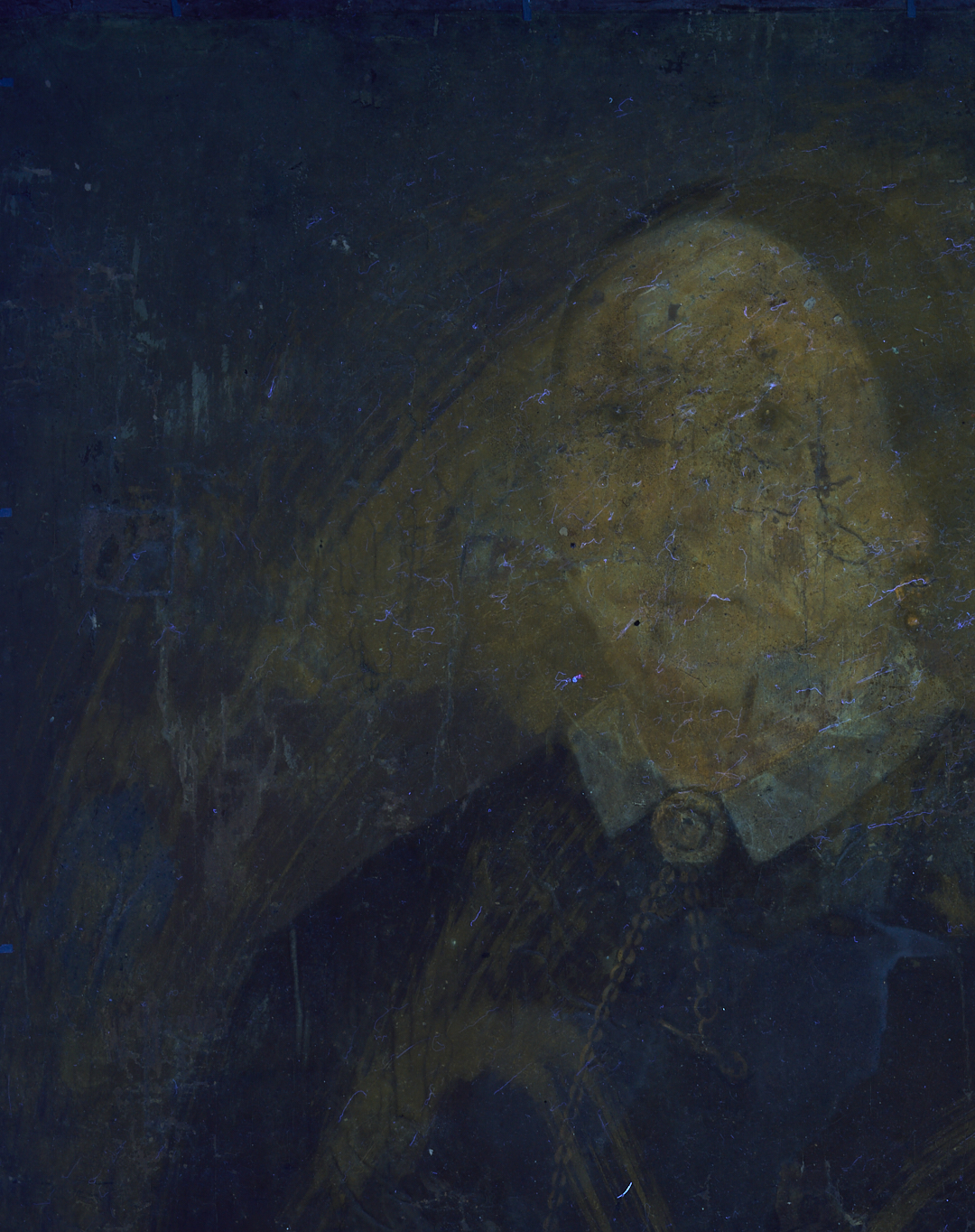 Side 1: In need of restoration. Canvas has been mounted to the board and exhibits significant delamination, flaking and losses. Side 2: Canvas mounted to board. Repaired square tear lower left corner and repaired tear to lower edge. Craquelure throughout. Repairs to upper right background, lower left sleeve area, and bonnet (refer to UV photos). 1/4 in flake to subject’s forehead.