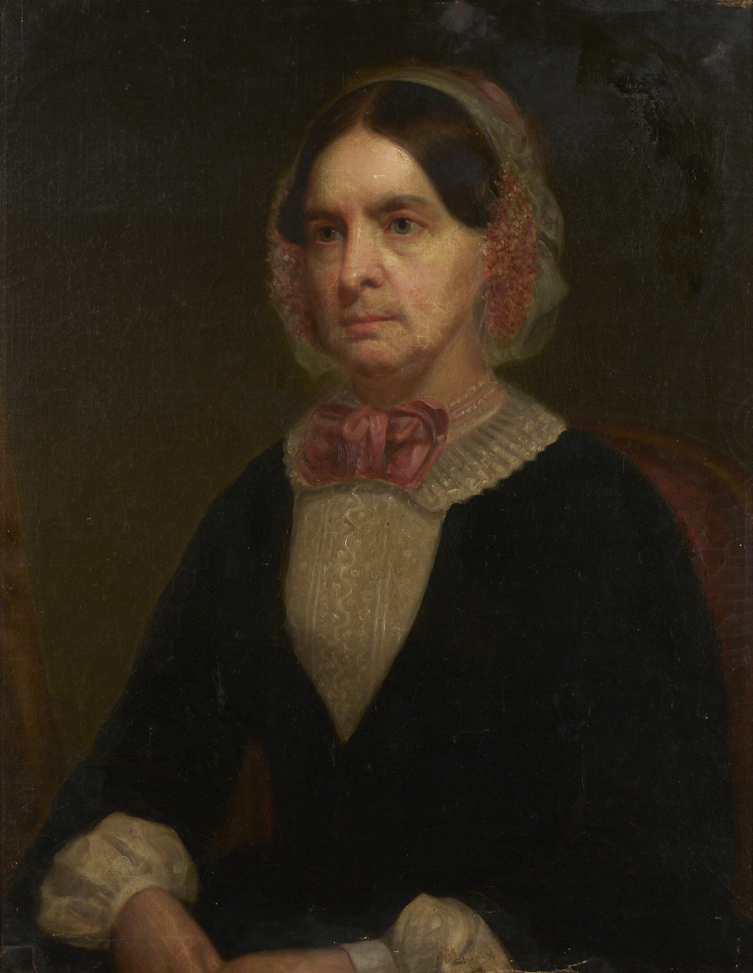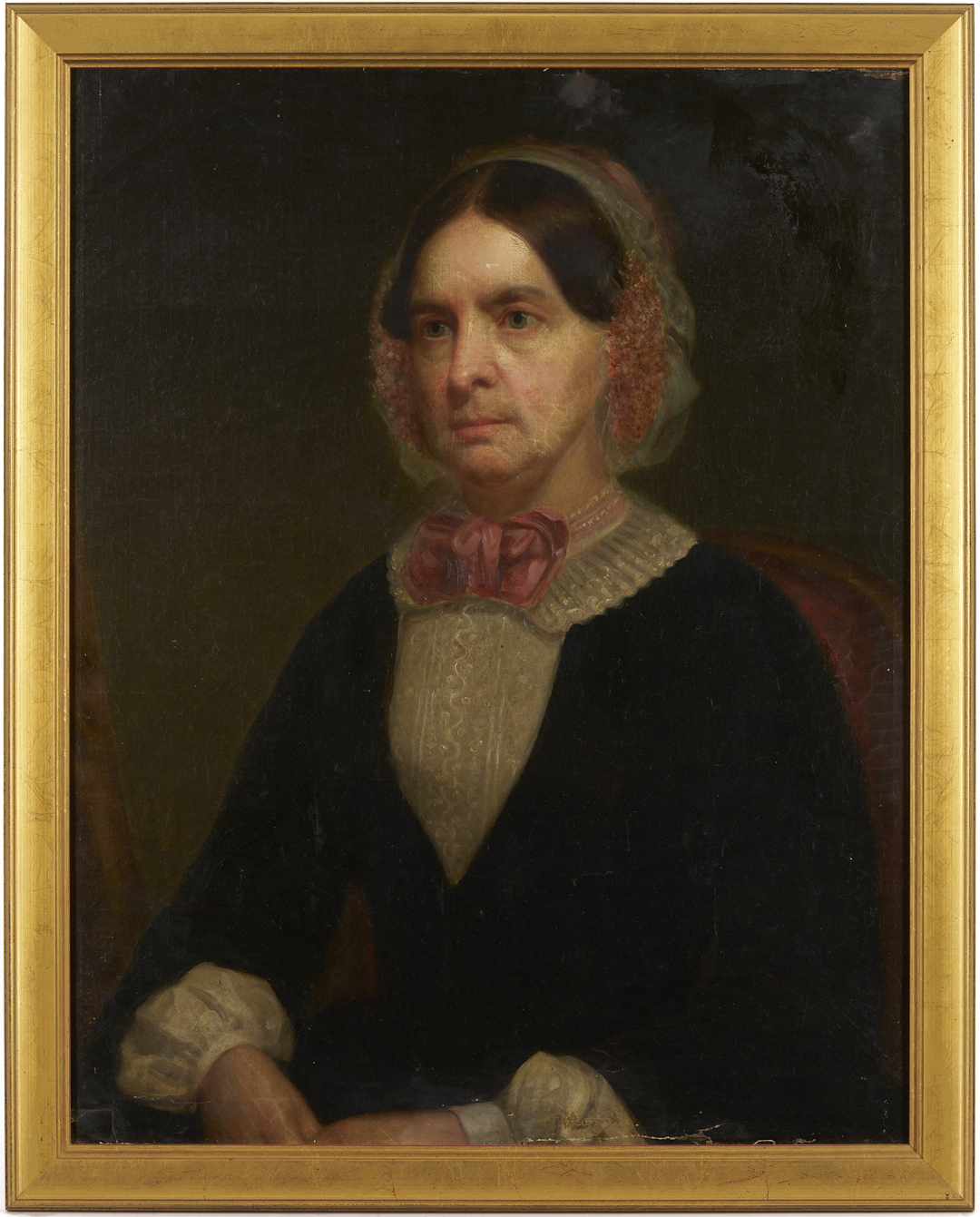 American School, 19th-century double-sided portrait. One side depicts a seated woman in circa 1830s black dress with ornate jewelry. Her black hair is pulled tightly back and she holds a gold chain, possibly a rosary chain, in her hand. The other side depicts a seated woman in circa 1850s or early 1860s dress with white collar and cuffs, pink bow at neck and bonnet. Molded later giltwood frame. Sight: 29 in. H x 23 in. W. Frame: 33 in. H x 26 1/2 in. W.