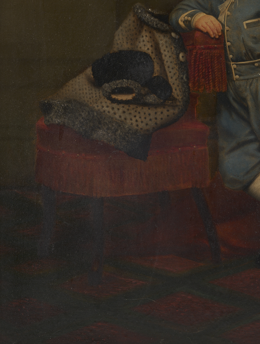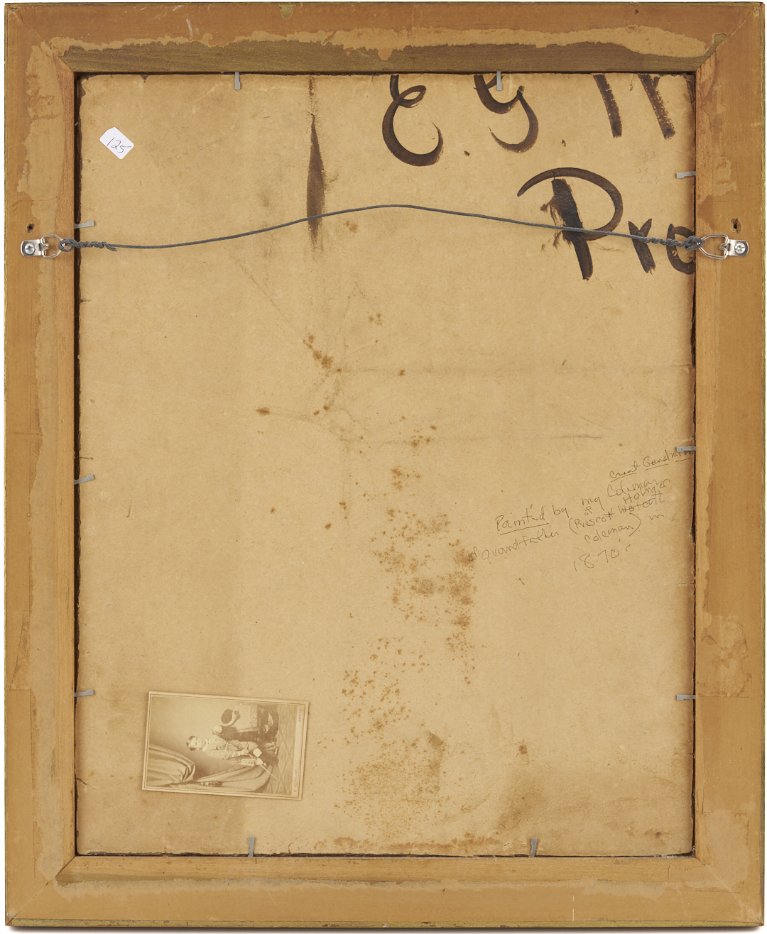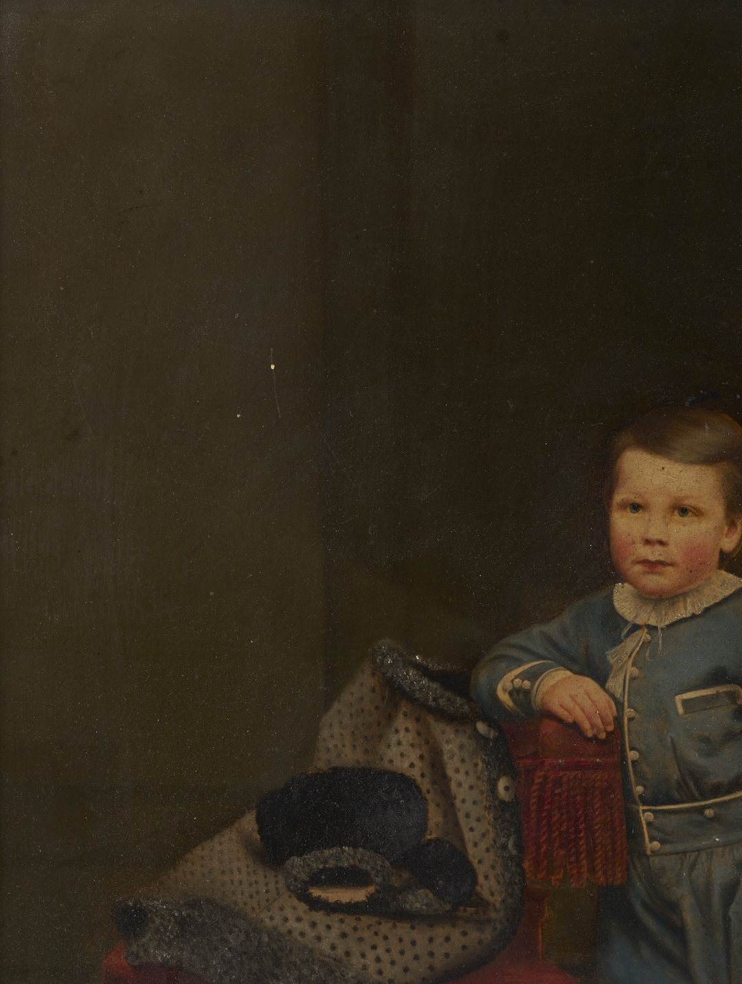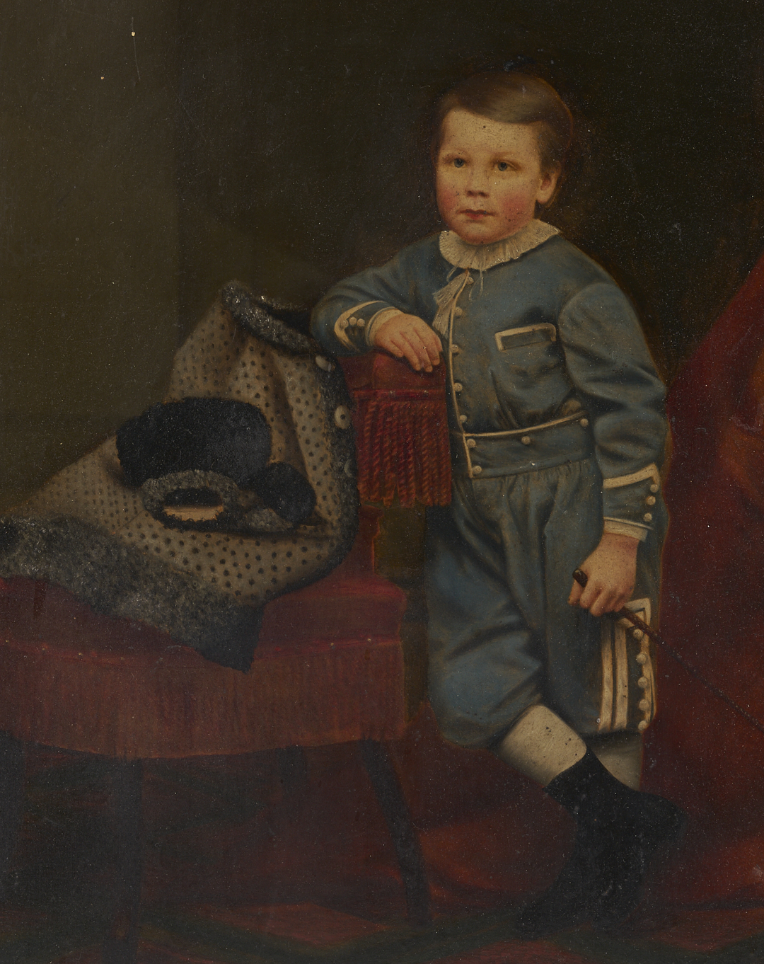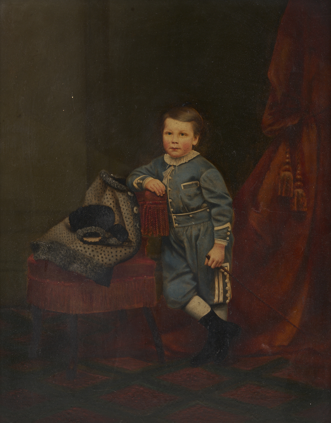American 19th c. oil on board portrait of a child, identified en verso as Prescot Holmes Coleman, standing and wearing a blue suit and holding a riding crop. He leans against a red velvet fringed chair before a red velvet drape. Attached en verso is a CDV of the same image by photographer P.T. Sharp, and an written inscription: “Painted by my great grandmother Coleman of my grandfather Prescot Holmes Coleman in 1870s”. Sight: 19 in. H x 15 in. W. Parcel gilt and ebonized frame: 23 in. H x 19 in. W. Note: Prescott Holmes Coleman (1864-1947) was born in Providence, Rhode Island to John Addison Coleman and Ellen Clarissa Holmes Coleman, to whom this painting is attributed. Philip Thomas Sharp was a photographer and lithographer. It is possible that this portrait was made by the subject’s mother from oil paints over a lithograph or larger photographic image.
