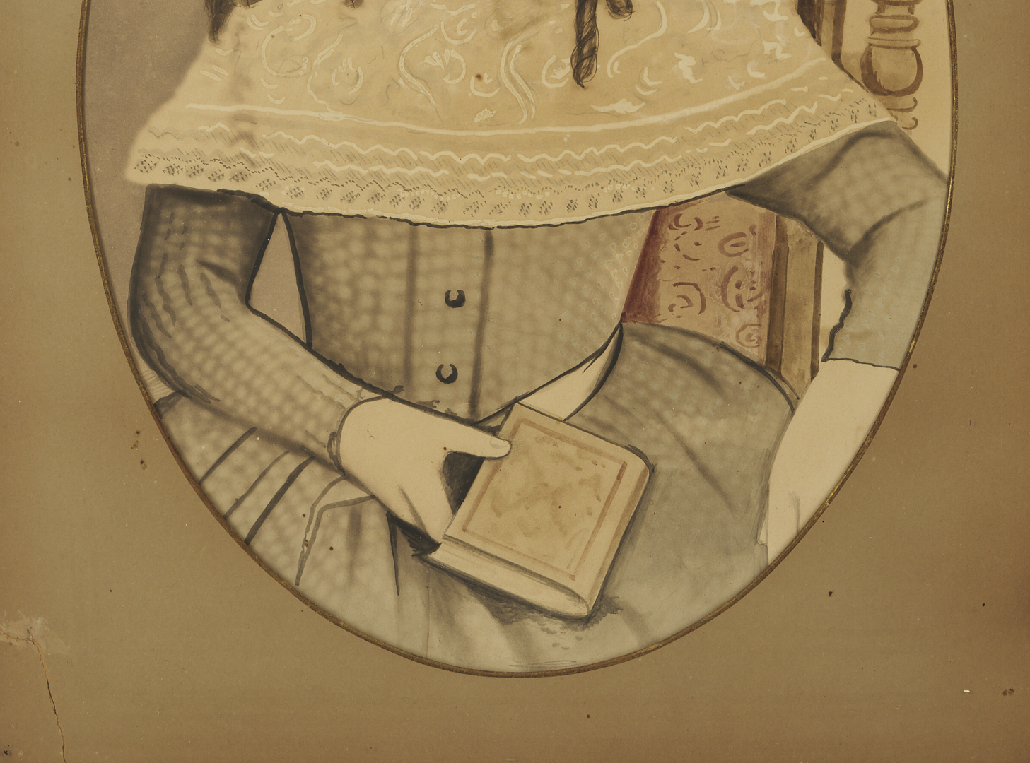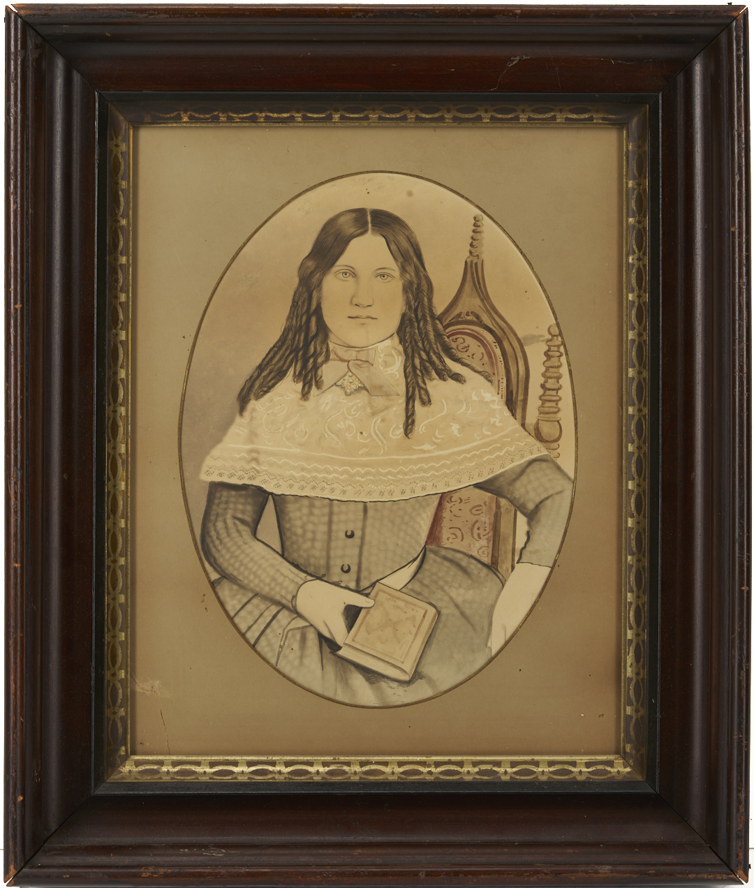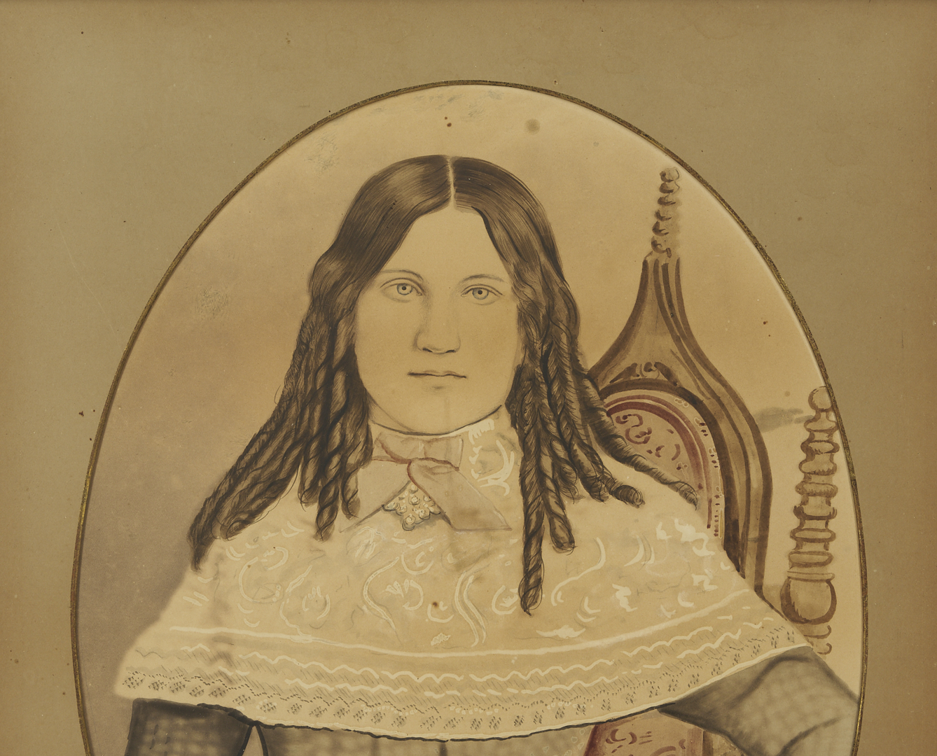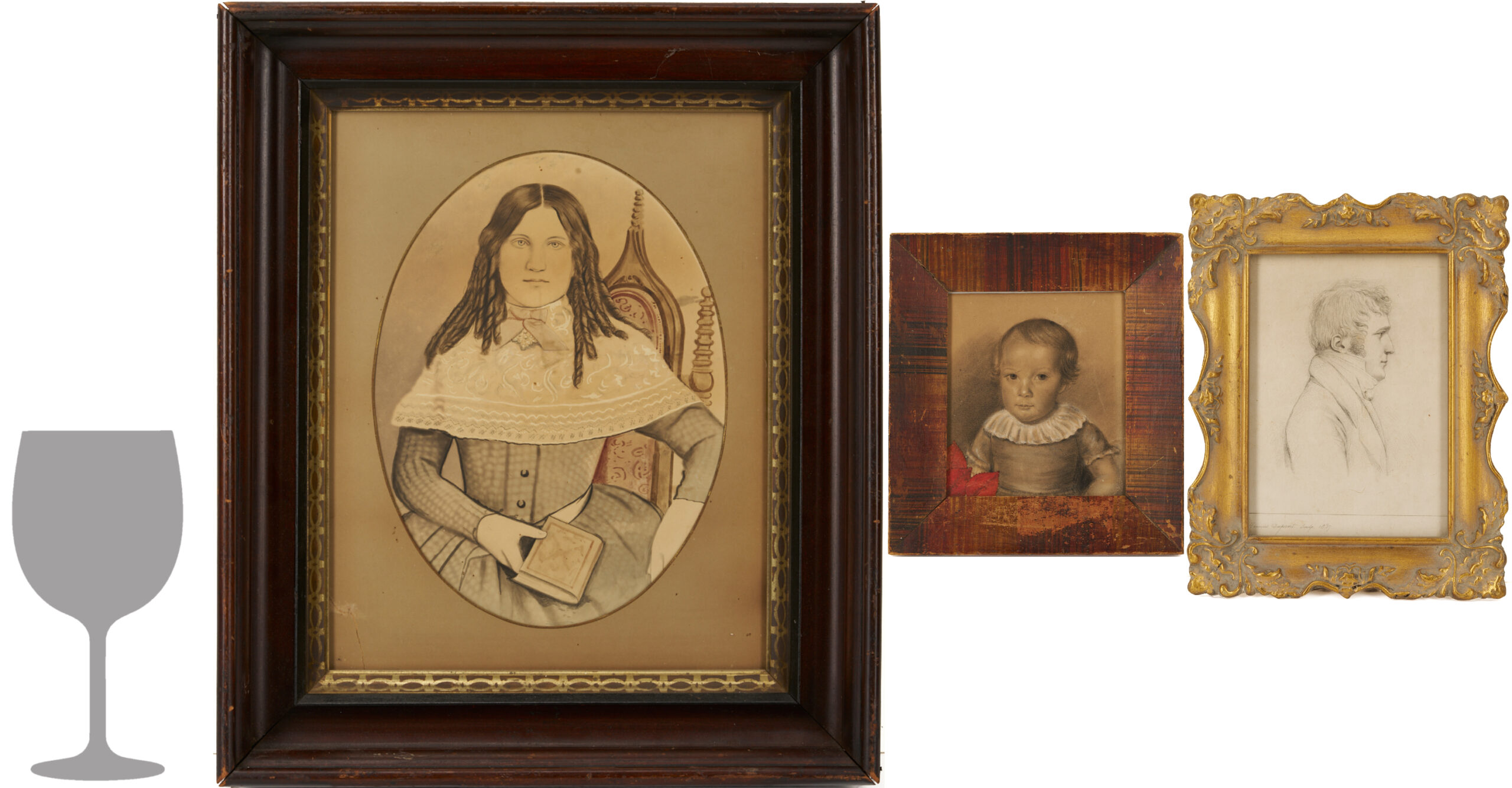 Two portraits on paper, possibly Southern, and an engraved French portrait. 1st item: American school, possibly Southern, mid 19th century charcoal and white chalk half-length portrait of a young boy with a white collar. Old paper fragment affixed to verso (possibly from a newspaper masthead) reads: “[Ma]rch 13, 1844.” With three red leaves tucked behind glazing at lower left. Housed under glass in a stained wood frame. Sight: 4 3/4 in. H x 4 1/4 in. W. Framed: 7 3/4 in. H x 7 in. W. 2nd item: American school, possibly Southern, 19th c. watercolor on paper three-quarter length oval portrait of a woman in a lace pelerine, second half of 19th c. She wears her brown hair in ringlets and sits in a Gothic revival chair. A book held in her right hand rests in her lap. Housed under glass in a stained and painted wood frame with parcel gilt patterning and mat with gilt sight edge. Sight: 11 1/2 in. H x 8 1/2 in. W. Framed: 18 1/2 in. H x 15 3/4 in. W. 3rd item: Louis Pierre Henriquel-Dupont (French, 1797-1892) stipple engraving profile portrait of Antoine-Philippe d’Orleans, Duke of Montpensier, 1837. From MEMOIRS OF THE DUKE OF MONTPENSIER (Paris: Imprimerie Royale, 1837). Housed under glass in a molded giltwood frame. Sight: 6 1/2 in. H x 4 1/2 in. W. Framed: 9 1/2 in. H x 7 1/2 in. W.