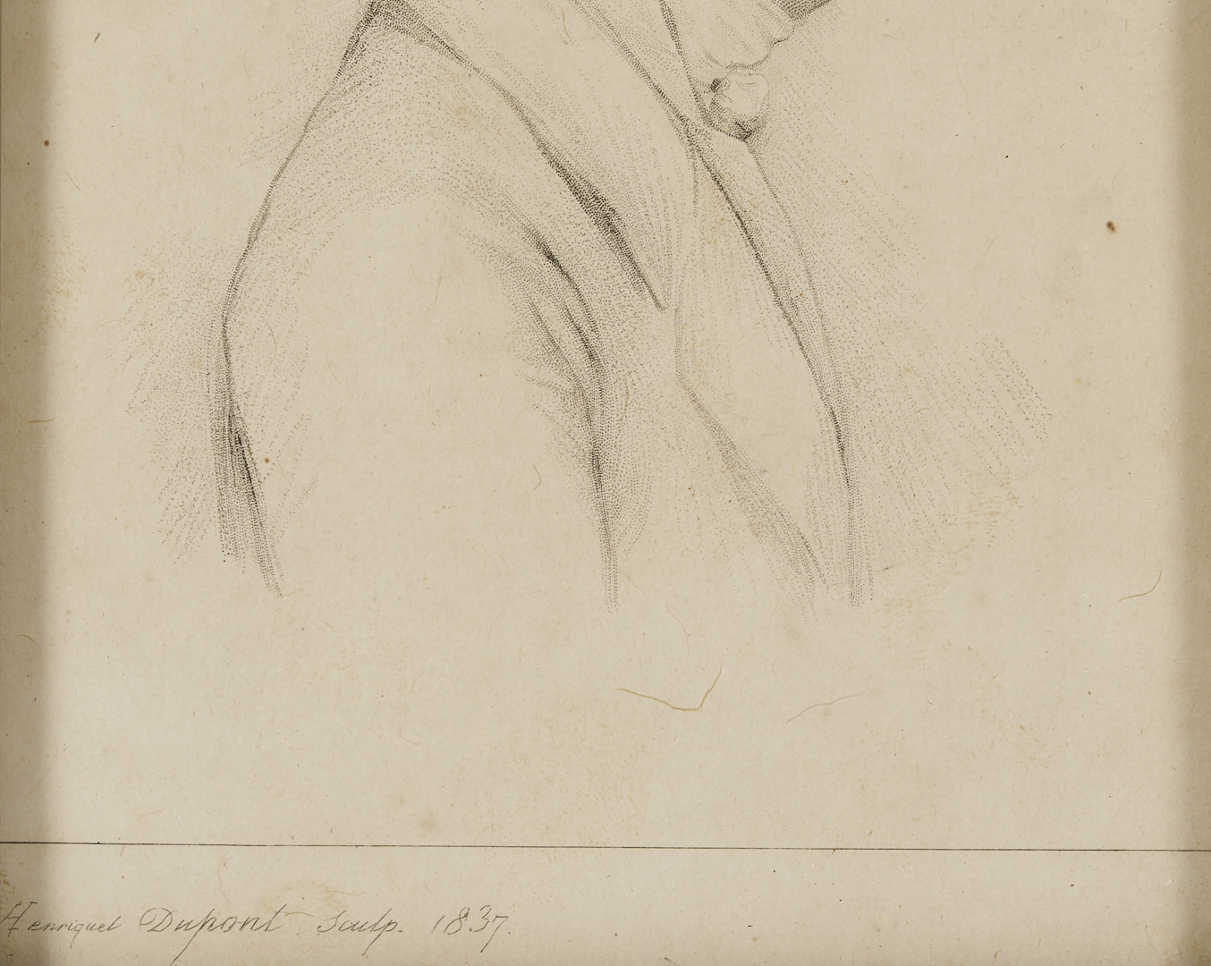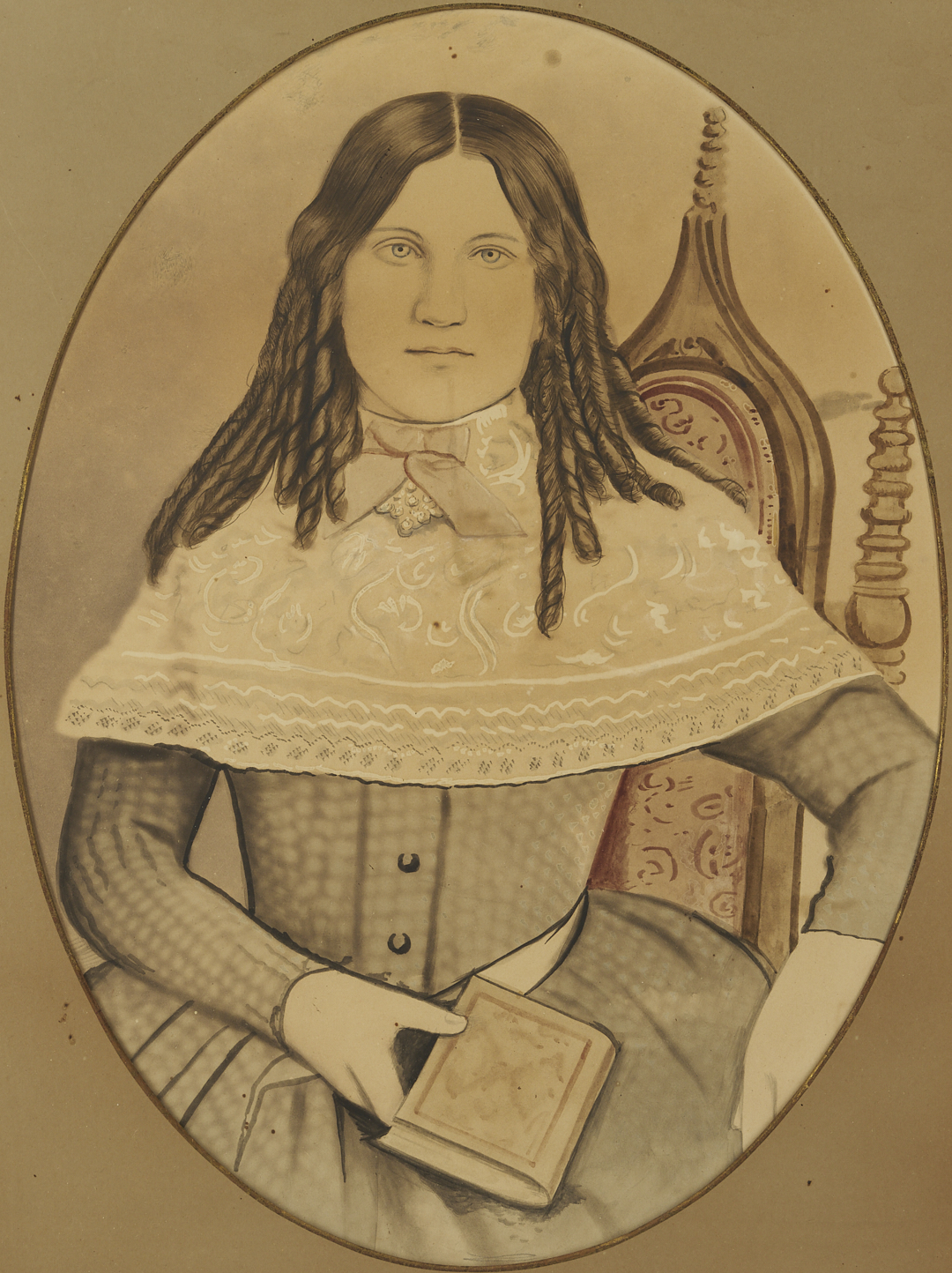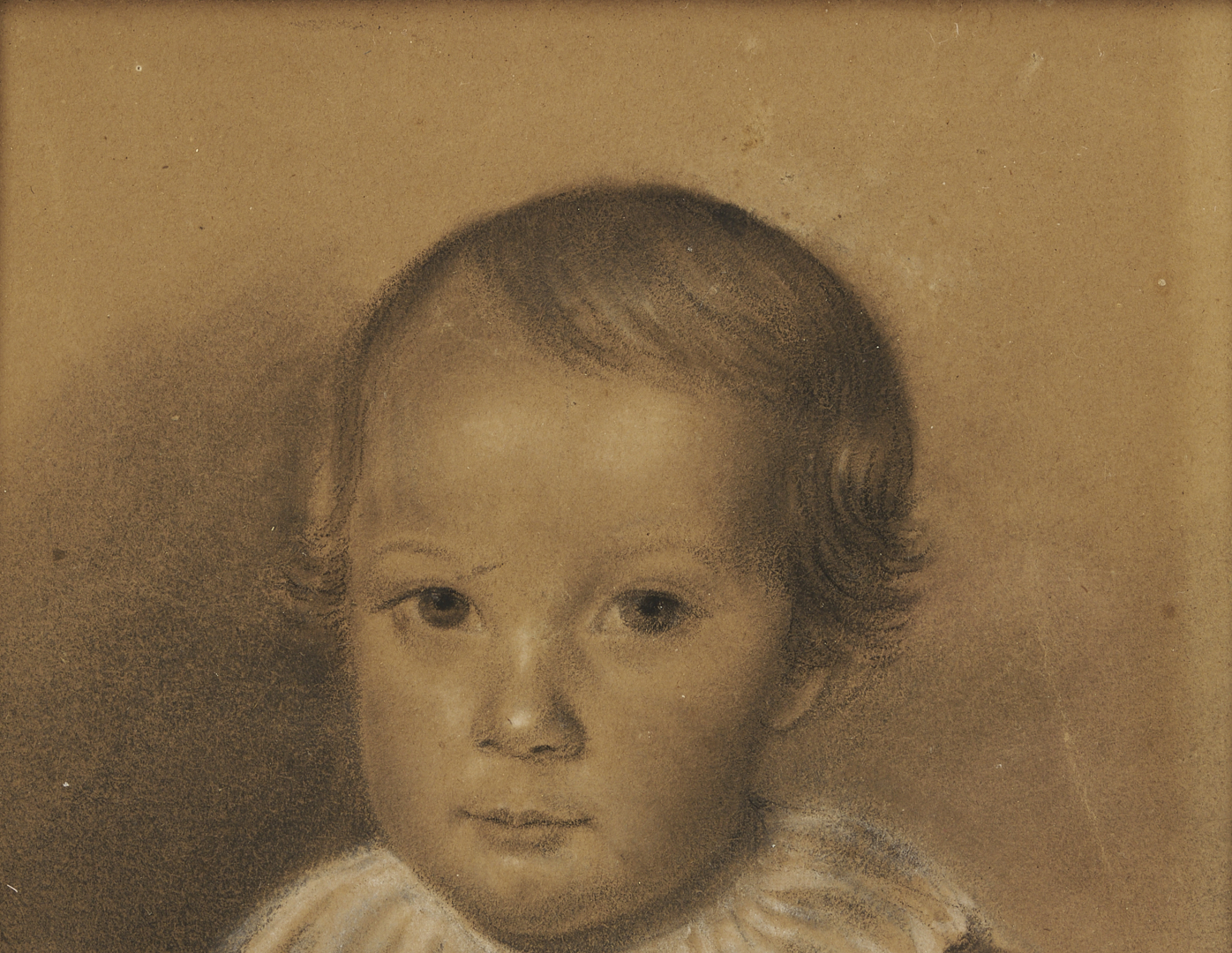 Two portraits on paper, possibly Southern, and an engraved French portrait. 1st item: American school, possibly Southern, mid 19th century charcoal and white chalk half-length portrait of a young boy with a white collar. Old paper fragment affixed to verso (possibly from a newspaper masthead) reads: “[Ma]rch 13, 1844.” With three red leaves tucked behind glazing at lower left. Housed under glass in a stained wood frame. Sight: 4 3/4 in. H x 4 1/4 in. W. Framed: 7 3/4 in. H x 7 in. W. 2nd item: American school, possibly Southern, 19th c. watercolor on paper three-quarter length oval portrait of a woman in a lace pelerine, second half of 19th c. She wears her brown hair in ringlets and sits in a Gothic revival chair. A book held in her right hand rests in her lap. Housed under glass in a stained and painted wood frame with parcel gilt patterning and mat with gilt sight edge. Sight: 11 1/2 in. H x 8 1/2 in. W. Framed: 18 1/2 in. H x 15 3/4 in. W. 3rd item: Louis Pierre Henriquel-Dupont (French, 1797-1892) stipple engraving profile portrait of Antoine-Philippe d’Orleans, Duke of Montpensier, 1837. From MEMOIRS OF THE DUKE OF MONTPENSIER (Paris: Imprimerie Royale, 1837). Housed under glass in a molded giltwood frame. Sight: 6 1/2 in. H x 4 1/2 in. W. Framed: 9 1/2 in. H x 7 1/2 in. W.
