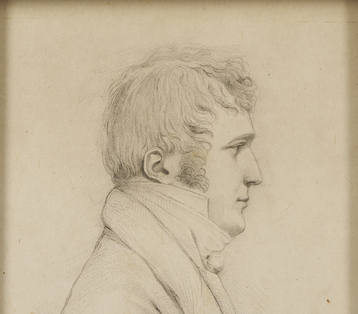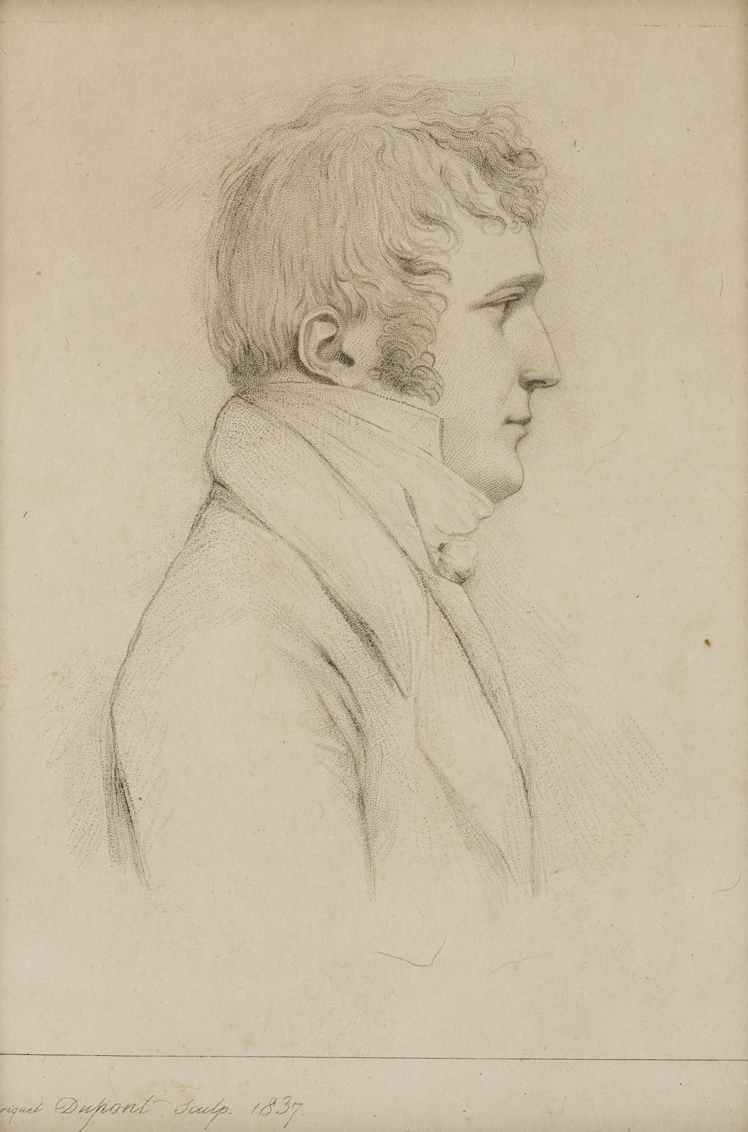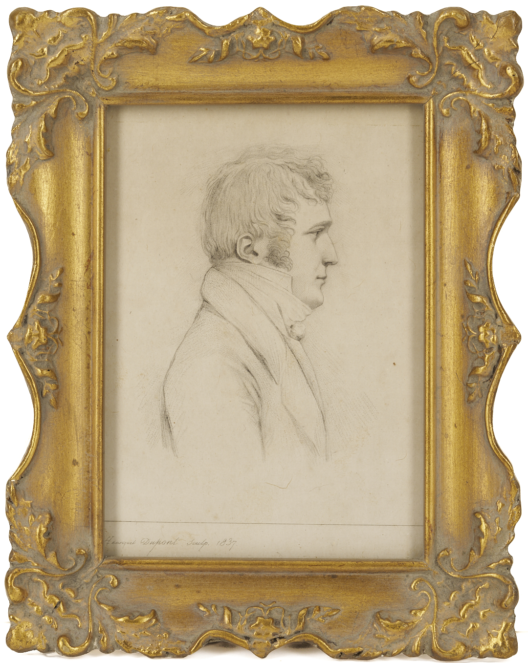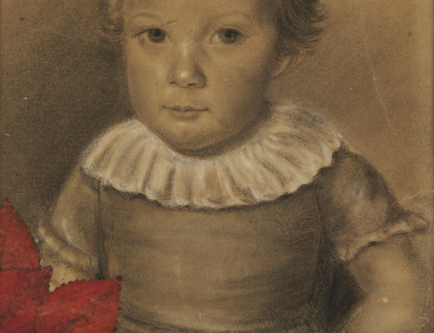 Two portraits on paper, possibly Southern, and an engraved French portrait. 1st item: American school, possibly Southern, mid 19th century charcoal and white chalk half-length portrait of a young boy with a white collar. Old paper fragment affixed to verso (possibly from a newspaper masthead) reads: “[Ma]rch 13, 1844.” With three red leaves tucked behind glazing at lower left. Housed under glass in a stained wood frame. Sight: 4 3/4 in. H x 4 1/4 in. W. Framed: 7 3/4 in. H x 7 in. W. 2nd item: American school, possibly Southern, 19th c. watercolor on paper three-quarter length oval portrait of a woman in a lace pelerine, second half of 19th c. She wears her brown hair in ringlets and sits in a Gothic revival chair. A book held in her right hand rests in her lap. Housed under glass in a stained and painted wood frame with parcel gilt patterning and mat with gilt sight edge. Sight: 11 1/2 in. H x 8 1/2 in. W. Framed: 18 1/2 in. H x 15 3/4 in. W. 3rd item: Louis Pierre Henriquel-Dupont (French, 1797-1892) stipple engraving profile portrait of Antoine-Philippe d’Orleans, Duke of Montpensier, 1837. From MEMOIRS OF THE DUKE OF MONTPENSIER (Paris: Imprimerie Royale, 1837). Housed under glass in a molded giltwood frame. Sight: 6 1/2 in. H x 4 1/2 in. W. Framed: 9 1/2 in. H x 7 1/2 in. W.