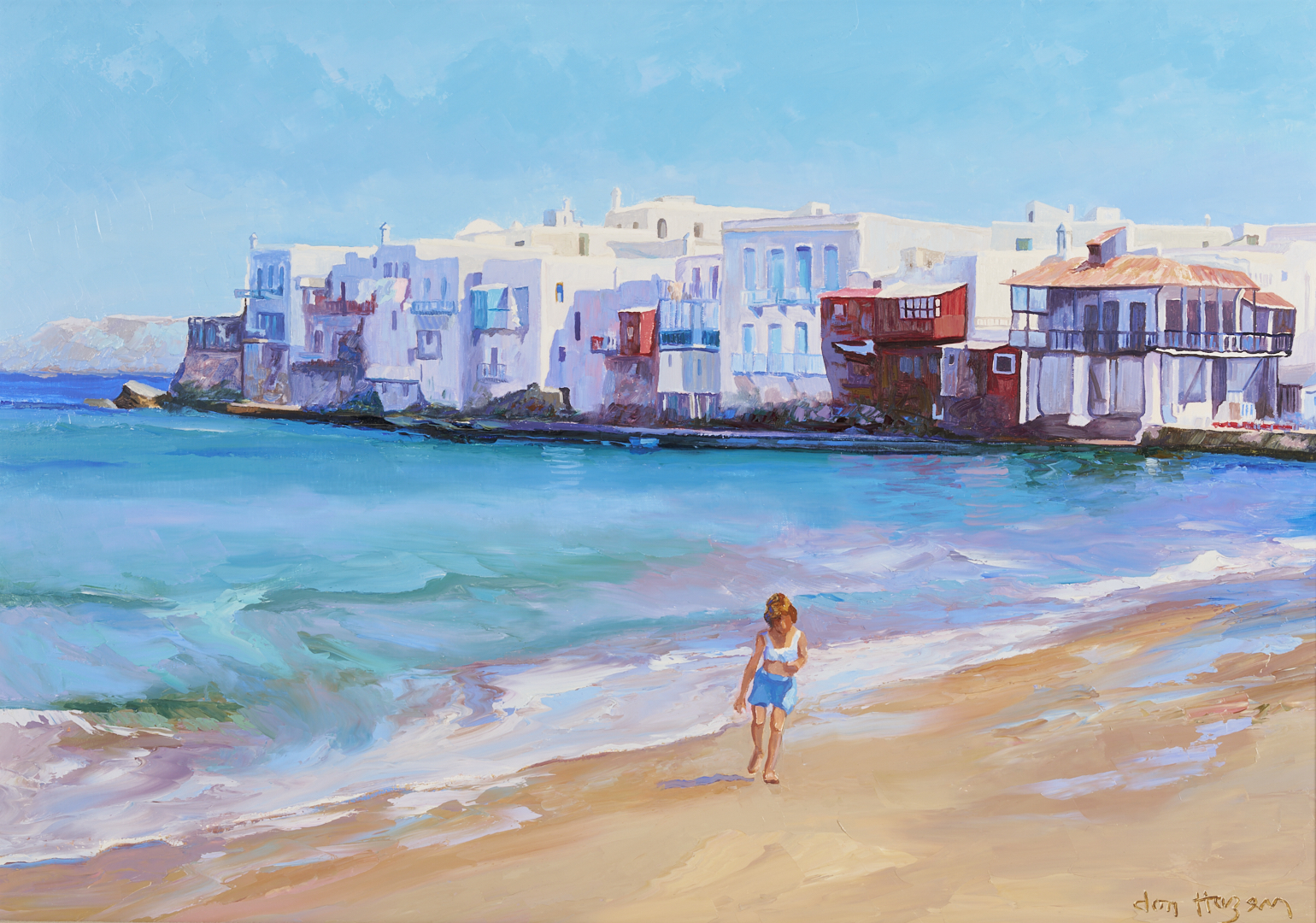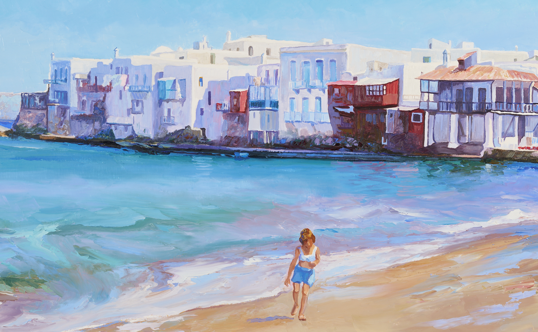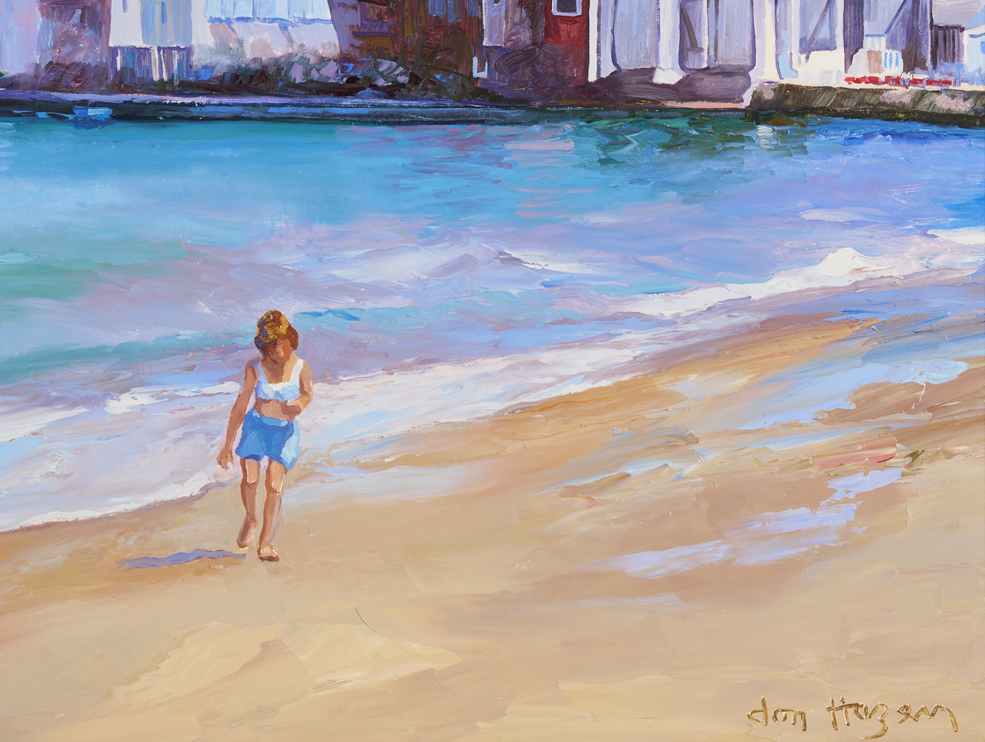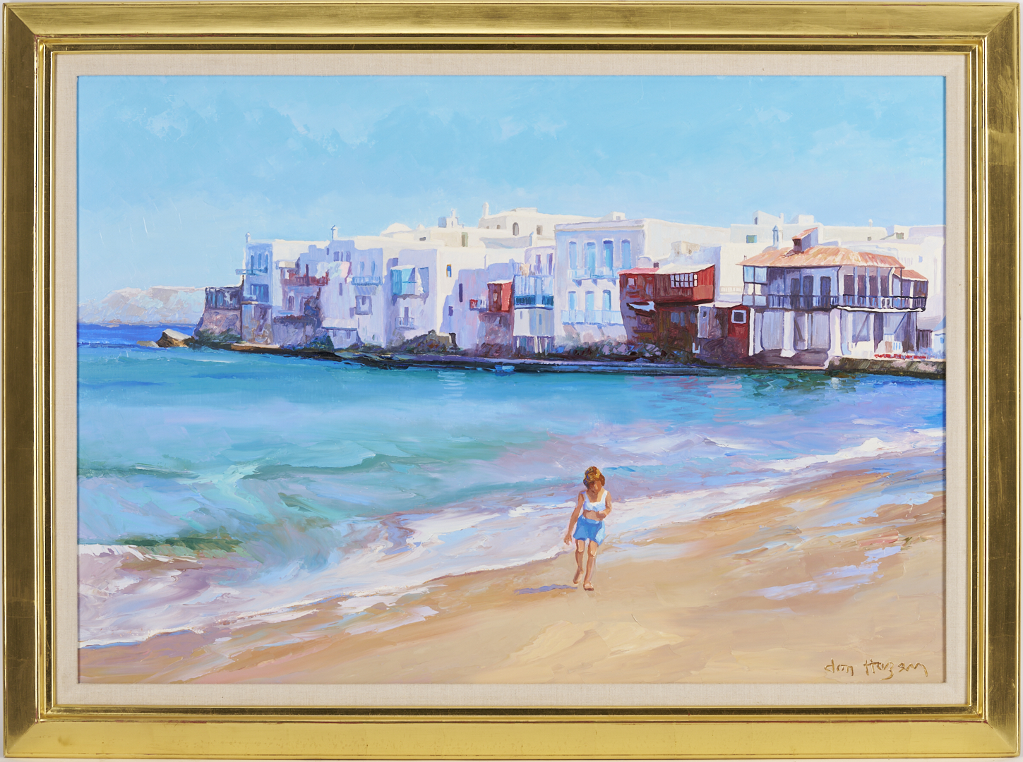 Large Don Hazen (Tennessee/Florida/Spain, b. 1933) colorful oil on canvas beach scene depicting a young girl playing on the beach with a dense row of houses visible in the background. Signed lower right. With Wally Findlay Galleries, Chicago label affixed to backing. Housed in an angled gilt wood frame with linen liner. Sight: 24 5/8 in. H x 35 1/4 in. W. Frame: 30 3/4 in. H x 41 3/4 in. W. Biographical Note: Don Hazen was born in Johnson City, Tennessee. He attended East Tennessee State University and served in the Army in Japan and Korea before meeting and studying wtih mural painter Dan Chapin in Denver. He then moved to Florida where he took classes at the Orlando Institute of Art and studied with portrait painter Robert Anderson. He went to Europe in the 1960s and eventually settled in Spain, where he married and began painting from nature. He was represented in the U.S. by Wally Findlay Galleries starting in 1974.