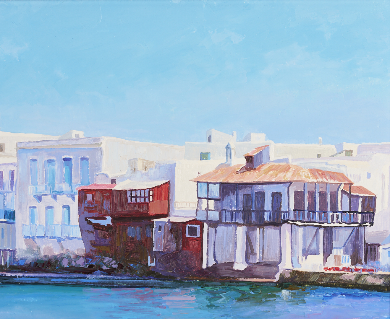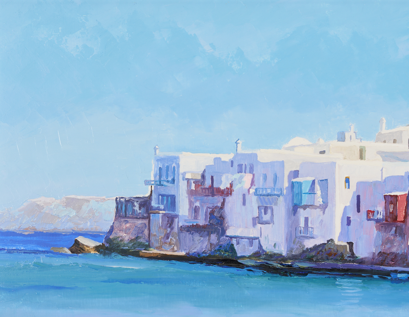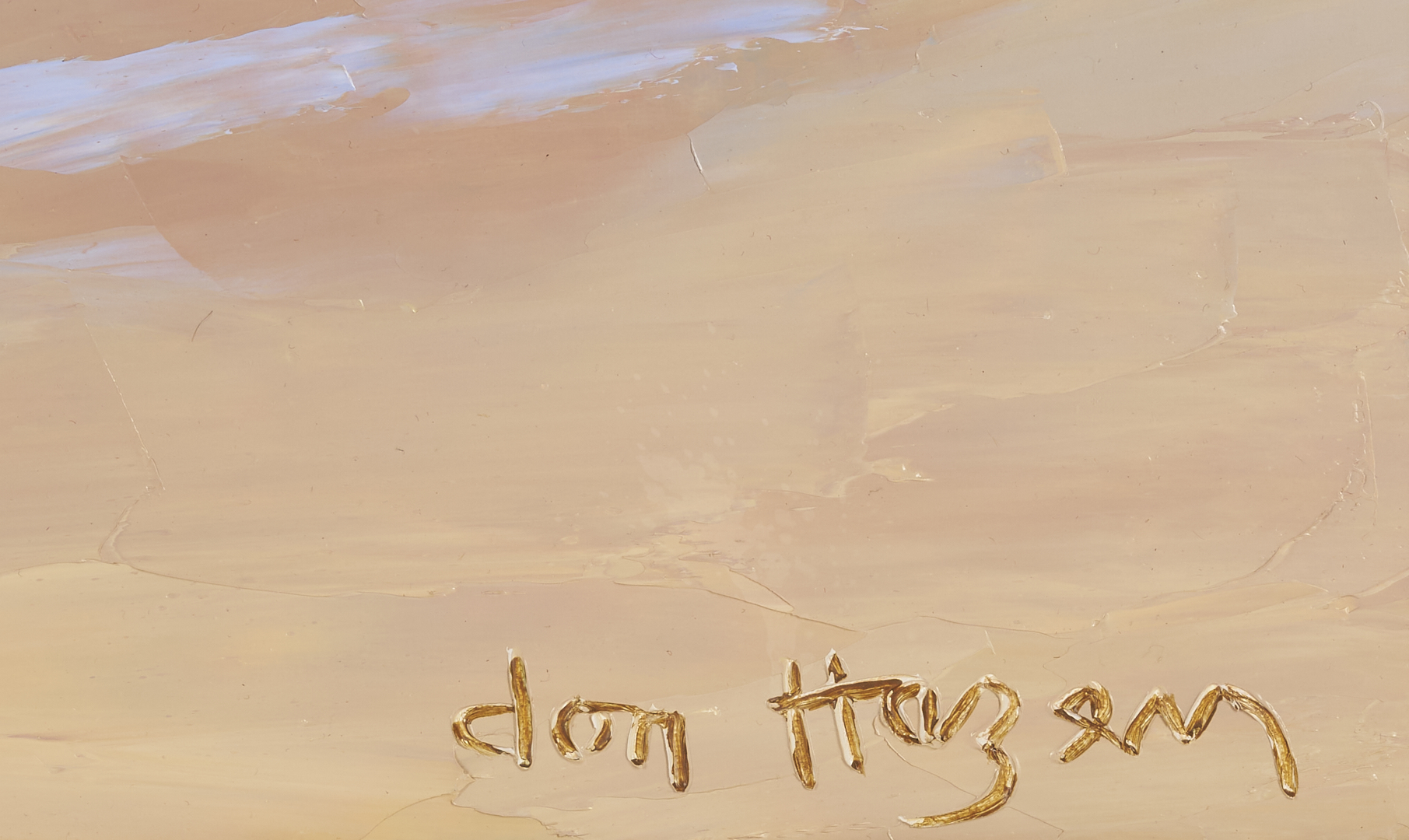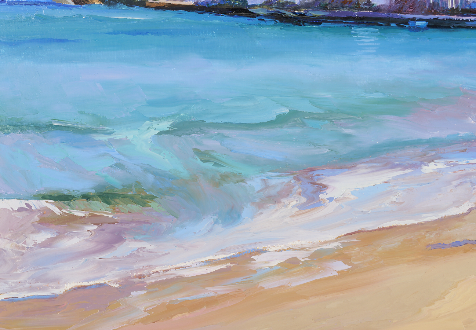 Large Don Hazen (Tennessee/Florida/Spain, b. 1933) colorful oil on canvas beach scene depicting a young girl playing on the beach with a dense row of houses visible in the background. Signed lower right. With Wally Findlay Galleries, Chicago label affixed to backing. Housed in an angled gilt wood frame with linen liner. Sight: 24 5/8 in. H x 35 1/4 in. W. Frame: 30 3/4 in. H x 41 3/4 in. W. Biographical Note: Don Hazen was born in Johnson City, Tennessee. He attended East Tennessee State University and served in the Army in Japan and Korea before meeting and studying wtih mural painter Dan Chapin in Denver. He then moved to Florida where he took classes at the Orlando Institute of Art and studied with portrait painter Robert Anderson. He went to Europe in the 1960s and eventually settled in Spain, where he married and began painting from nature. He was represented in the U.S. by Wally Findlay Galleries starting in 1974.