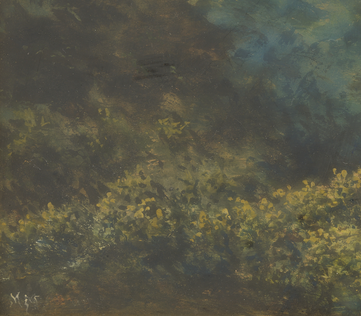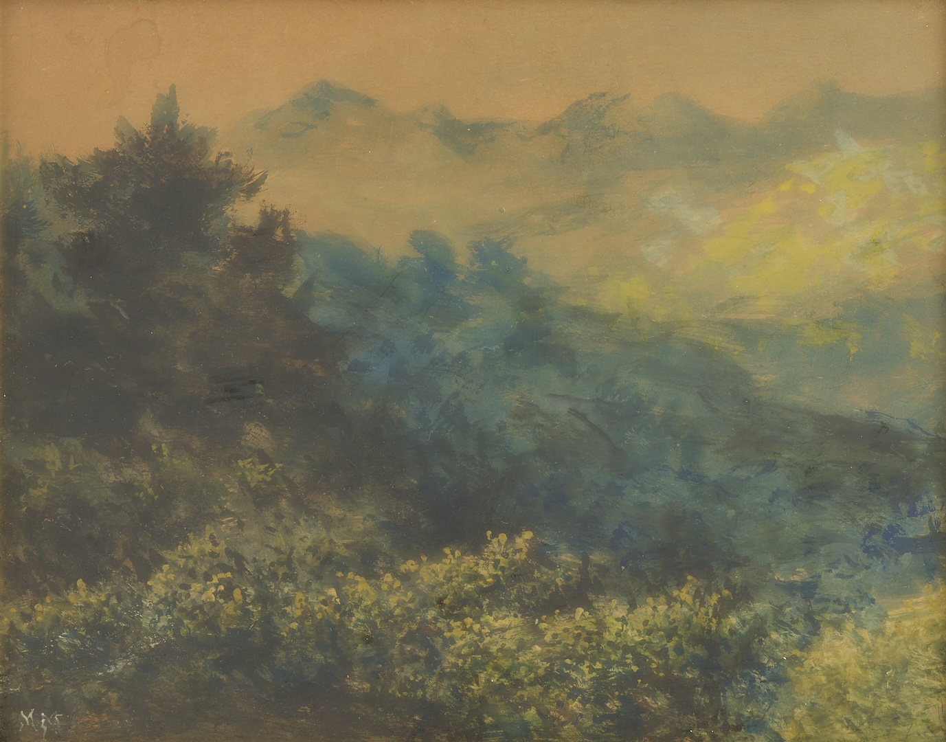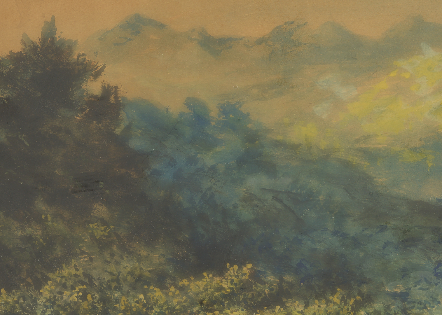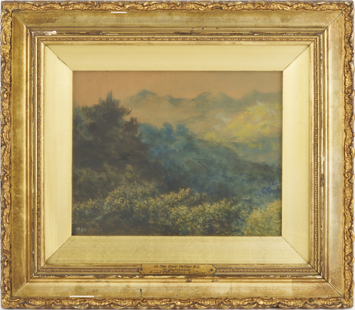 Marmaduke Matthews (Canada/England, 1837-1913) watercolor on paper Canadian Rockies mountain landscape painting, “In the Bow Valley, B.C.” Lush, green foliage grows in Alberta’s Bow Valley, with a distant mountain beyond. Initialled “MM,” lower left. Housed under glass in a giltwood frame with name and title plate. Sight: 7 1/4 in. H x 9 1/4 in. W. Framed: 13 3/4 in. H x 15 3/4 in. W.