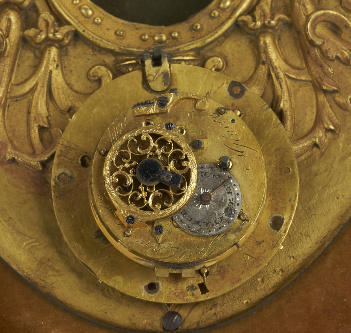 CONDITION: Some light wear and oxidation to bronze. The enamel dial has surface crazing and is affixed to the plaque with a wire that is likely not original. Glass covering of face is detached but retained. Works not checked or guaranteed to be complete or functional.