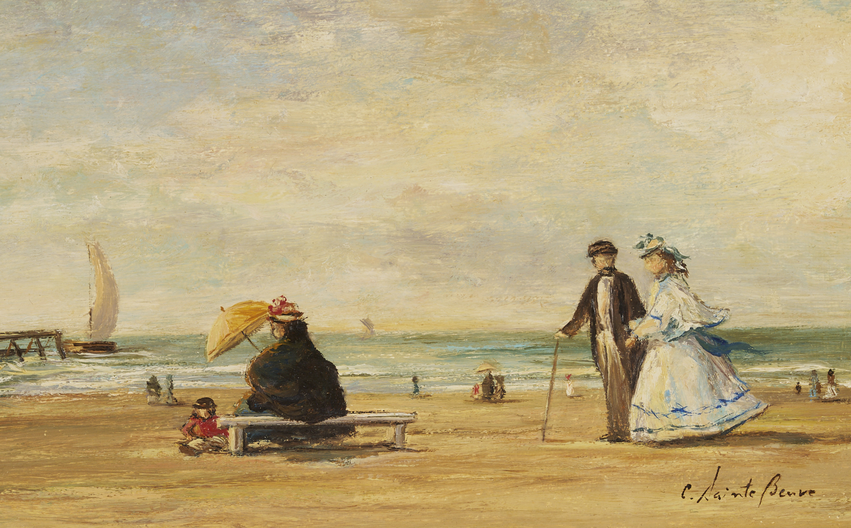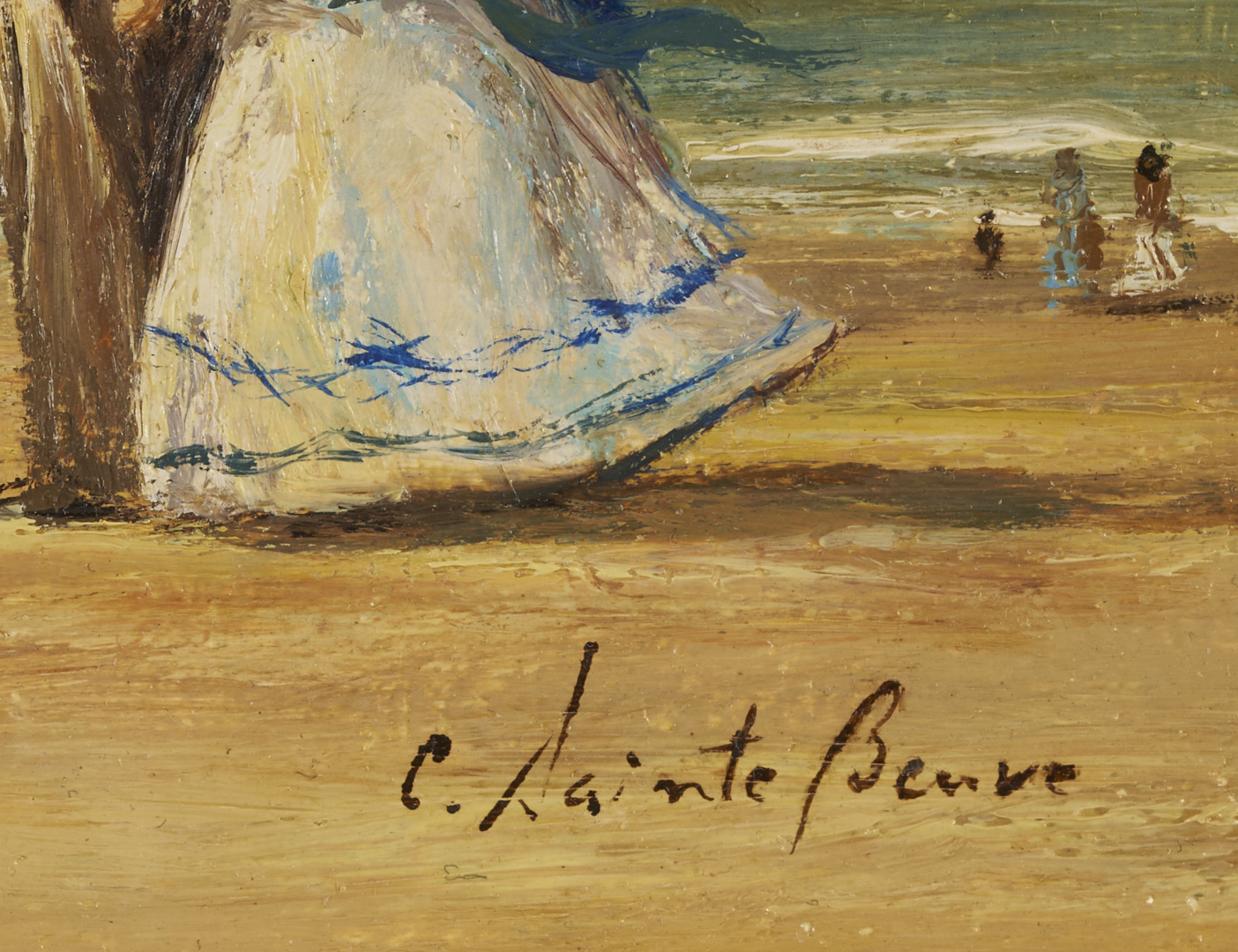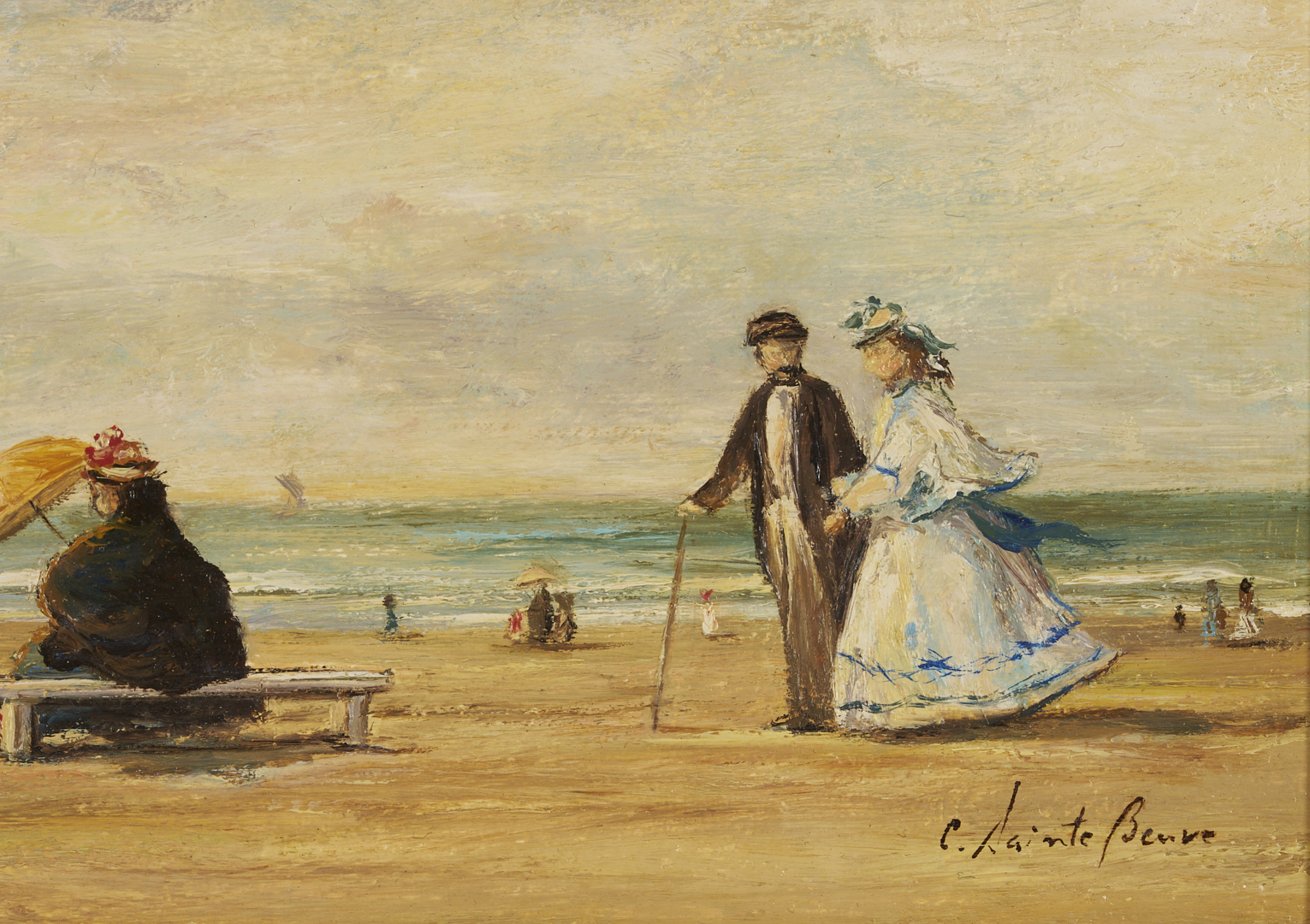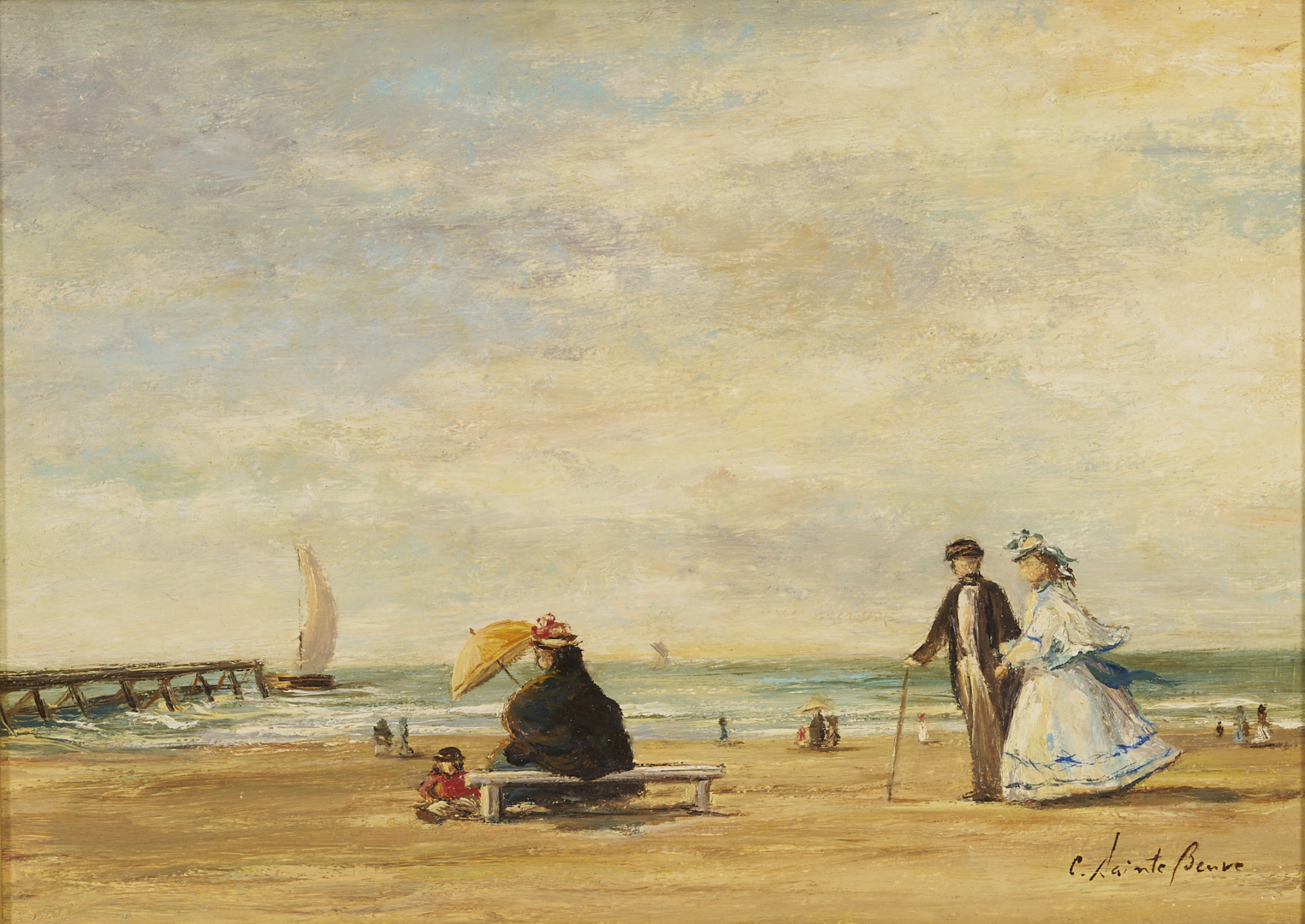 French oil on board impressionist beach scene painting titled “Plage de Deauville” depicting a couple dressed in period clothing, a woman shielding a child with a sun umbrella, and a small sailboat docked on a pier, under a partly cloudy sky. Signed “C. Sainte Beuve” on the lower right, and titled, in pencil, “Plage de Deauville” en verso. Housed in a gilt wood frame with a white linen liner. Canvas: 5 ½” H X 8 ¼” W. Frame: 11 ¼” H X 13 ½” W. Early 20th century.