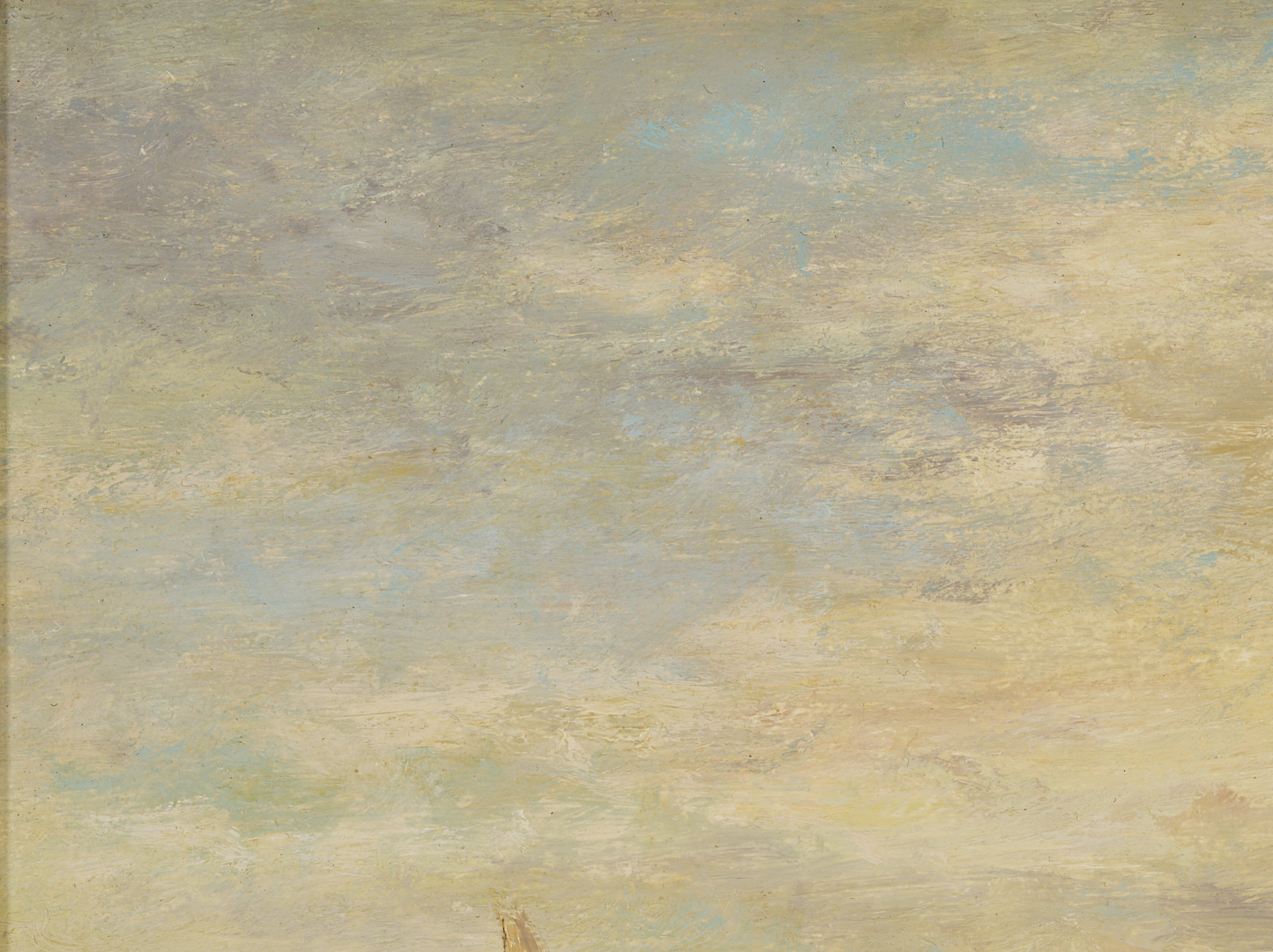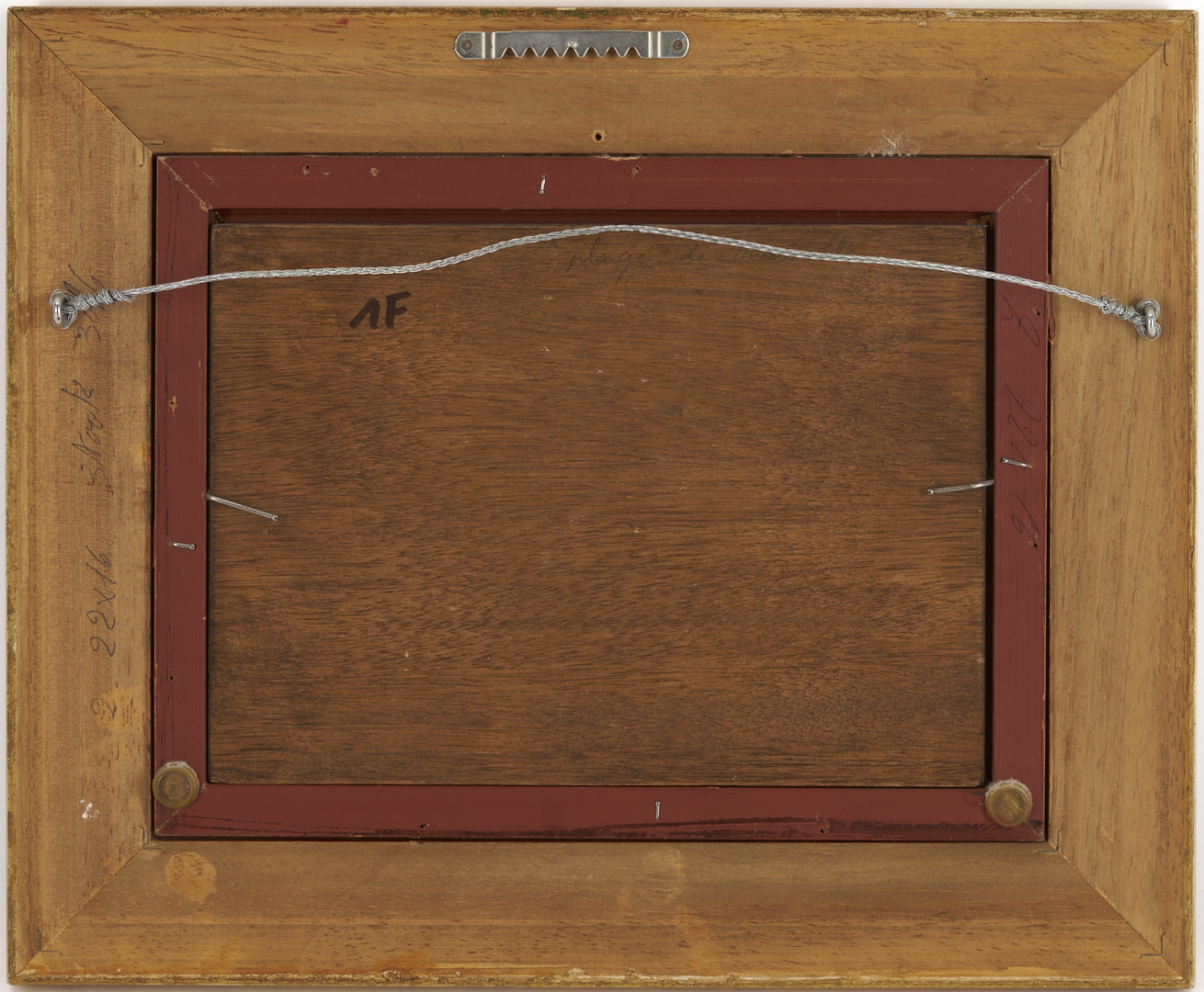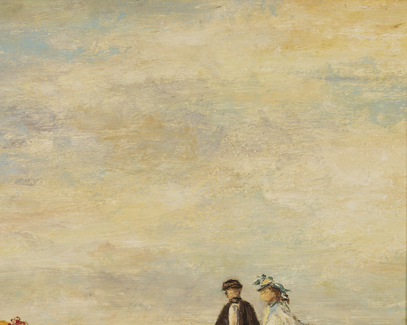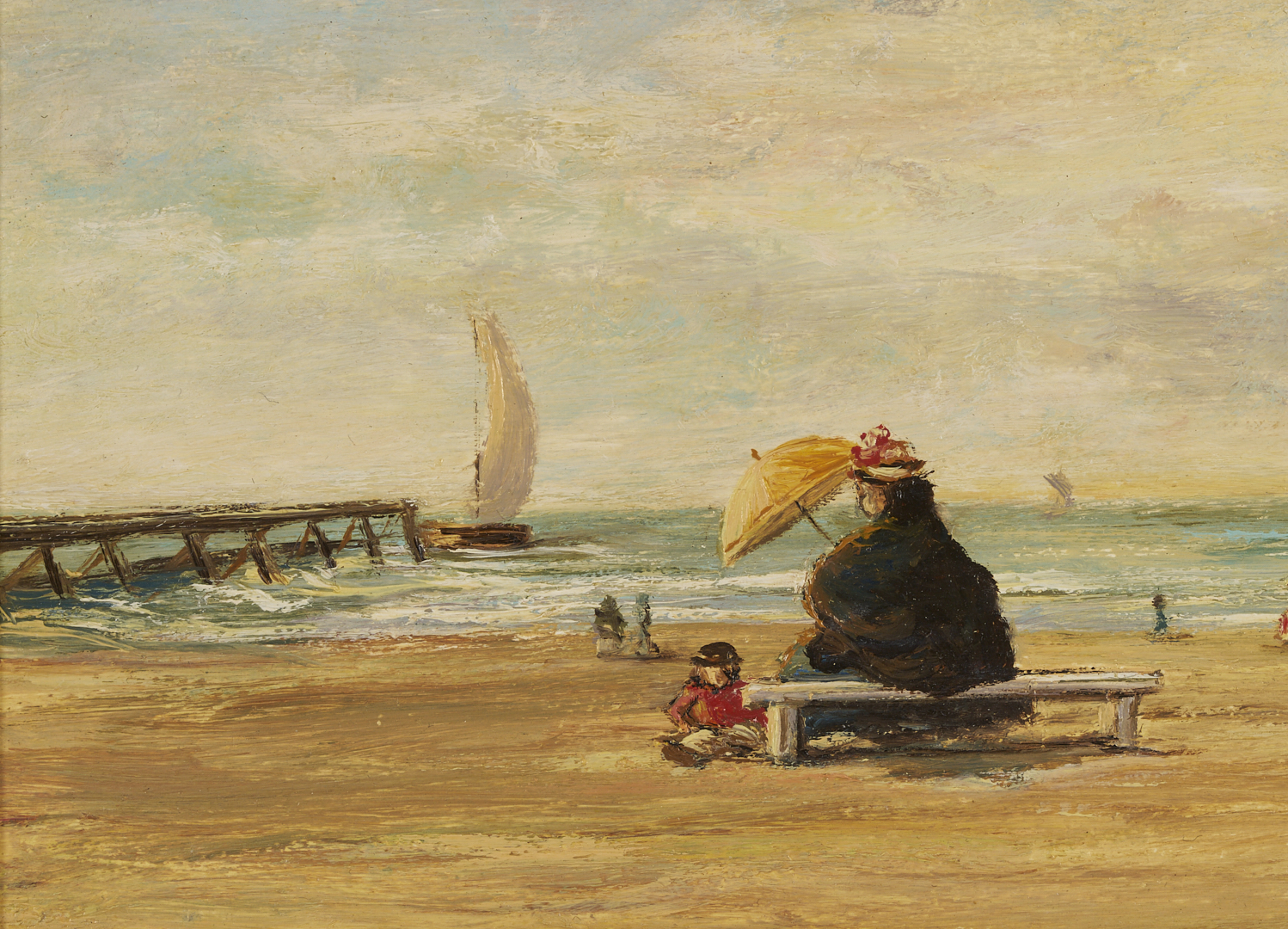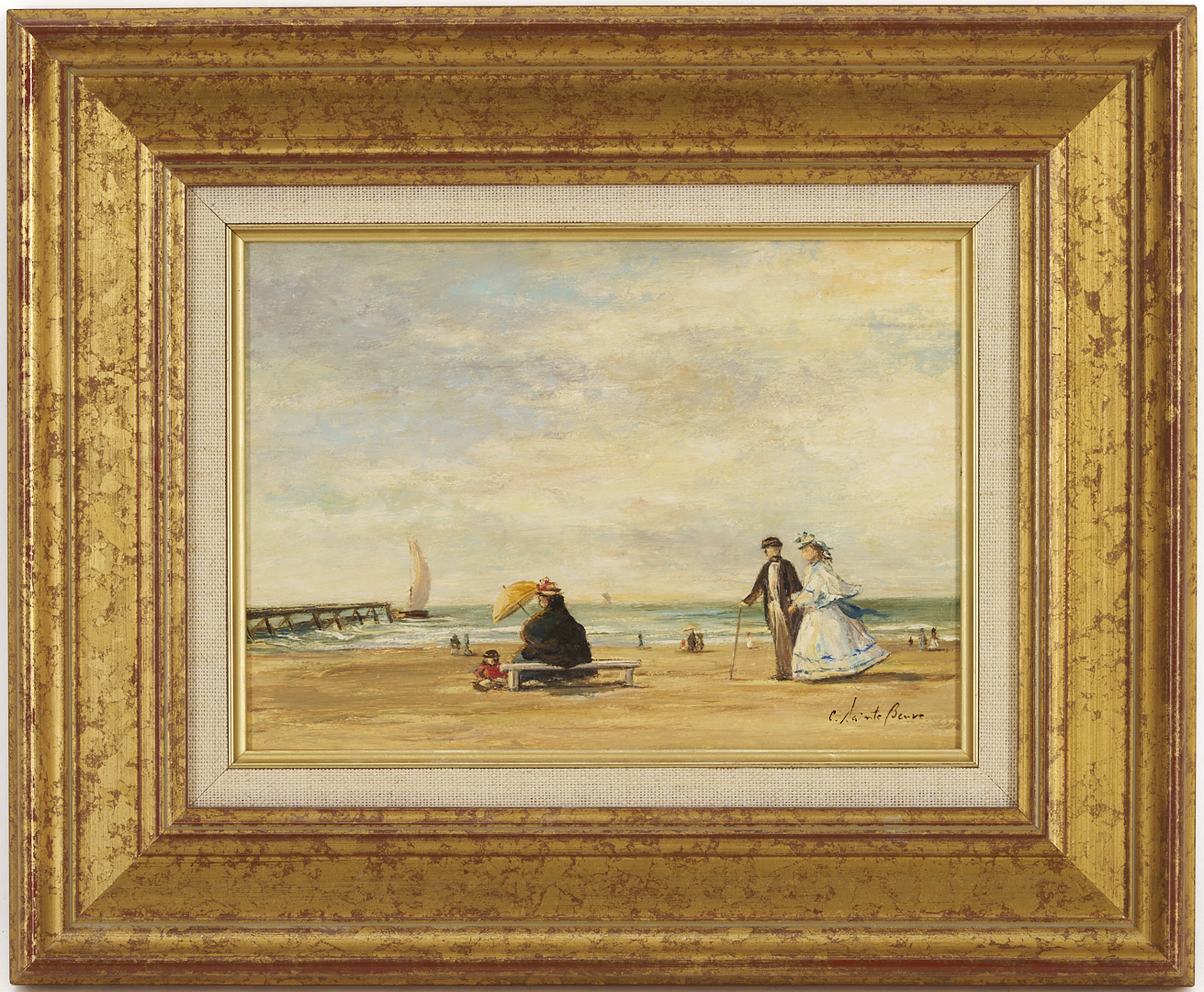 French oil on board impressionist beach scene painting titled “Plage de Deauville” depicting a couple dressed in period clothing, a woman shielding a child with a sun umbrella, and a small sailboat docked on a pier, under a partly cloudy sky. Signed “C. Sainte Beuve” on the lower right, and titled, in pencil, “Plage de Deauville” en verso. Housed in a gilt wood frame with a white linen liner. Canvas: 5 ½” H X 8 ¼” W. Frame: 11 ¼” H X 13 ½” W. Early 20th century.