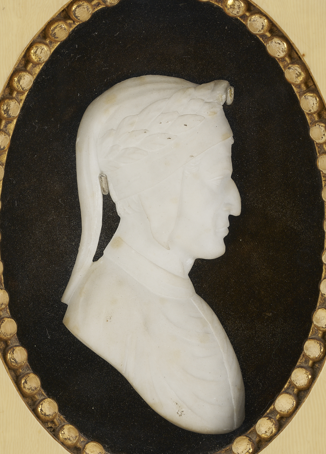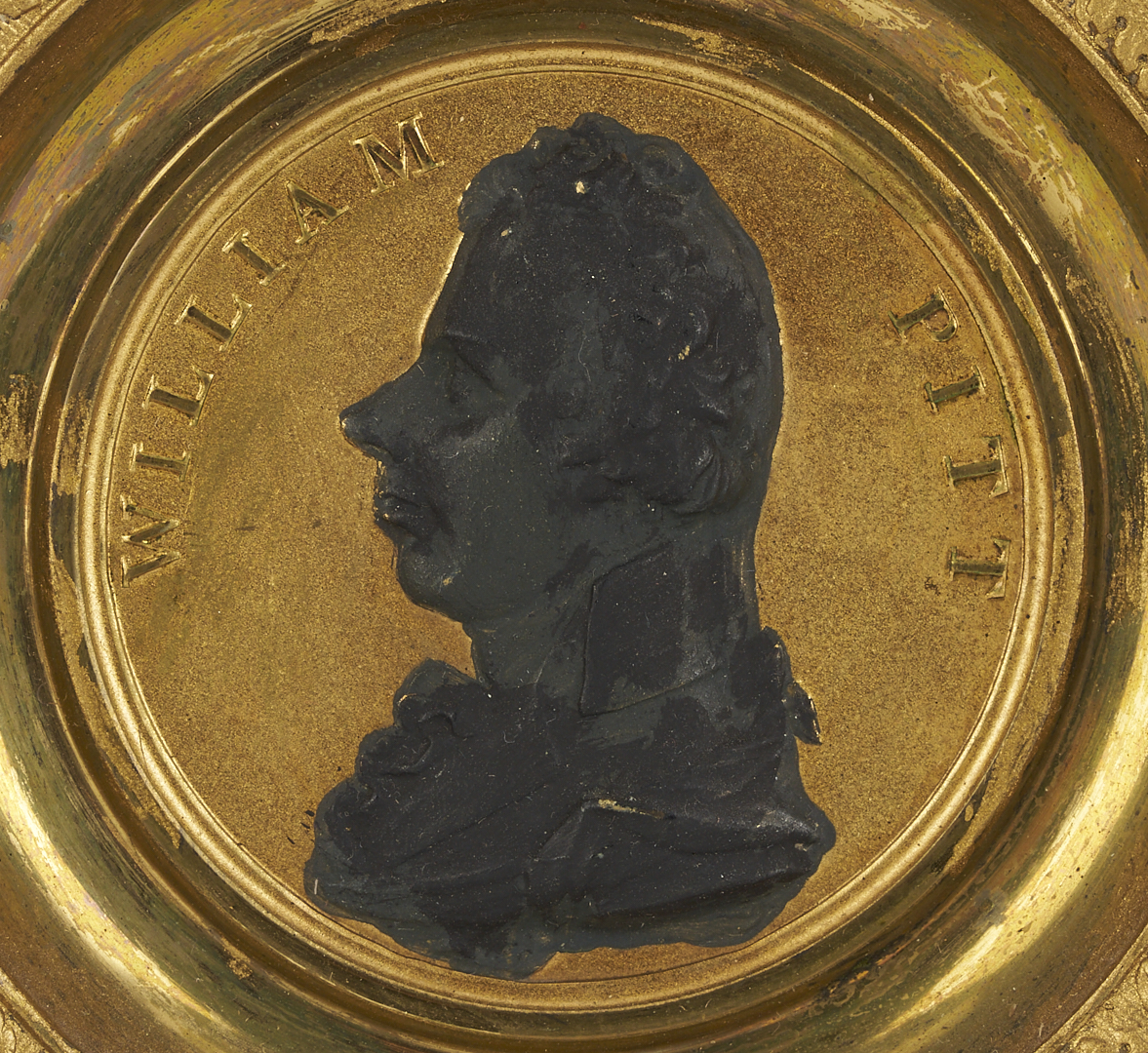 1st & 2nd items: Pair of European Tour framed alabaster bas relief profile portraits mounted onto velvet, one depicting Plato and the other depicting Michelangelo. Housed in shadowbox frames with beaded openings. 7 1/8 in. H x 5 1/2 in. W. Late 19th/Early 20th century. 3rd item: William Pitt ebonized profile bas relief profile portrait with the name to the left and right of the bust, mounted onto a gilt surround with foliate border, the whole in a circular ebonized wood frame. 6 3/4 in. dia. 19th century.