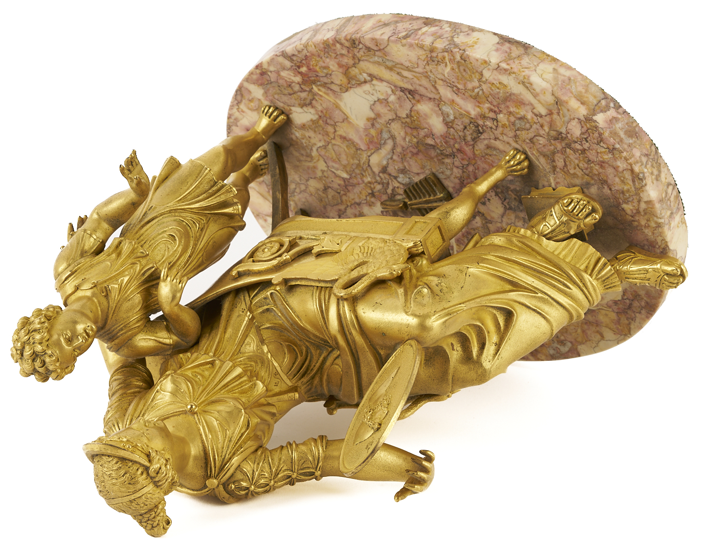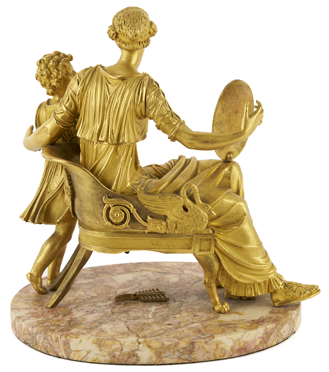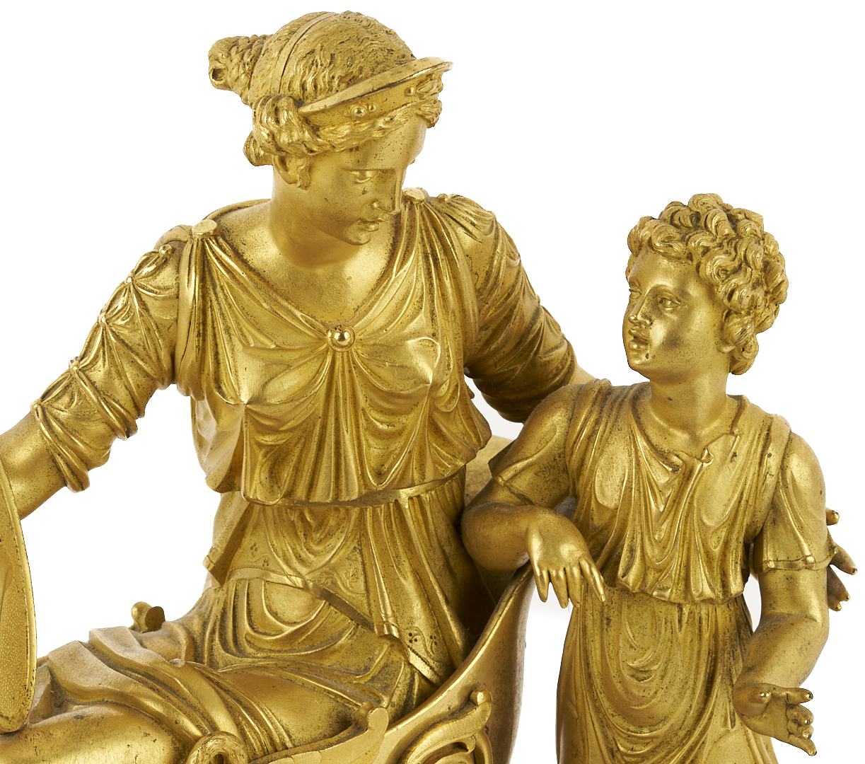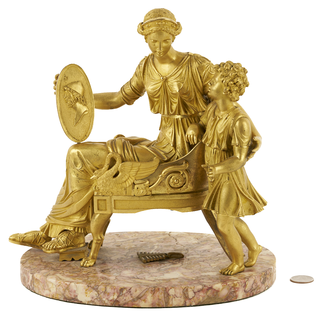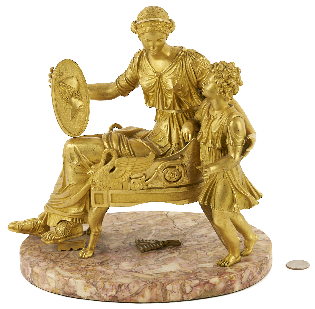 French Empire gilt bronze sculpture depicting a mother seated in a chair with a shield in her left hand bearing the bust of a man and her son standing to her left side, both attired in Classical clothing. Mounted onto an oval variegated rose marble base. Unsigned. 10 1/4 in. H x 10 1/2 in. W x 6 in. D. Late 19th century.