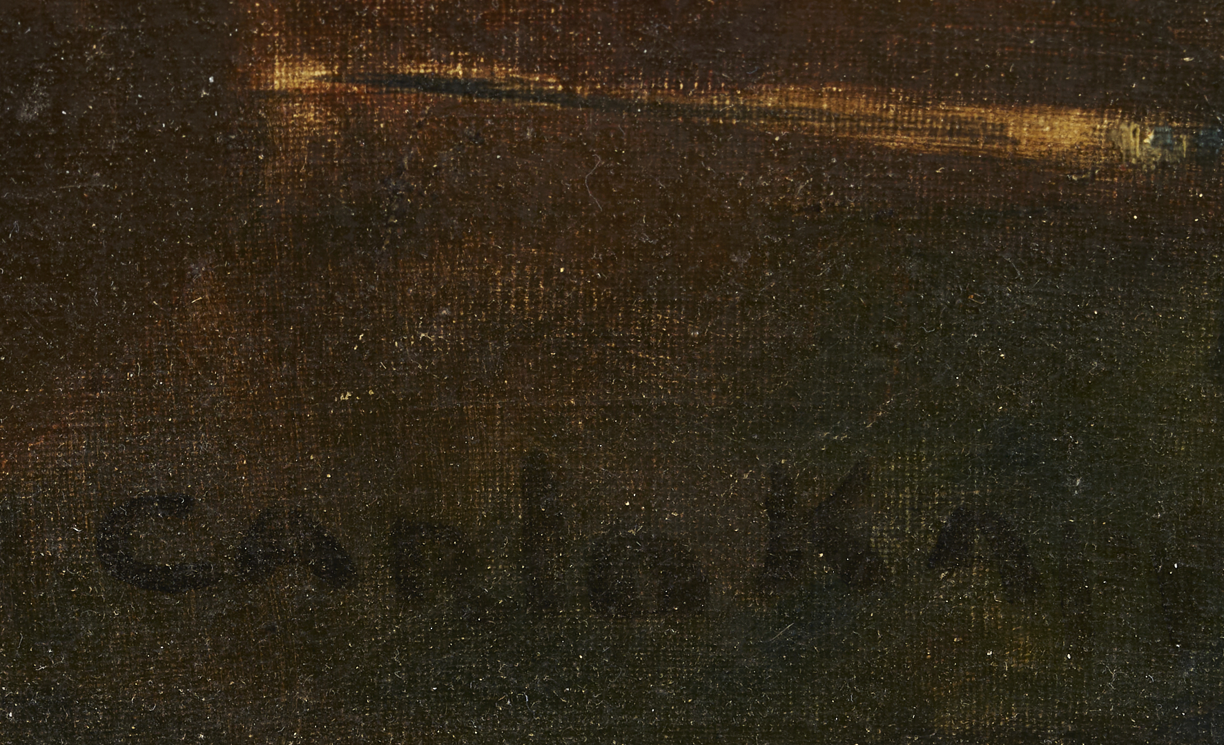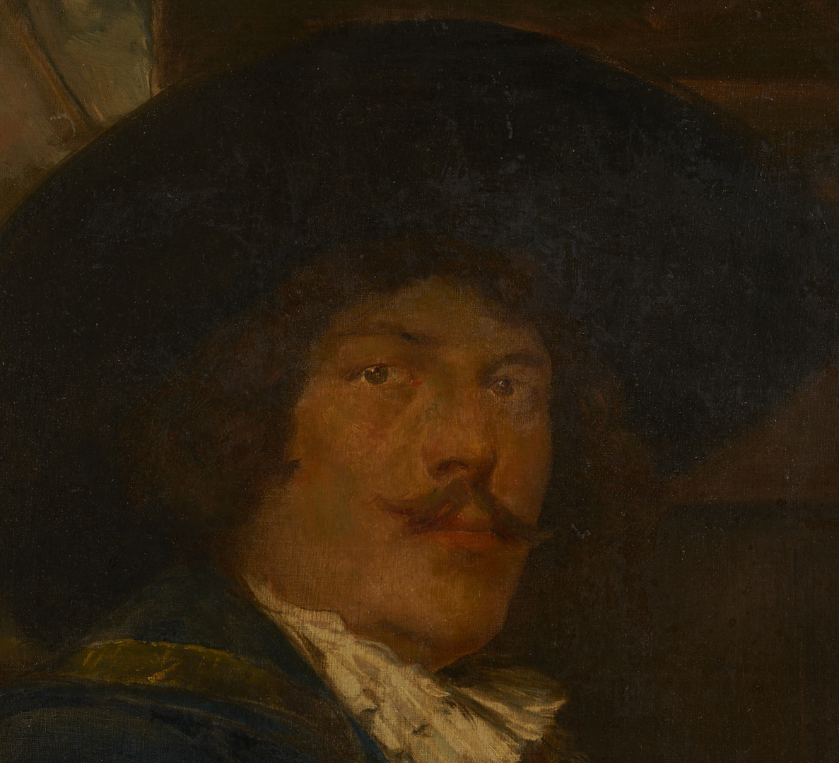 Carlo Kappo (European, 20th c.) oil on canvas, bust-length portrait of a musketeer or cavalier who wears a wide-brimmed hat and looks directly at the viewer while he grips the handle of a sword with his left hand. Signed lower right and retains a Chicago Conservation Center label affixed to stretcher. Housed in a painted and giltwood frame. Sight: 31 1/2 in. H x 25 1/2 in. W. Framed: 40 1/2 in. H x 34 1/4 in. W.