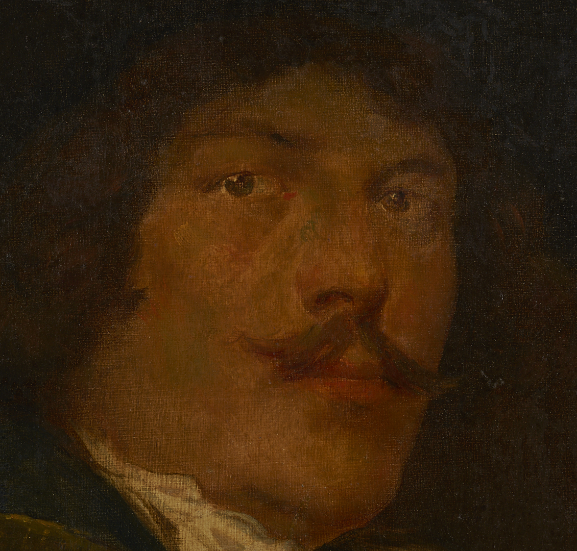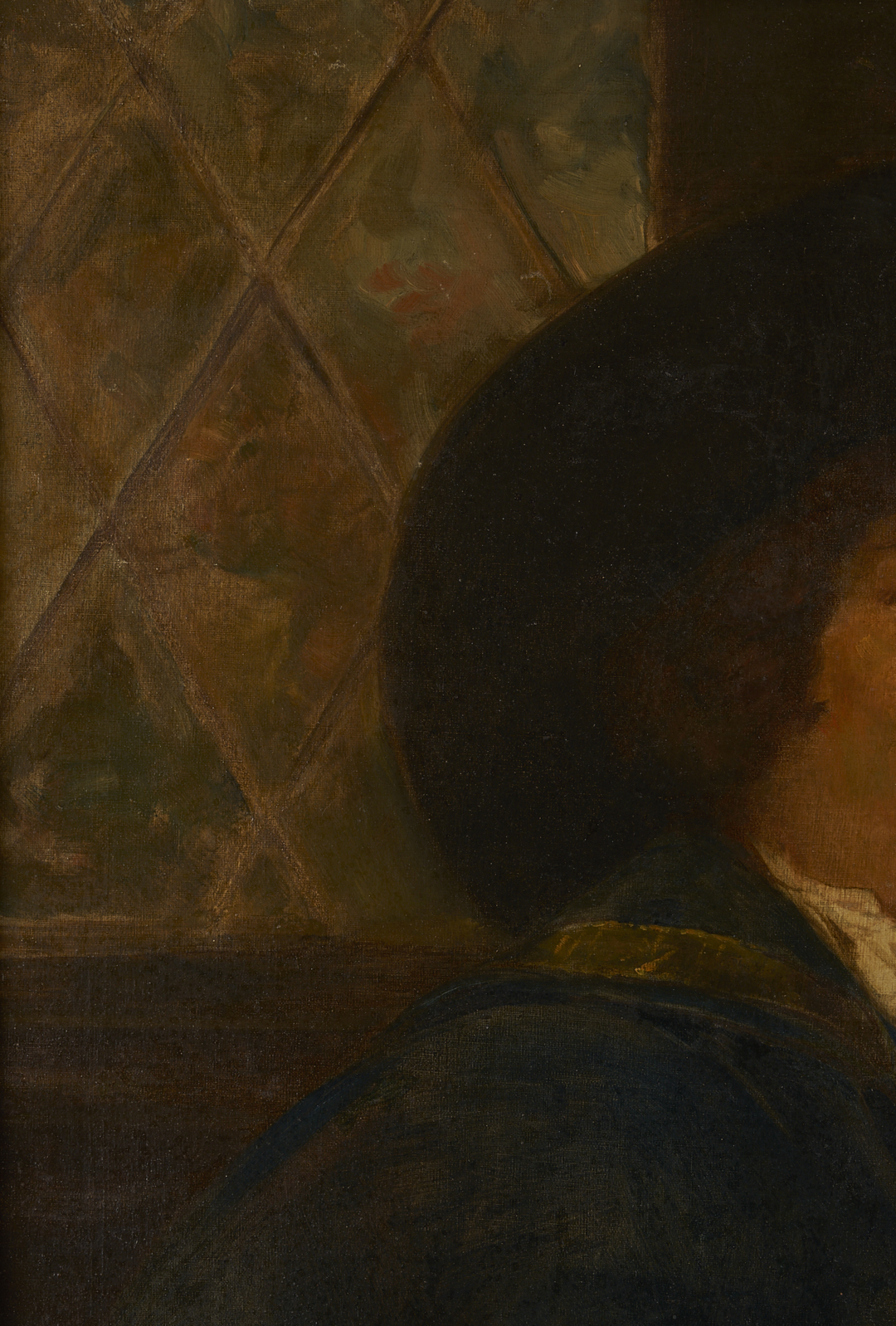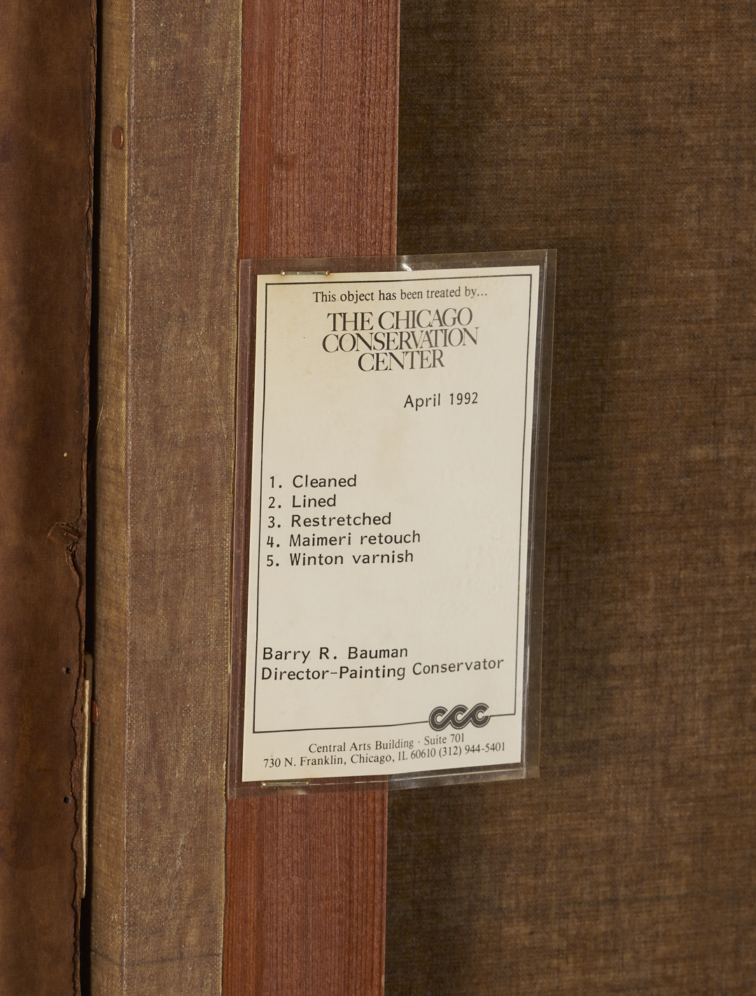 Overall very good condition. Professionally conserved by Chicago Conservation Center, 1992. Canvas has been lined and restretched. With scattered retouch throughout, especially to hair, hat, and to lower left corner. Largest area around repaired horizontal tear at lower left corner, approximately 6-inch x 4-inch.
