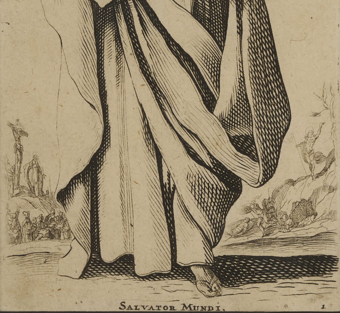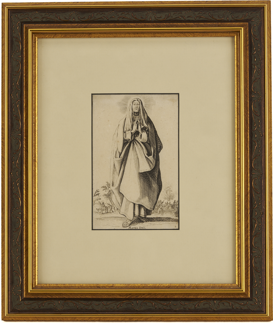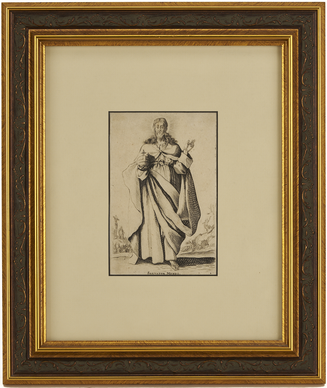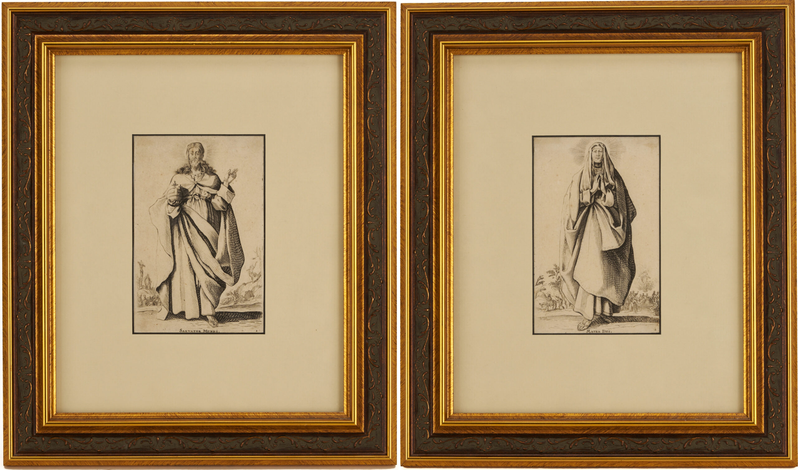 Two (2) etchings on laid paper after Jaques Callot (French, 1592-1635), Christ as Salvator Mundi and Mary as Mater Dei. Both face the viewer, with vignettes from their lives, deaths, and Christ’s resurrection to lower left and right. Reverse copies after etchings from Callot’s series The Large Standing Apostles, Representing The Savior, The Blessed Mary, and the Apostles. Titled Salvator Mundi and Mater Dei, lower centers, and numbered 1 and 2, lower right corners. Both housed under glass in giltwood frames with cream mats. Both sights: 5 1/2 in. H x 3 1/2 in. W. Both frames: 13 1/8 in. H x 11 1/8 in. W.