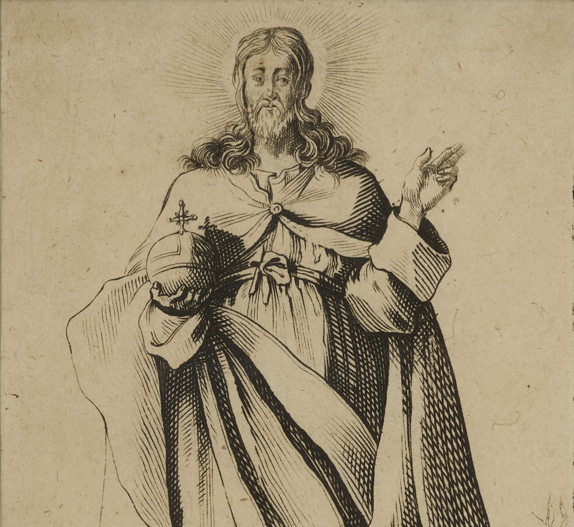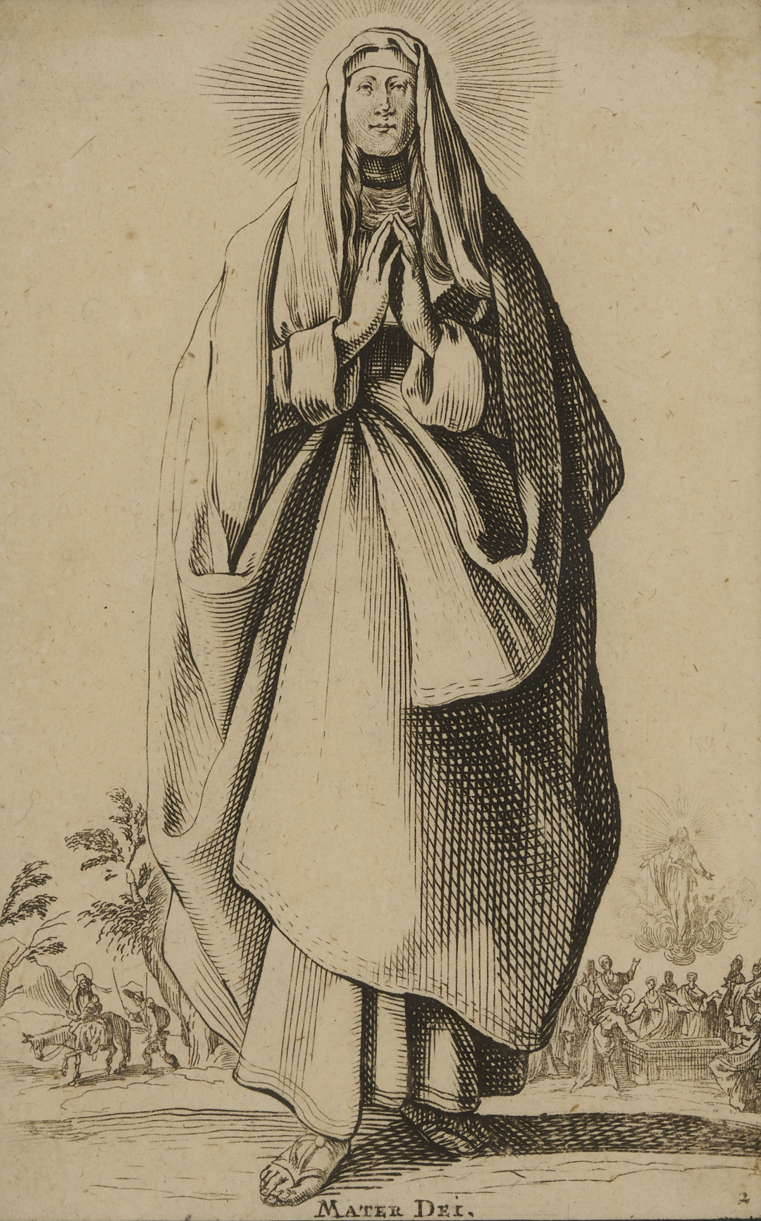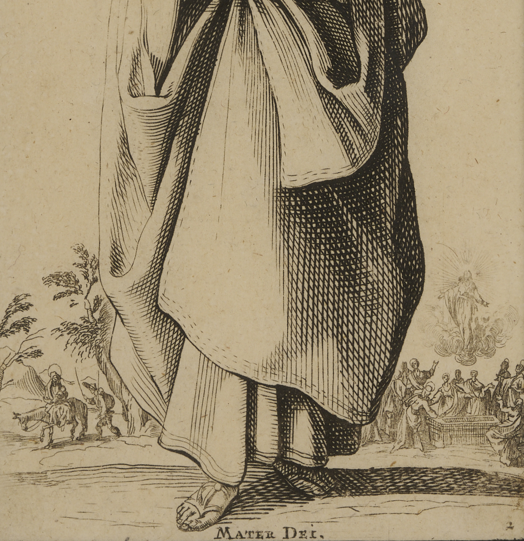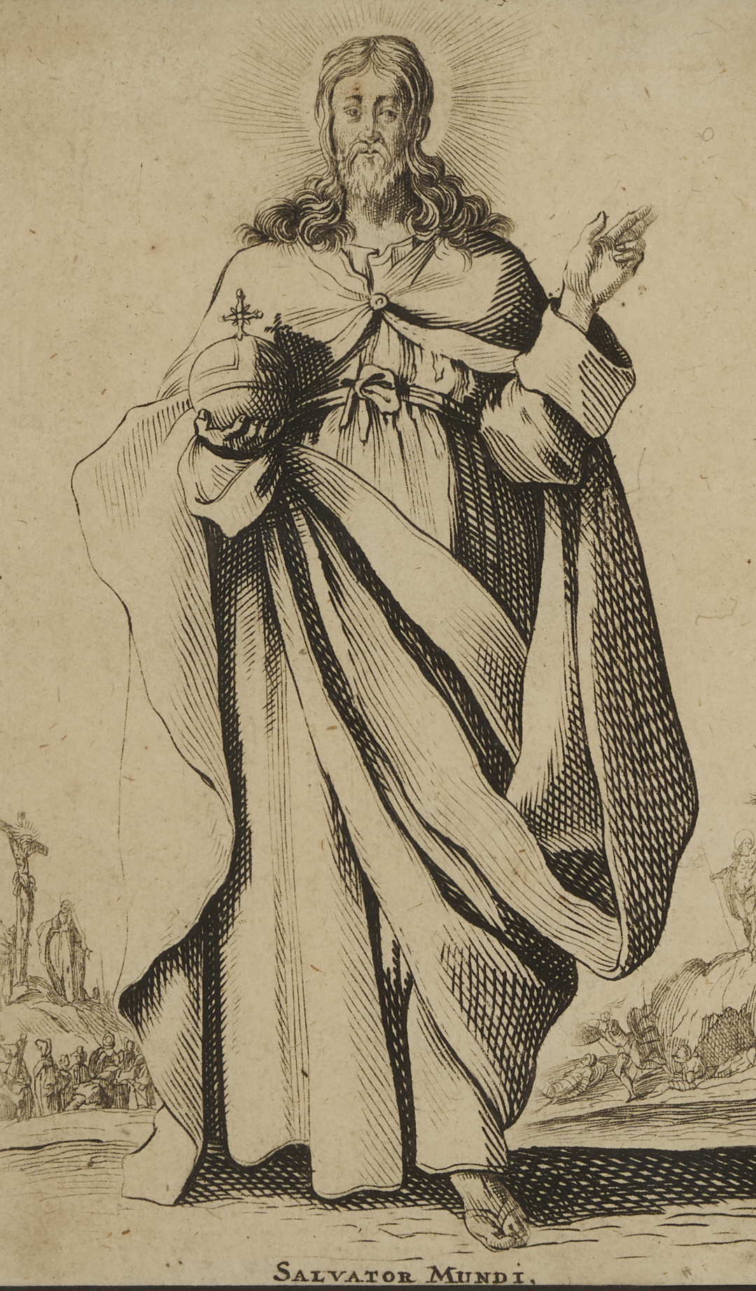 Two (2) etchings on laid paper after Jaques Callot (French, 1592-1635), Christ as Salvator Mundi and Mary as Mater Dei. Both face the viewer, with vignettes from their lives, deaths, and Christ’s resurrection to lower left and right. Reverse copies after etchings from Callot’s series The Large Standing Apostles, Representing The Savior, The Blessed Mary, and the Apostles. Titled Salvator Mundi and Mater Dei, lower centers, and numbered 1 and 2, lower right corners. Both housed under glass in giltwood frames with cream mats. Both sights: 5 1/2 in. H x 3 1/2 in. W. Both frames: 13 1/8 in. H x 11 1/8 in. W.
