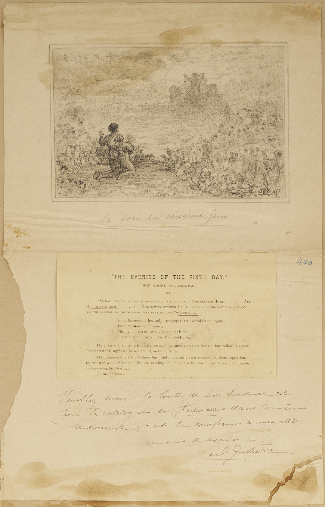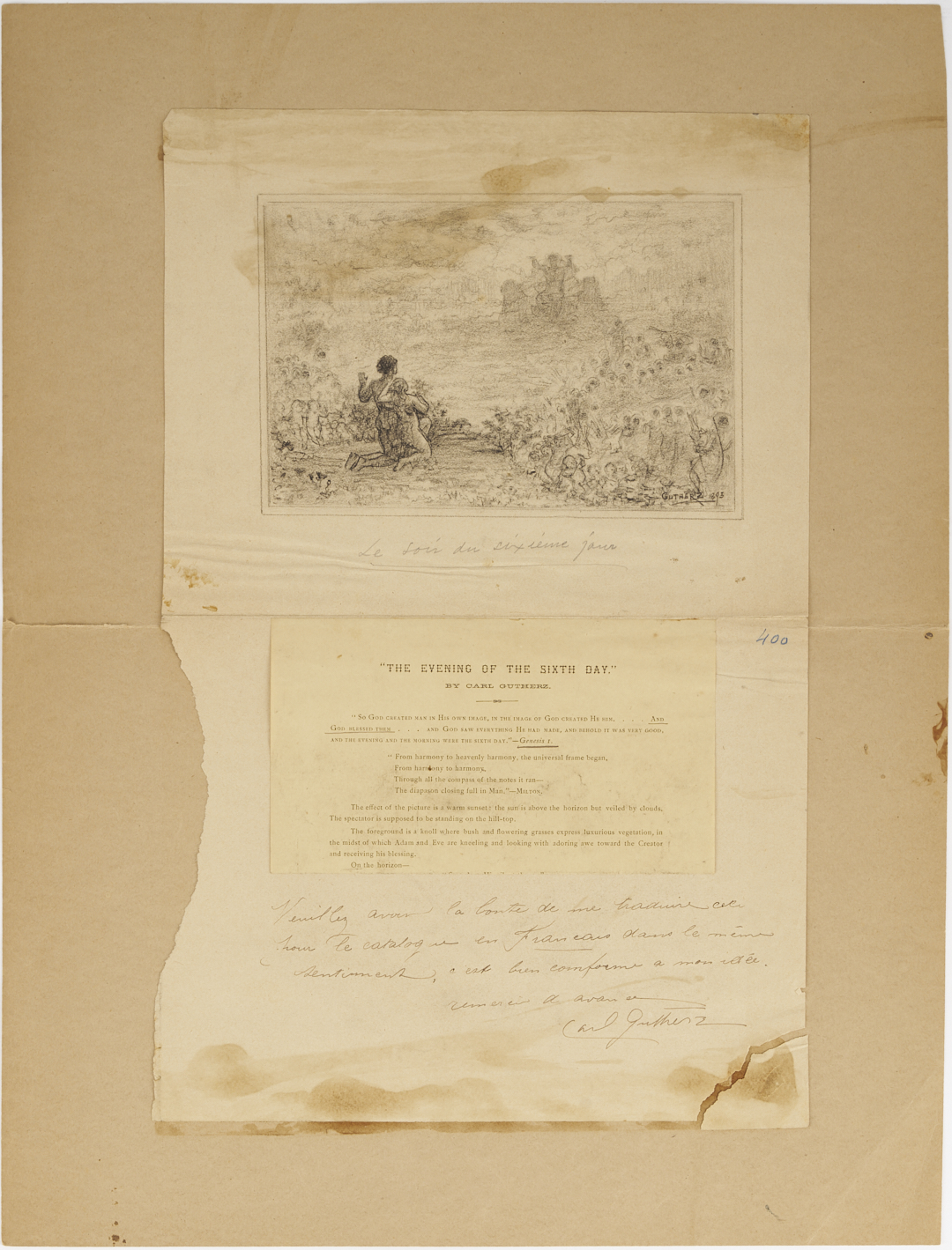 Two (2) Carl Gutherz or Guthers (Tennessee/Missouri, 1844-1907) oil on canvas paintings, both studies for the artist’s monumental 1893 painting “The Evening of the Sixth Day,” plus signed pencil drawing of the same with catalog entry and note written by Gutherz. 1st item: Painting of Adam and Eve in the Garden of Eden with God enthroned in the sky before them. A rainbow arches through the upper left and angels appear faintly throughout the sky. Unsigned. With two inventory stickers or labels and Paul Foinet (Paris) stamp to verso. Unframed and unstretched. Canvas (with tacking edge): 23 in. H x 33 1/2 in. W. Image (sight area): 21 in. H x 31 3/4 in. W. 2nd item: Painting of Adam and Eve in the Garden of Eden with God before them enthroned within a sphere — the heavenly firmament — and accompanied by numerous angels. Unsigned. Unframed. 16 1/2 in. H x 23 3/4 in. W. 3rd item: Pencil sketch of Adam and Eve in the Garden of Eden with God enthroned before them and numerous angels to left and right. Signed and dated within the image, lower right, and with handwritten title in French below. With Gutherz’s printed explanatory note in English affixed to sheet below image along with handwritten note in French with instructions to have the printed text translated to French for a catalog. Signed by the artist in pencil. Housed in a folded card mount (previously laid down but glue has failed). Image: 6 in. H x 9 in. W. Sheet: 18 3/4 in. H x 12 in. W. Mount: 23 1/8 in. H x 17 3/4 in. W. (Folded: 11 1/2 in. x 17 3/4 in.) Note: The Memphis Brooks Museum of Art identifies these as compositional studies for Gutherz’s “The Evening of the Sixth Day,” which depicts Adam and Eve in the Garden of Eden and was sold by Case (ref. Case Auctions Winter 2025 catalog, lot 214). Literature: The Evening of the Sixth Day is the focus of Kristin Schwain’s essay “Carl Gutherz’s Esoteric Art” in CARL GUTHERZ: POETIC VISION AND ACADEMIC IDEALS, eds. Marilyn Masler and Marina Pacini (Memphis, TN: Memphis Brooks Museum of Art, 2009) pp. 56-83. Artist Biography: “Gutherz, who was born in Switzerland, emigrated as a child to the U.S. in 1851. He lived with his family in Memphis, Tennessee, through the Civil War and then studied at the Ecole des Beaux Arts in Paris and the Academie Julian, as well as in Munich, Brussels, and Rome. In 1875 he moved to St. Louis, Missouri, where he taught at Washington University and helped establish the St. Louis School and Museum of Fine Arts. Guthers continued to take portrait commissions from Memphis, however, and even designed costumes and floats for the annual Memphis Mardi Gras. In 1884 he returned to Paris, where he studied with Gustave Boulanger and Joseph LeFevre. Here, he became associated with the Symbolist movement and produced his most successful paintings including large allegorical works, often featuring Christian imagery. Back in the U.S. he was hired to create murals for institutions including the Library of Congress, the People’s Church of St. Paul Minnesota, and the Allen County (Indiana) Courthouse. A year before his death, he produced a design for an arts and sciences pavilion which was the basis for the development of the Brooks Memorial Art Gallery, later the Memphis Brooks Museum of Art.” (Source: The Tennessee Encyclopedia)