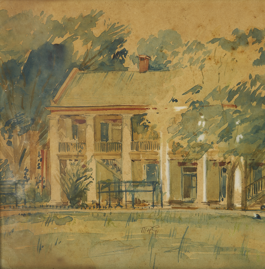 Two (2) Southern architectural paintings. 1st item: Watercolor on paper laid to card painting of a historic two-story building at Jackson Barracks, New Orleans, Louisiana, likely first quarter of 20th c. Initialed “MHG” in pen, lower center. Housed under glass in a distressed silvered wood frame. Sight: 7 1/2 in. H x 10 5/8 in. W. Frame: 8 3/4 in. H x 11 3/4 in. W. (Note: Jackson Barracks military base was established in 1834 and known as New Orleans Barracks prior to 1866 when it was renamed in honor of Andrew Jackson, who first advocated a US military base in this location. During the Great Depression, Louisiana Governor Huey Long Jr. enlisted the WPA to carry out public works programs in Louisiana including the extensive renovation of the Jackson Barracks. This watercolor may date from that period). 2nd item: Edward Mason (American, 20th c.) oil on canvas painting of the Burgess-Maschmeyer Mansion on Governor’s Street in Mobile, Alabama. Sunlight illuminates the building while the branches of a large tree at left cast shadows over a stone wall that runs through the foreground. Signed lower right. Housed in a giltwood frame. Sight: 12 in. H x 14 3/4 in. W. Frame: 13 3/4 in. H x 16 3/4 in. W. Note: The Burgess-Maschmeyer Mansion was built in 1907 by noted Mobile architect George Bigelow Rogers for cotton factor Col. David R. Burgess. After the death of his daughter Ethel, it was used by the Mobile Jaycees and then as the President’s Home of the University of Mobile. It reverted to private hands in 2000. It is listed as a historically significant building by the Mobile Historic Development Commission.