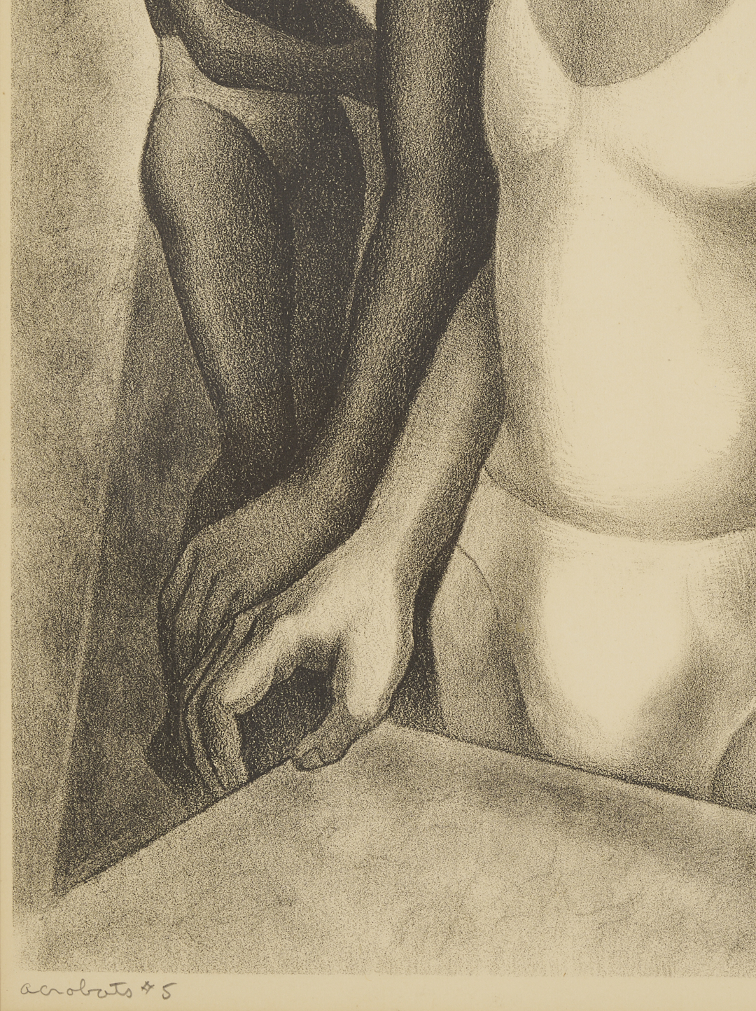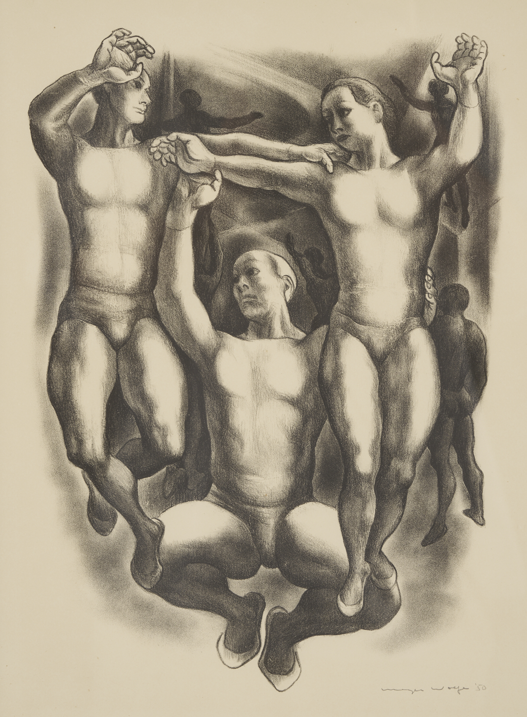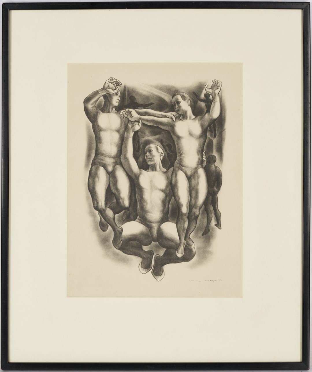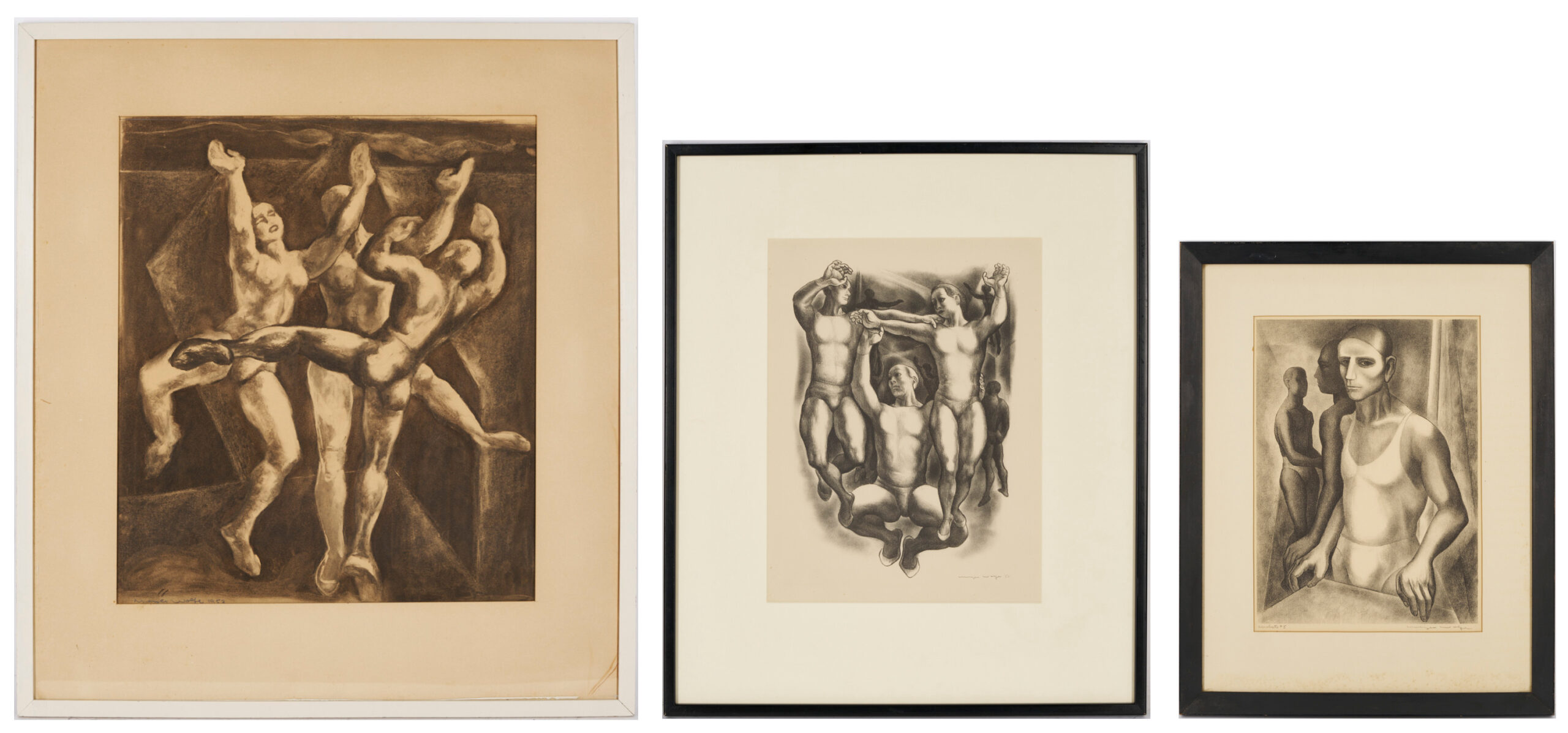 Three (3) Meyer R. Wolfe (Tennessee/New York, 1897-1985) signed works on paper with depictions of male acrobats. 1st item: Charcoal drawing on paper that depicts three full-length acrobats who strike dynamic poses as they perform or practice, 1953. Signed and dated lower left. Housed under glass in a painted wooden frame with tan mat. Sight: 21 3/4 in. H x 18 1/2 in. W. Framed: 31 1/8 in. H x 27 3/4 in. W. 2nd-3rd items: Two (2) lithographs, one with a three-quarters length primary figure in repose and one with three full-length primary figures engaged in an acrobatic display. Both pencil signed lower right. Lithograph with three-quarters length figure titled “Acrobats #5,” lower left. Lithograph with central figural group dated 1950, lower right. Both housed under glass in ebonized wood frames with cream mats. “Acrobats #5” sight: 14 1/8 in. H x 10 1/8 in. W. “Acrobats #5” framed: 21 1/4 in. H x 16 3/4 in. W. Untitled lithograph sight: 15 5/8 in. H x 11 5/8 in. W. Untitled lithograph framed: 24 3/4 in. H x 20 3/4 in. W. Biography: Meyer (“Mike”) Wolfe was born into a Jewish Lithuanian immigrant family, the second of ten children. He was raised in a low-income, multiracial neighborhood of Nashville just north of the Tennessee State Capitol, where he observed the social and cultural lives of his African American friends. As a teen with an interest in drawing, he became a protege of Pulitzer Prize winning Nashville cartoonist Carey Orr. In 1917 he studied briefly at the Art Institute of Chicago and worked as an illustrator. In 1918 he moved to New York and met Ashcan School painter John Sloan, who became one of his most influential teachers. Wolfe traveled to Paris in 1926 to train at the Academie Julian in Paris. While overseas, he met (and later married) the fashion photographer Louise Dahl-Wolfe. Meyer exhibited at the San Francisco Art Association, the New York 1939 World’s Fair, and in Nashville, where he later returned to live. However, much of his later life was spent supporting and managing his wife’s career, and as a result, many of Wolfe’s paintings and prints were never publicly shown or sold. His narrative lithographs of African American life in Nashville during the 1930s are considered among his most important works and very rarely come on the market. His work is also held by the National Museum of American Art-Smithsonian Institution, the Tennessee State Museum, and the Frederick R. Weisman Art Museum, Minneapolis. Sources: “Meyer Wolfe: The Star of All Things” (digital exhibit catalog for the 2021 exhibit at the Nashville Parthenon); Dr. Lawrence Wolfe; Robert Ikard, Tennessee Historical Quarterly, Summer, 2007.