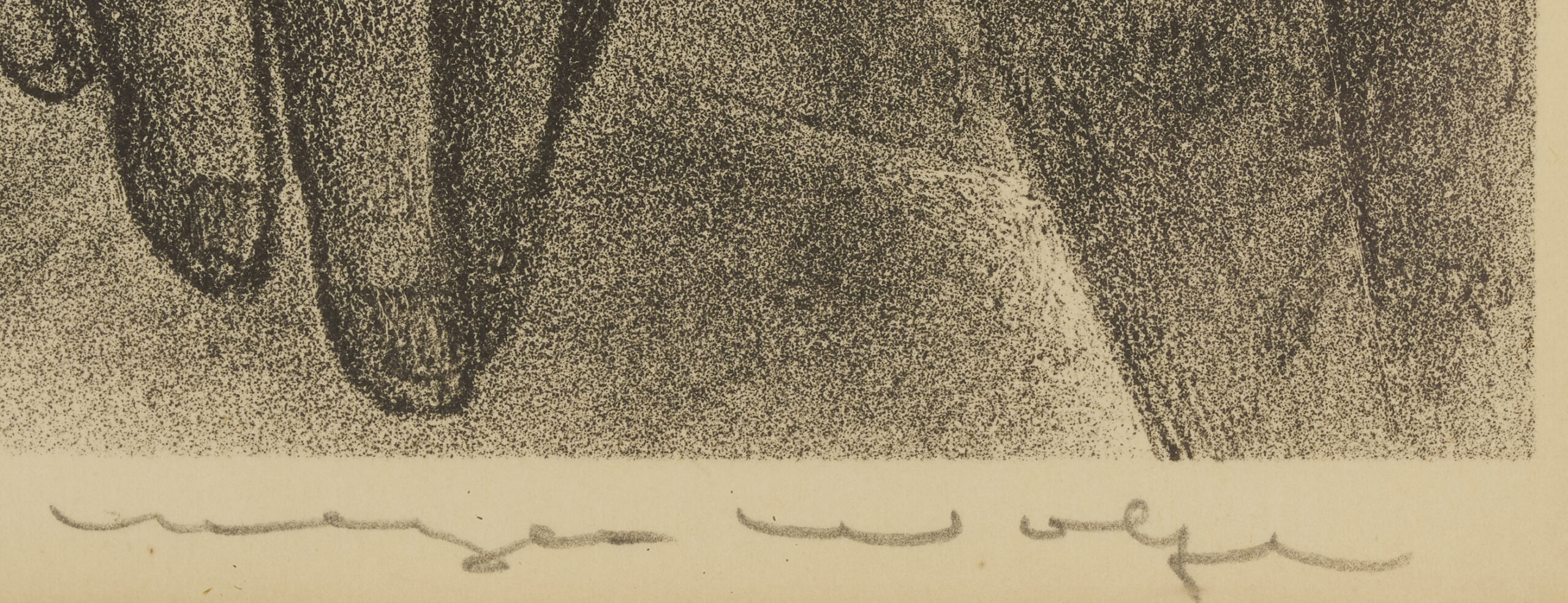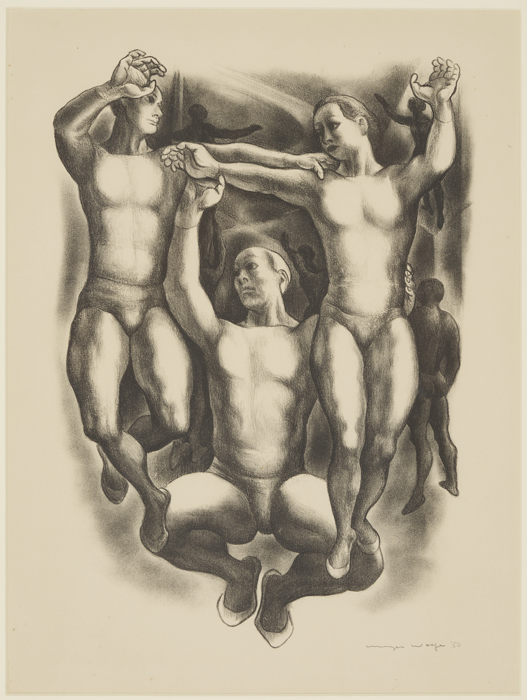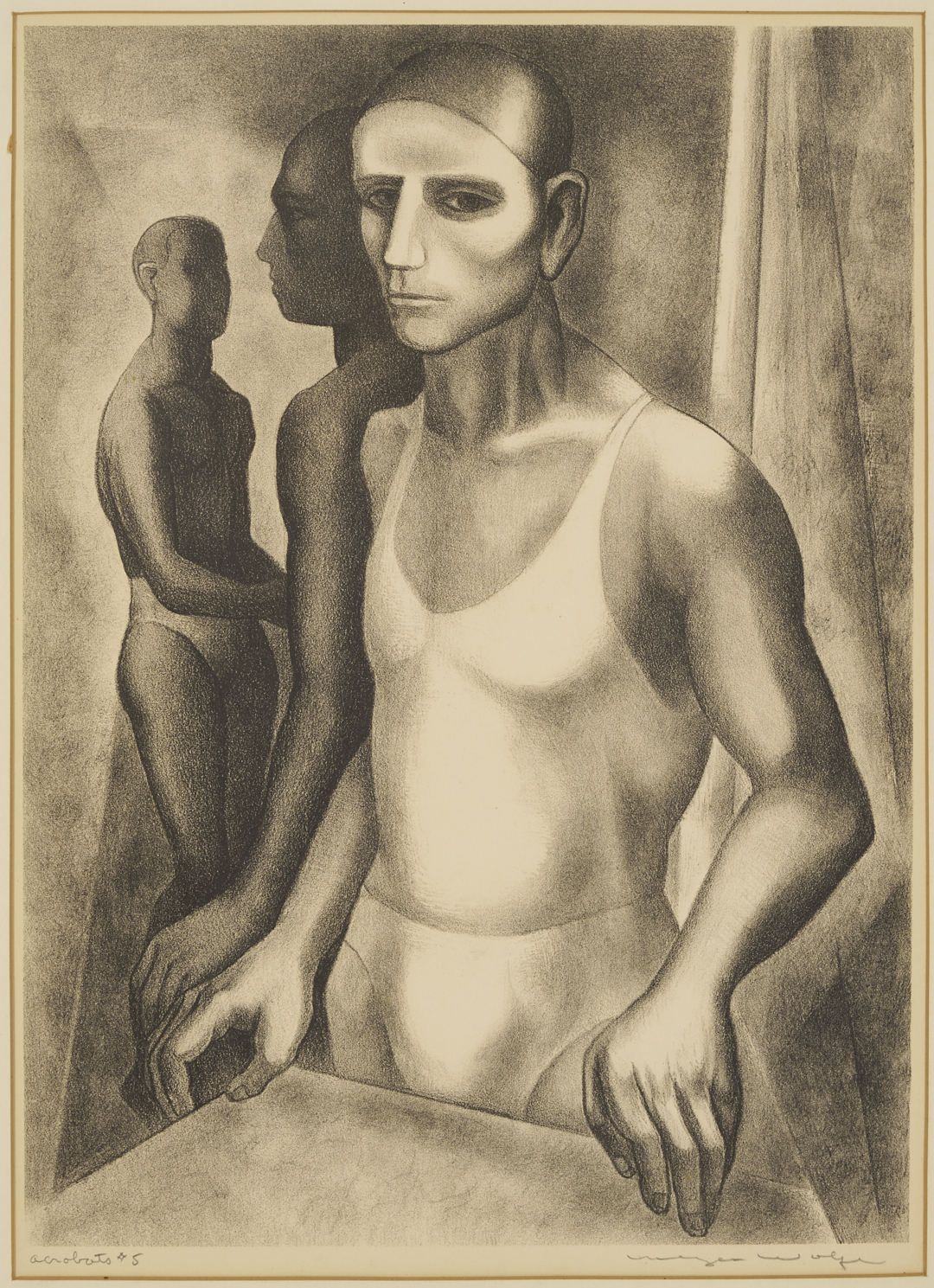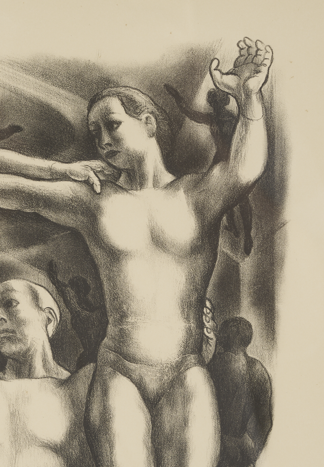 Three (3) Meyer R. Wolfe (Tennessee/New York, 1897-1985) signed works on paper with depictions of male acrobats. 1st item: Charcoal drawing on paper that depicts three full-length acrobats who strike dynamic poses as they perform or practice, 1953. Signed and dated lower left. Housed under glass in a painted wooden frame with tan mat. Sight: 21 3/4 in. H x 18 1/2 in. W. Framed: 31 1/8 in. H x 27 3/4 in. W. 2nd-3rd items: Two (2) lithographs, one with a three-quarters length primary figure in repose and one with three full-length primary figures engaged in an acrobatic display. Both pencil signed lower right. Lithograph with three-quarters length figure titled “Acrobats #5,” lower left. Lithograph with central figural group dated 1950, lower right. Both housed under glass in ebonized wood frames with cream mats. “Acrobats #5” sight: 14 1/8 in. H x 10 1/8 in. W. “Acrobats #5” framed: 21 1/4 in. H x 16 3/4 in. W. Untitled lithograph sight: 15 5/8 in. H x 11 5/8 in. W. Untitled lithograph framed: 24 3/4 in. H x 20 3/4 in. W. Biography: Meyer (“Mike”) Wolfe was born into a Jewish Lithuanian immigrant family, the second of ten children. He was raised in a low-income, multiracial neighborhood of Nashville just north of the Tennessee State Capitol, where he observed the social and cultural lives of his African American friends. As a teen with an interest in drawing, he became a protege of Pulitzer Prize winning Nashville cartoonist Carey Orr. In 1917 he studied briefly at the Art Institute of Chicago and worked as an illustrator. In 1918 he moved to New York and met Ashcan School painter John Sloan, who became one of his most influential teachers. Wolfe traveled to Paris in 1926 to train at the Academie Julian in Paris. While overseas, he met (and later married) the fashion photographer Louise Dahl-Wolfe. Meyer exhibited at the San Francisco Art Association, the New York 1939 World’s Fair, and in Nashville, where he later returned to live. However, much of his later life was spent supporting and managing his wife’s career, and as a result, many of Wolfe’s paintings and prints were never publicly shown or sold. His narrative lithographs of African American life in Nashville during the 1930s are considered among his most important works and very rarely come on the market. His work is also held by the National Museum of American Art-Smithsonian Institution, the Tennessee State Museum, and the Frederick R. Weisman Art Museum, Minneapolis. Sources: “Meyer Wolfe: The Star of All Things” (digital exhibit catalog for the 2021 exhibit at the Nashville Parthenon); Dr. Lawrence Wolfe; Robert Ikard, Tennessee Historical Quarterly, Summer, 2007.