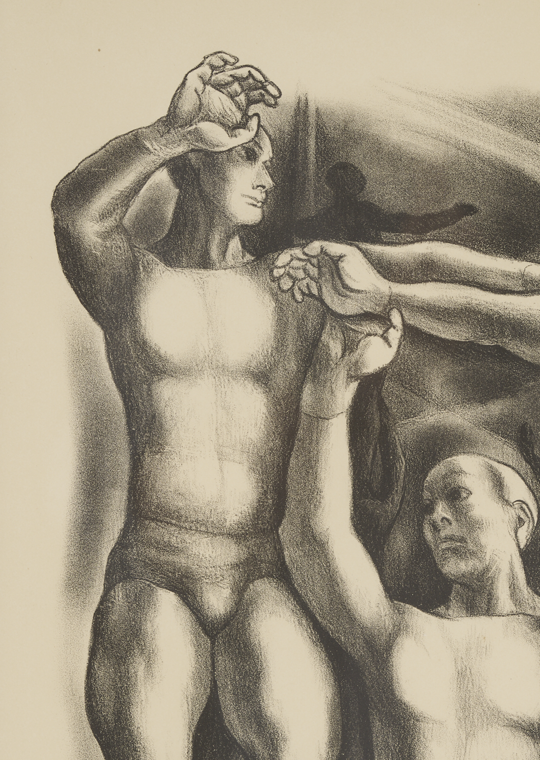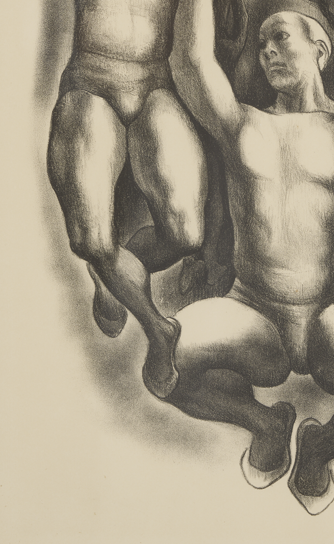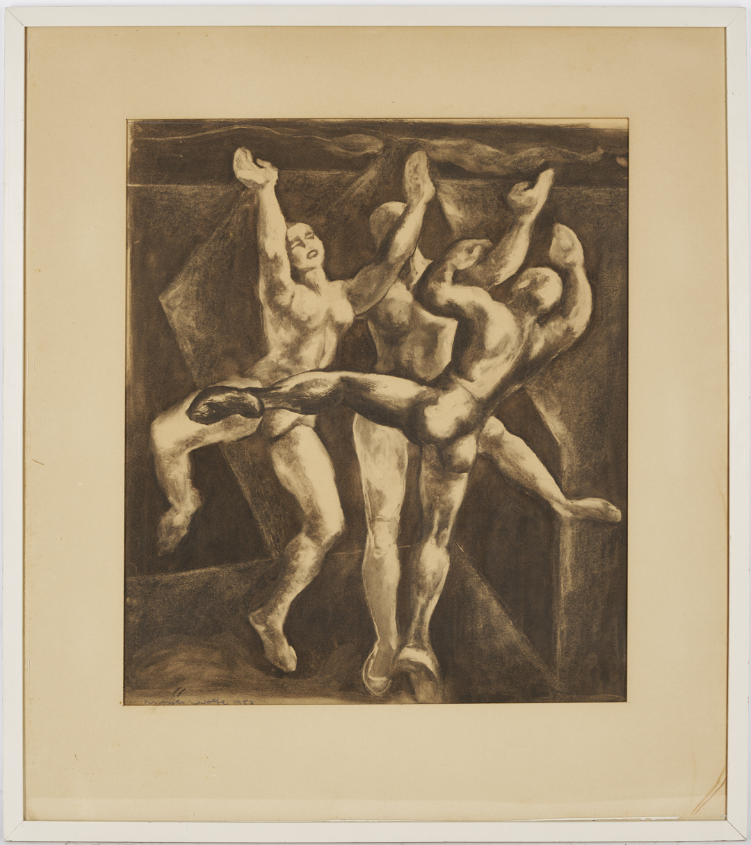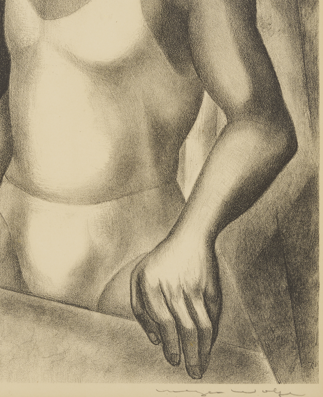 Three (3) Meyer R. Wolfe (Tennessee/New York, 1897-1985) signed works on paper with depictions of male acrobats. 1st item: Charcoal drawing on paper that depicts three full-length acrobats who strike dynamic poses as they perform or practice, 1953. Signed and dated lower left. Housed under glass in a painted wooden frame with tan mat. Sight: 21 3/4 in. H x 18 1/2 in. W. Framed: 31 1/8 in. H x 27 3/4 in. W. 2nd-3rd items: Two (2) lithographs, one with a three-quarters length primary figure in repose and one with three full-length primary figures engaged in an acrobatic display. Both pencil signed lower right. Lithograph with three-quarters length figure titled “Acrobats #5,” lower left. Lithograph with central figural group dated 1950, lower right. Both housed under glass in ebonized wood frames with cream mats. “Acrobats #5” sight: 14 1/8 in. H x 10 1/8 in. W. “Acrobats #5” framed: 21 1/4 in. H x 16 3/4 in. W. Untitled lithograph sight: 15 5/8 in. H x 11 5/8 in. W. Untitled lithograph framed: 24 3/4 in. H x 20 3/4 in. W. Biography: Meyer (“Mike”) Wolfe was born into a Jewish Lithuanian immigrant family, the second of ten children. He was raised in a low-income, multiracial neighborhood of Nashville just north of the Tennessee State Capitol, where he observed the social and cultural lives of his African American friends. As a teen with an interest in drawing, he became a protege of Pulitzer Prize winning Nashville cartoonist Carey Orr. In 1917 he studied briefly at the Art Institute of Chicago and worked as an illustrator. In 1918 he moved to New York and met Ashcan School painter John Sloan, who became one of his most influential teachers. Wolfe traveled to Paris in 1926 to train at the Academie Julian in Paris. While overseas, he met (and later married) the fashion photographer Louise Dahl-Wolfe. Meyer exhibited at the San Francisco Art Association, the New York 1939 World’s Fair, and in Nashville, where he later returned to live. However, much of his later life was spent supporting and managing his wife’s career, and as a result, many of Wolfe’s paintings and prints were never publicly shown or sold. His narrative lithographs of African American life in Nashville during the 1930s are considered among his most important works and very rarely come on the market. His work is also held by the National Museum of American Art-Smithsonian Institution, the Tennessee State Museum, and the Frederick R. Weisman Art Museum, Minneapolis. Sources: “Meyer Wolfe: The Star of All Things” (digital exhibit catalog for the 2021 exhibit at the Nashville Parthenon); Dr. Lawrence Wolfe; Robert Ikard, Tennessee Historical Quarterly, Summer, 2007.