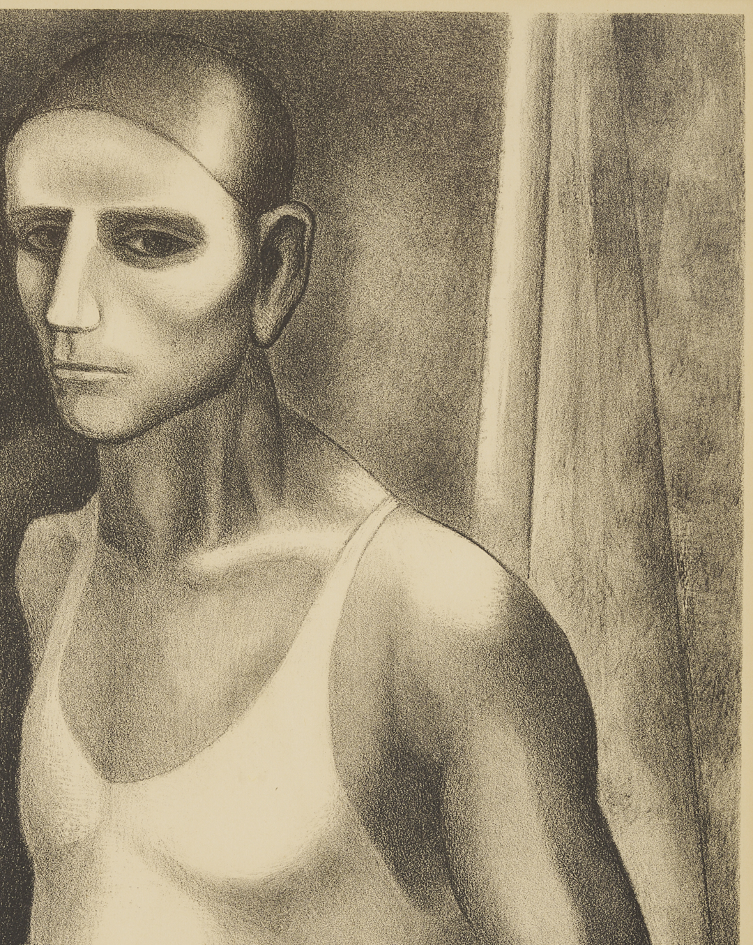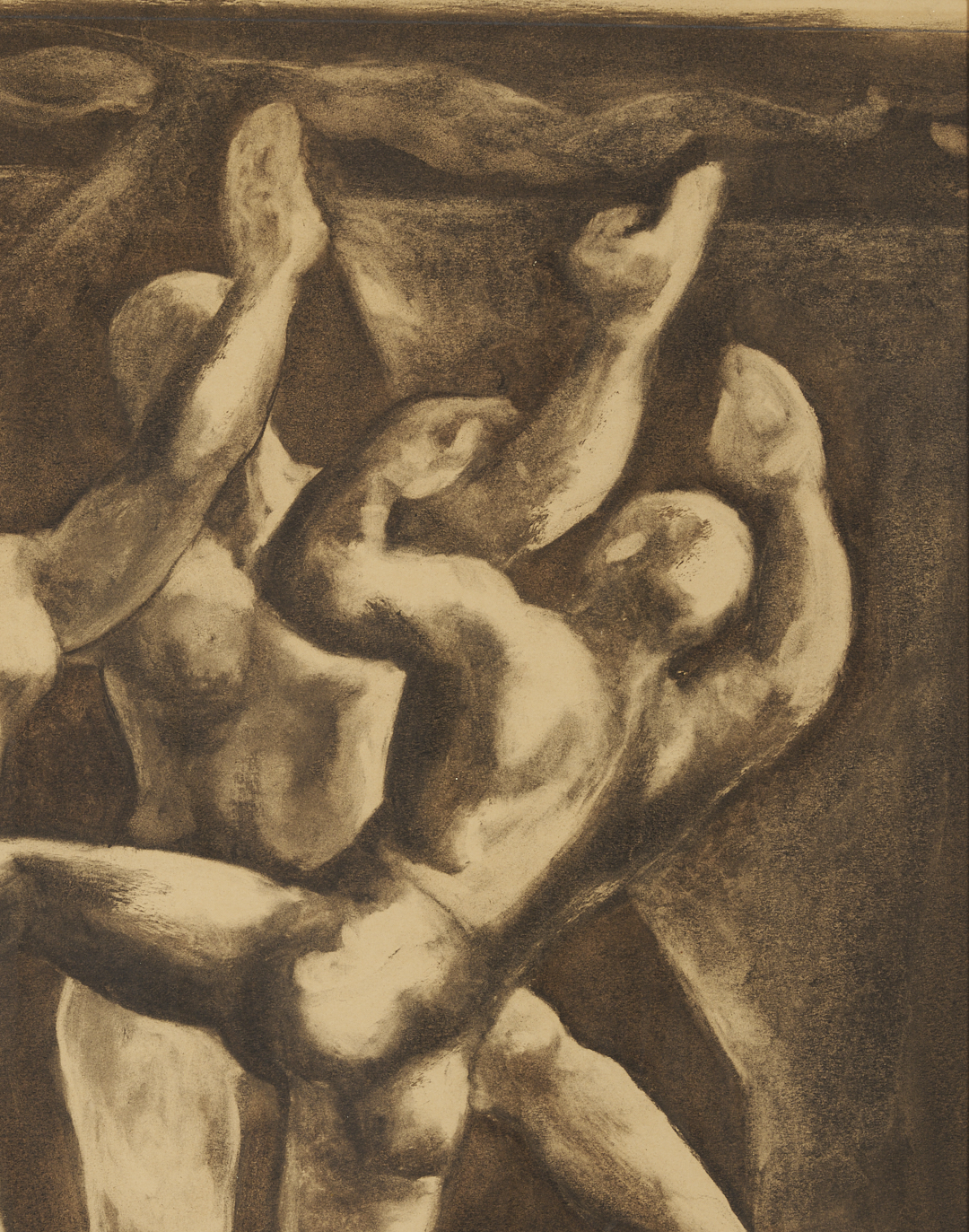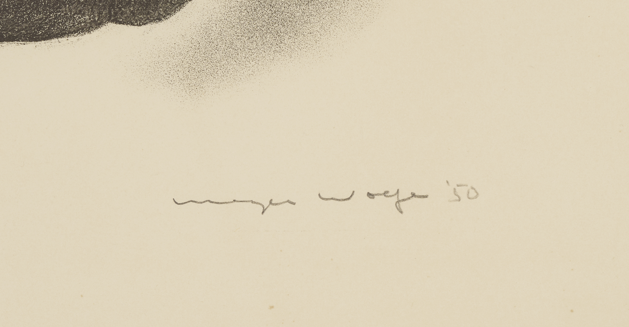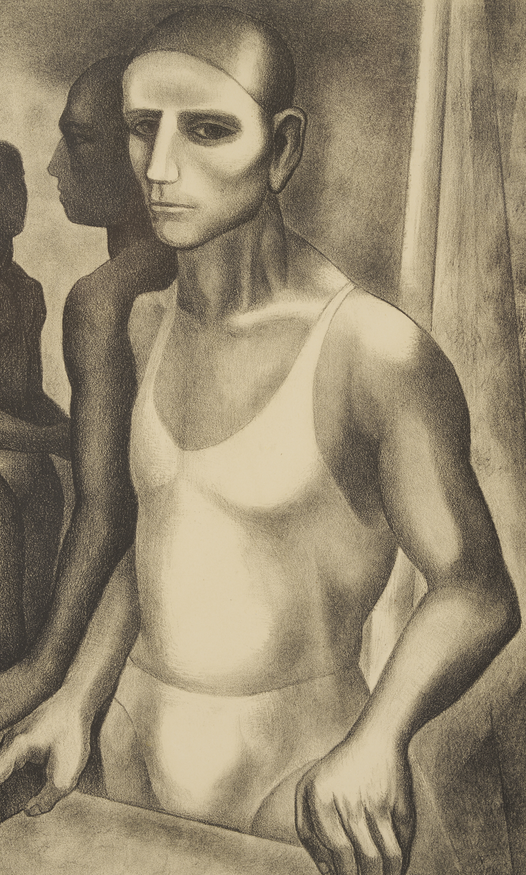 Three (3) Meyer R. Wolfe (Tennessee/New York, 1897-1985) signed works on paper with depictions of male acrobats. 1st item: Charcoal drawing on paper that depicts three full-length acrobats who strike dynamic poses as they perform or practice, 1953. Signed and dated lower left. Housed under glass in a painted wooden frame with tan mat. Sight: 21 3/4 in. H x 18 1/2 in. W. Framed: 31 1/8 in. H x 27 3/4 in. W. 2nd-3rd items: Two (2) lithographs, one with a three-quarters length primary figure in repose and one with three full-length primary figures engaged in an acrobatic display. Both pencil signed lower right. Lithograph with three-quarters length figure titled “Acrobats #5,” lower left. Lithograph with central figural group dated 1950, lower right. Both housed under glass in ebonized wood frames with cream mats. “Acrobats #5” sight: 14 1/8 in. H x 10 1/8 in. W. “Acrobats #5” framed: 21 1/4 in. H x 16 3/4 in. W. Untitled lithograph sight: 15 5/8 in. H x 11 5/8 in. W. Untitled lithograph framed: 24 3/4 in. H x 20 3/4 in. W. Biography: Meyer (“Mike”) Wolfe was born into a Jewish Lithuanian immigrant family, the second of ten children. He was raised in a low-income, multiracial neighborhood of Nashville just north of the Tennessee State Capitol, where he observed the social and cultural lives of his African American friends. As a teen with an interest in drawing, he became a protege of Pulitzer Prize winning Nashville cartoonist Carey Orr. In 1917 he studied briefly at the Art Institute of Chicago and worked as an illustrator. In 1918 he moved to New York and met Ashcan School painter John Sloan, who became one of his most influential teachers. Wolfe traveled to Paris in 1926 to train at the Academie Julian in Paris. While overseas, he met (and later married) the fashion photographer Louise Dahl-Wolfe. Meyer exhibited at the San Francisco Art Association, the New York 1939 World’s Fair, and in Nashville, where he later returned to live. However, much of his later life was spent supporting and managing his wife’s career, and as a result, many of Wolfe’s paintings and prints were never publicly shown or sold. His narrative lithographs of African American life in Nashville during the 1930s are considered among his most important works and very rarely come on the market. His work is also held by the National Museum of American Art-Smithsonian Institution, the Tennessee State Museum, and the Frederick R. Weisman Art Museum, Minneapolis. Sources: “Meyer Wolfe: The Star of All Things” (digital exhibit catalog for the 2021 exhibit at the Nashville Parthenon); Dr. Lawrence Wolfe; Robert Ikard, Tennessee Historical Quarterly, Summer, 2007.