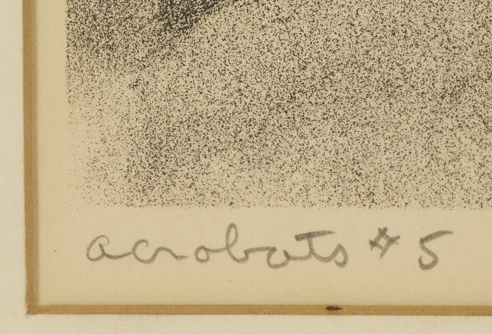 All items in overall very good condition. Item 1 with pinholes to corners plus accretions or grime to mat. Items 2 and 3 both with abrasions and minor losses to frames, especially to corners. “Acrobats #5” with mildew to lower edge of mat. Not examined out of frames.