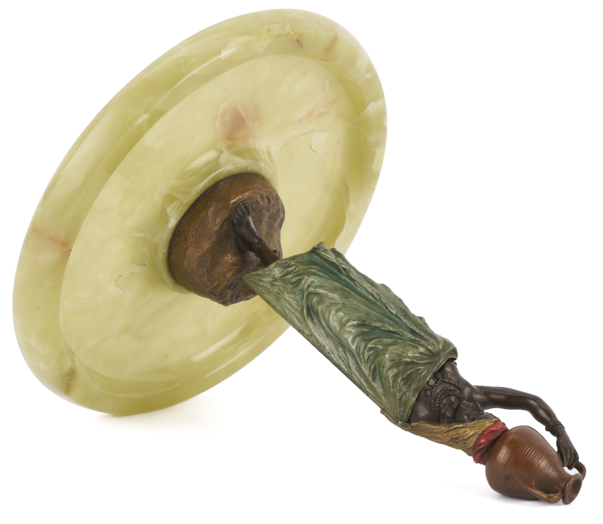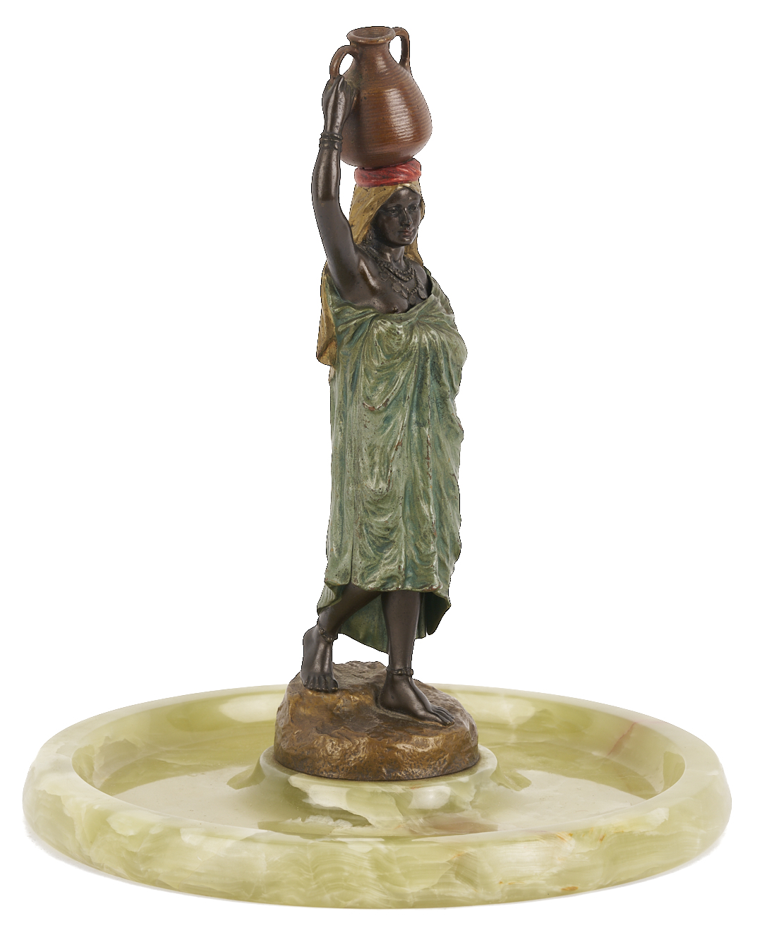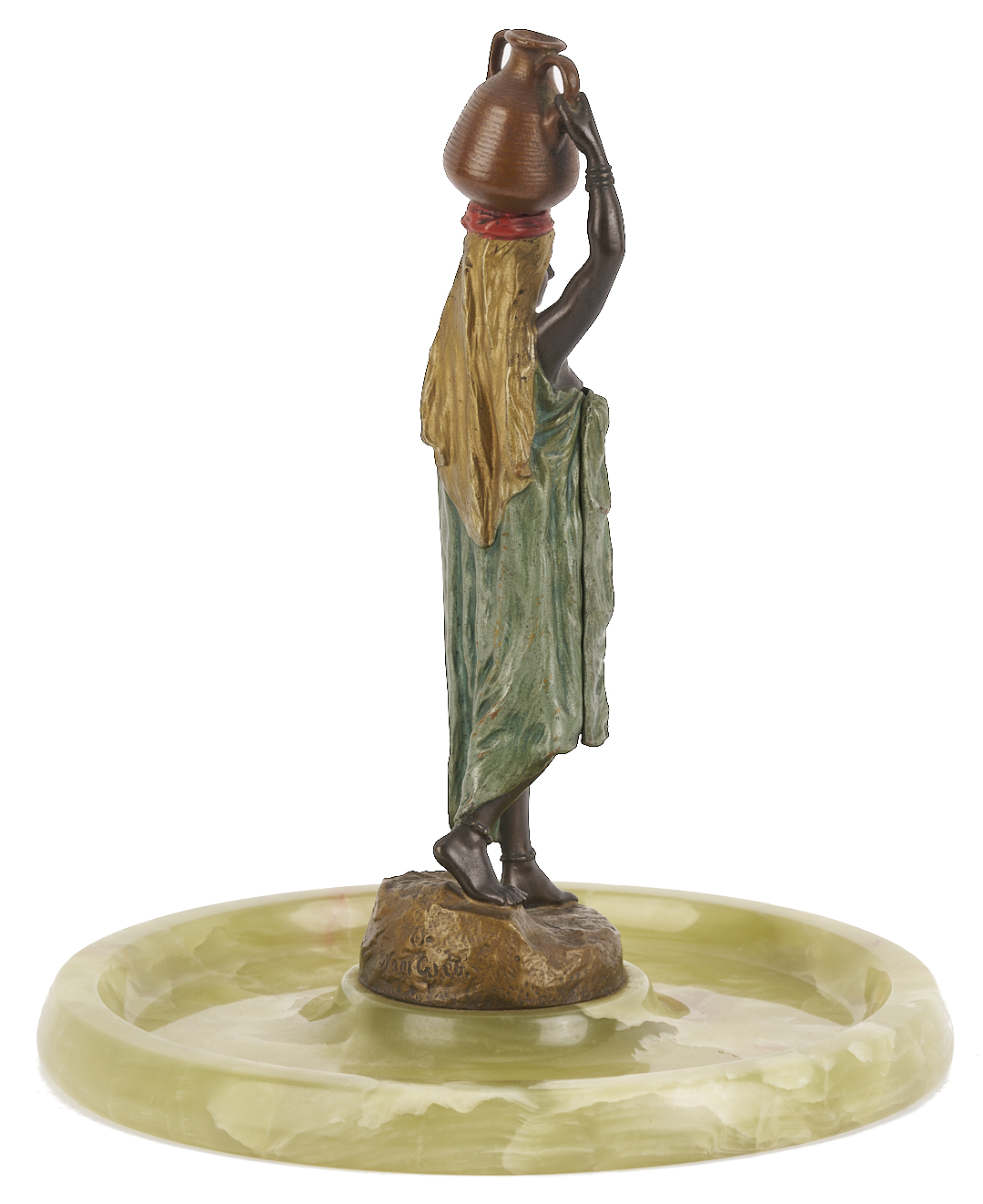 Franz Xavier Bergmann (Austrian/American, 1861-1936) cold-painted bronze sculpture depicting an exotic, partially nude woman standing and holding a water ewer on her turban-wrapped head, attired in green drapery, which opens to reveal her nude body, and resting on a naturalistic base. Additionally fitted with a circular green hardstone base, possibly an ashtray. The side of the naturalistic base with the “B’ within an urn form cartouche foundry mark and signed “Nam Greb”. The underside of the hardstone base is marked MADE IN AUSTRIA. 10 1/2 in. total H. Sculpture measures 9 3/4 in. H.