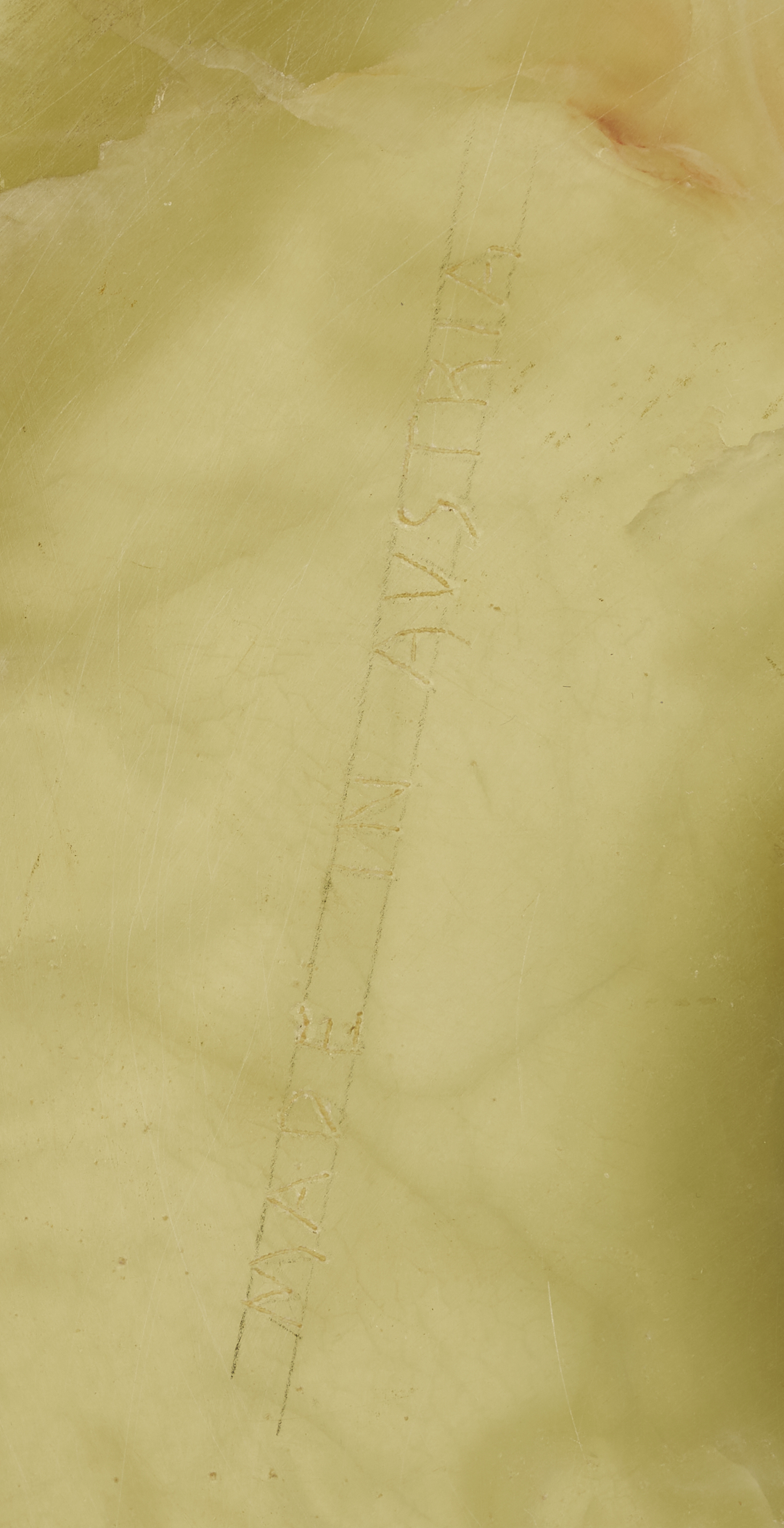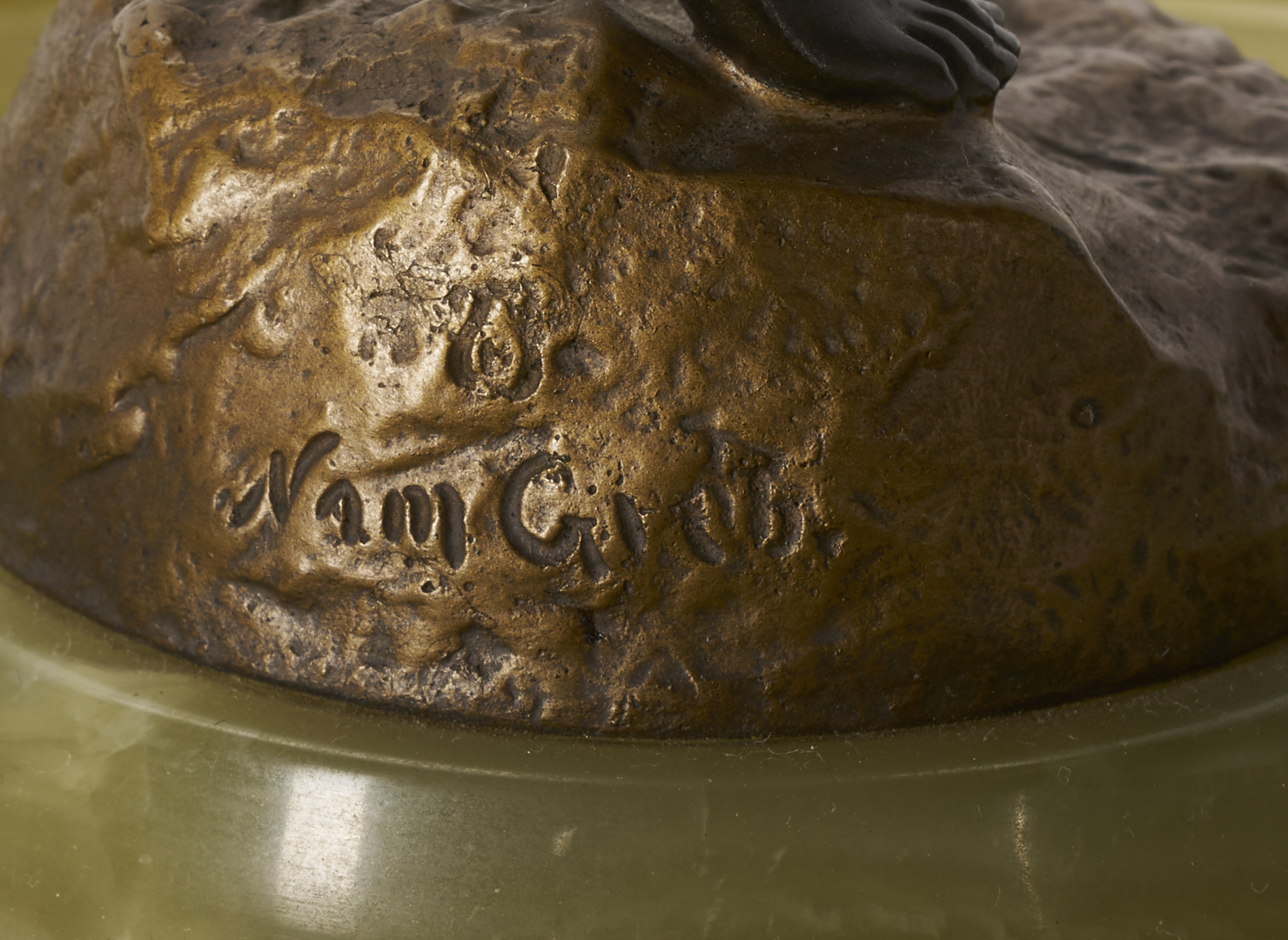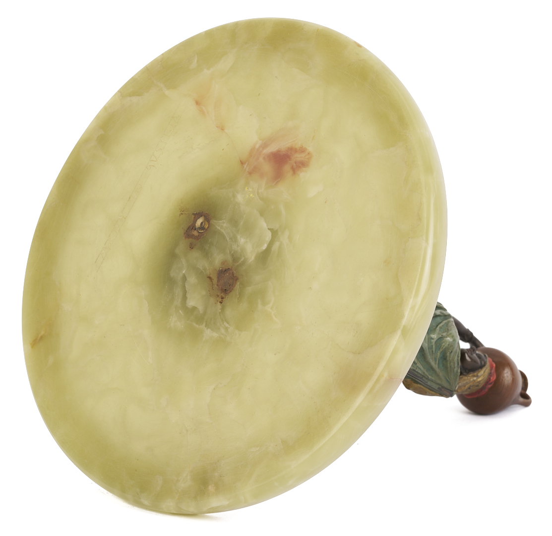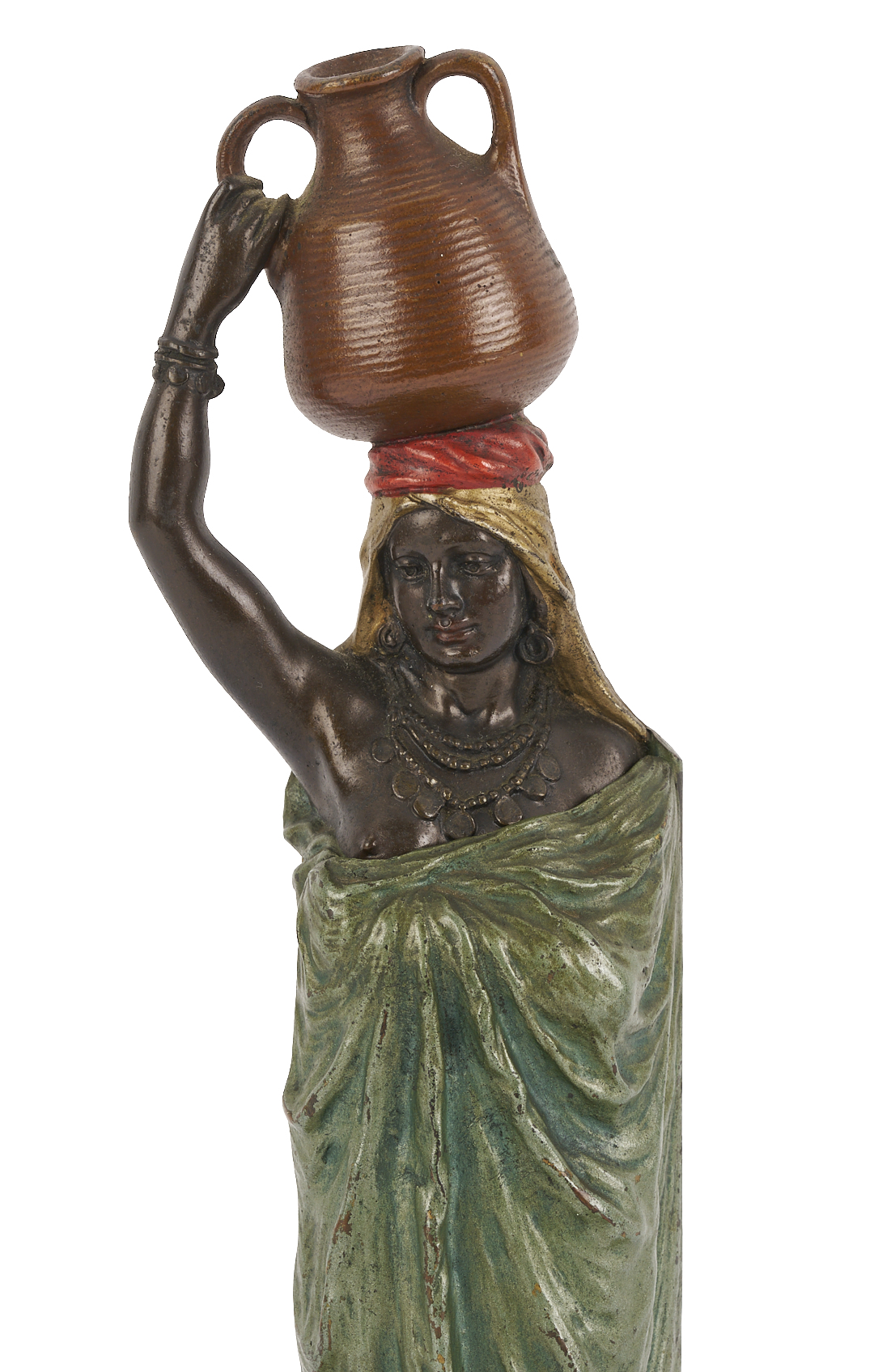 Franz Xavier Bergmann (Austrian/American, 1861-1936) cold-painted bronze sculpture depicting an exotic, partially nude woman standing and holding a water ewer on her turban-wrapped head, attired in green drapery, which opens to reveal her nude body, and resting on a naturalistic base. Additionally fitted with a circular green hardstone base, possibly an ashtray. The side of the naturalistic base with the “B’ within an urn form cartouche foundry mark and signed “Nam Greb”. The underside of the hardstone base is marked MADE IN AUSTRIA. 10 1/2 in. total H. Sculpture measures 9 3/4 in. H.