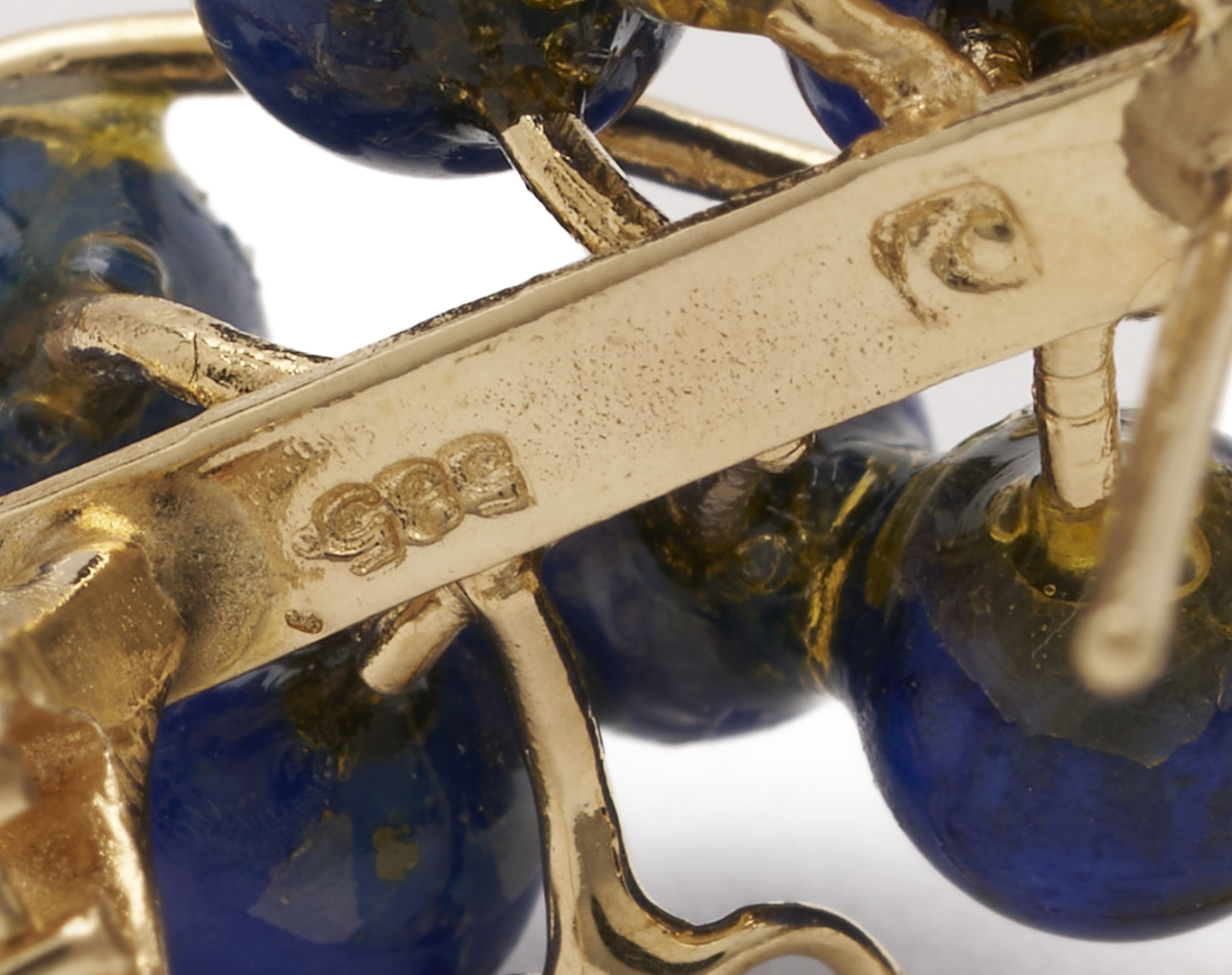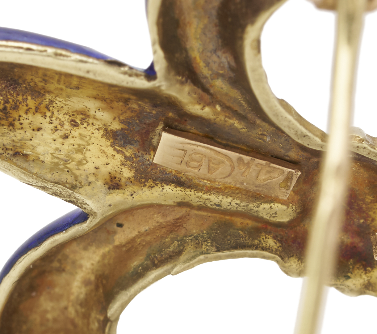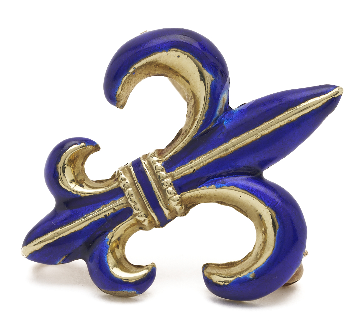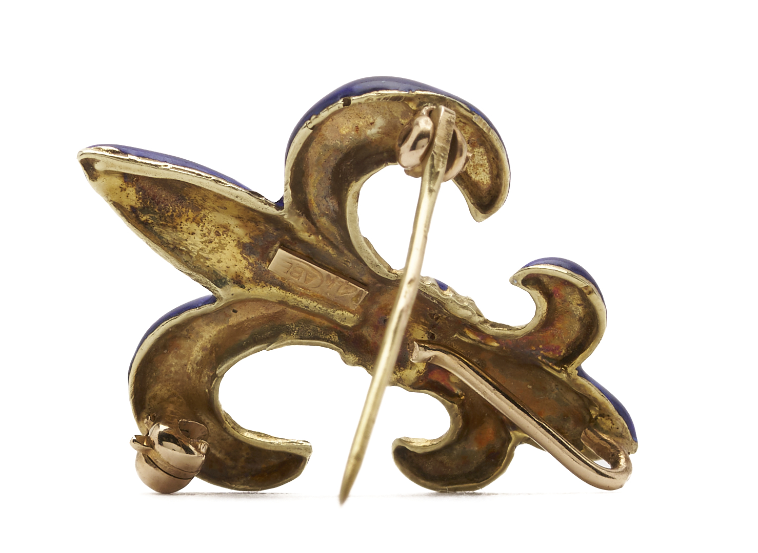 1st item: Ladies’ 14K yellow gold pieced clip back pair of earrings featuring sixteen (16) lapis lazuli beads. The earrings are marked “585” and XRF test 14K gold. The earrings are 7/8 in. x 3/4 in. and have a gross weight of 6.24 grams. 2nd item: Ladies’ 14K yellow gold blue enamel Fleur de Lis brooch. The brooch is marked “14K” and XRF tests 14K gold. The brooch is 1 3/4 in. and has a gross weight of 3.62 grams. Total weight of lot – 9.86 grams.