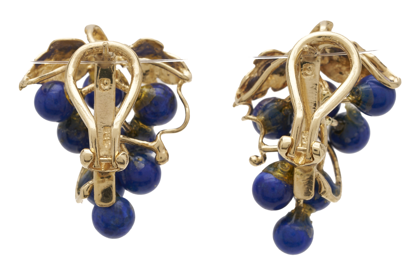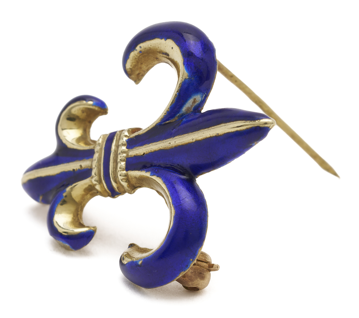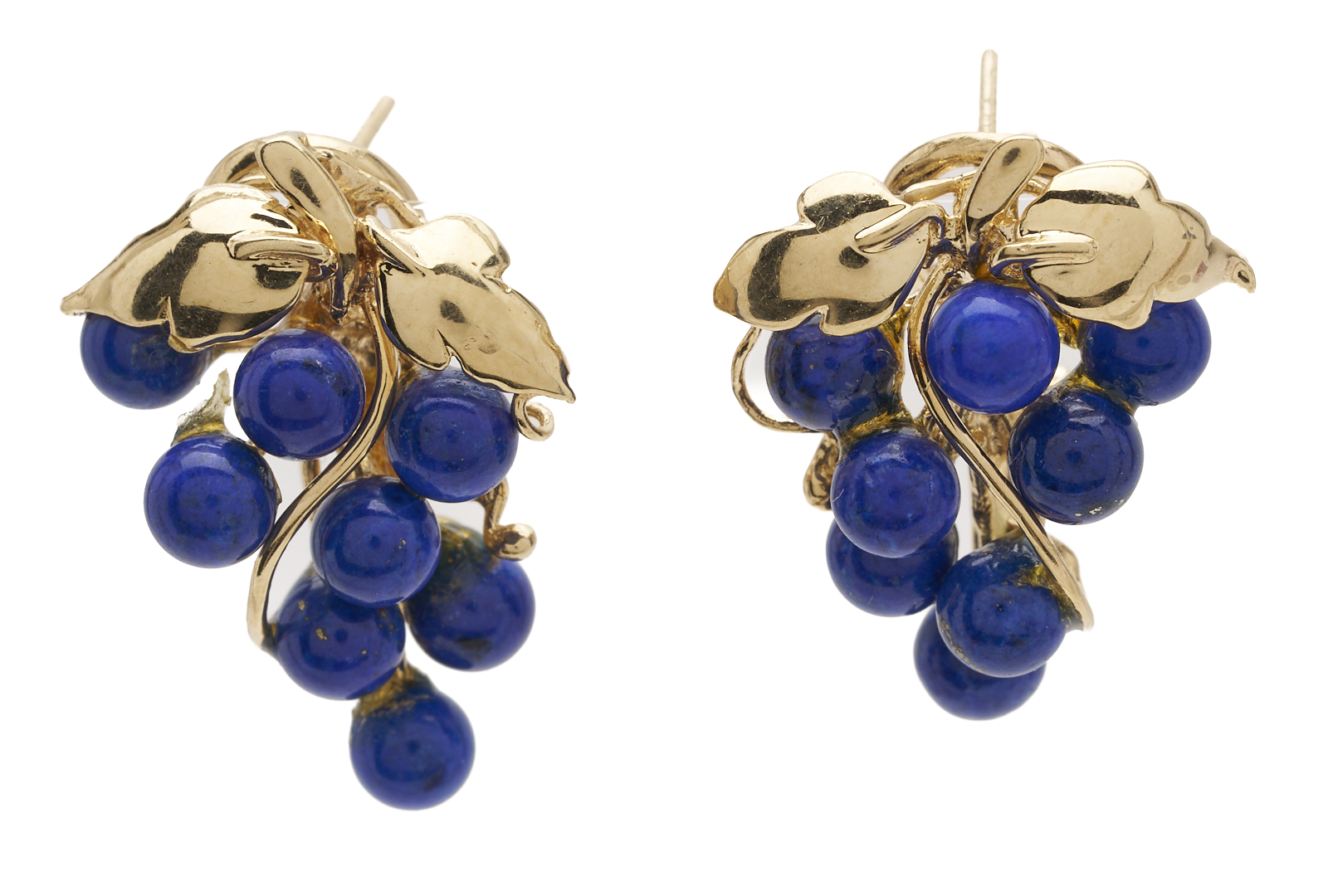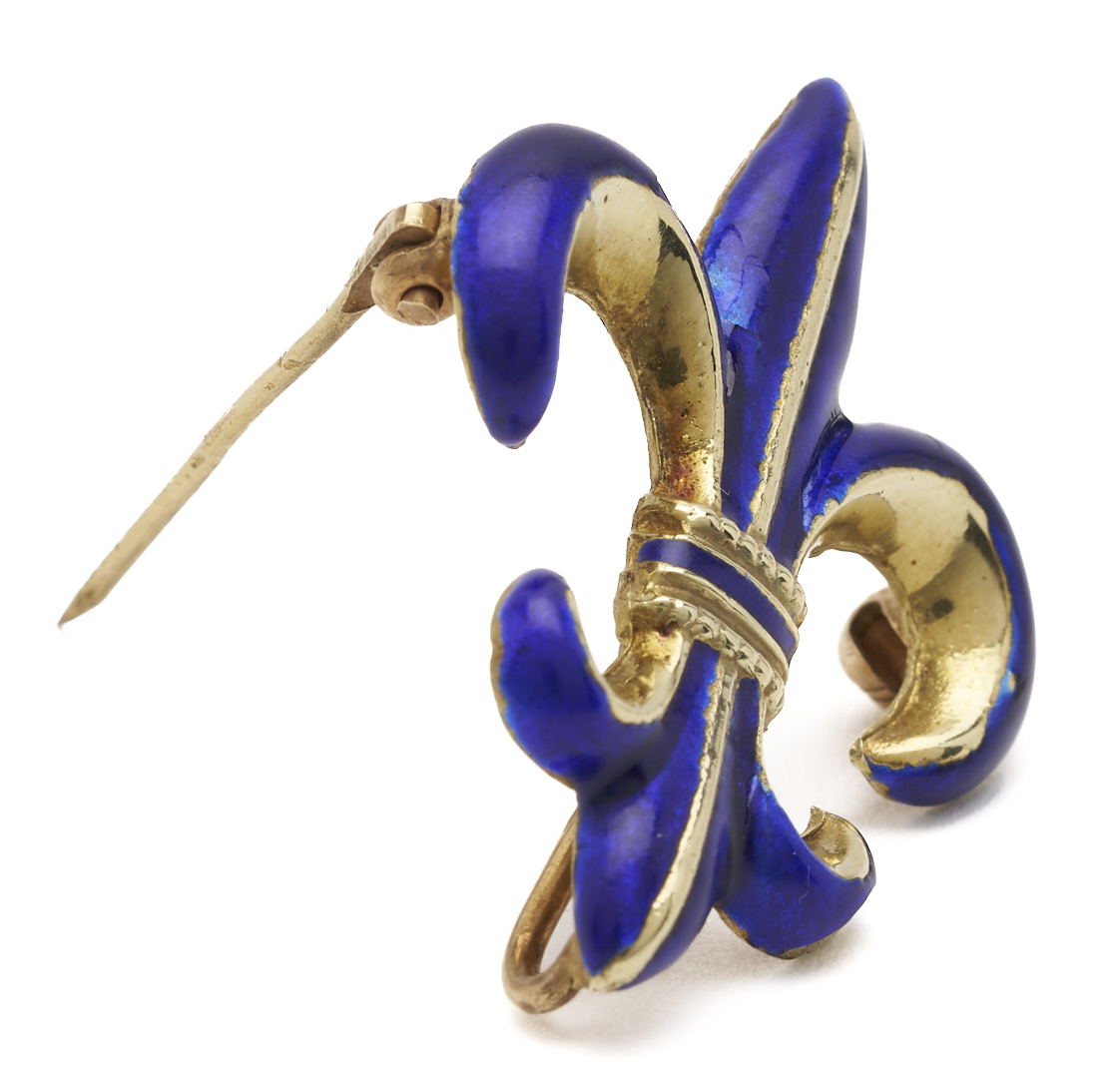 1st item: Ladies’ 14K yellow gold pieced clip back pair of earrings featuring sixteen (16) lapis lazuli beads. The earrings are marked “585” and XRF test 14K gold. The earrings are 7/8 in. x 3/4 in. and have a gross weight of 6.24 grams. 2nd item: Ladies’ 14K yellow gold blue enamel Fleur de Lis brooch. The brooch is marked “14K” and XRF tests 14K gold. The brooch is 1 3/4 in. and has a gross weight of 3.62 grams. Total weight of lot – 9.86 grams.