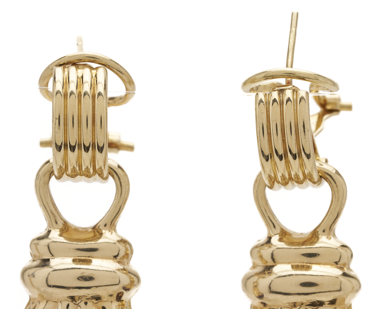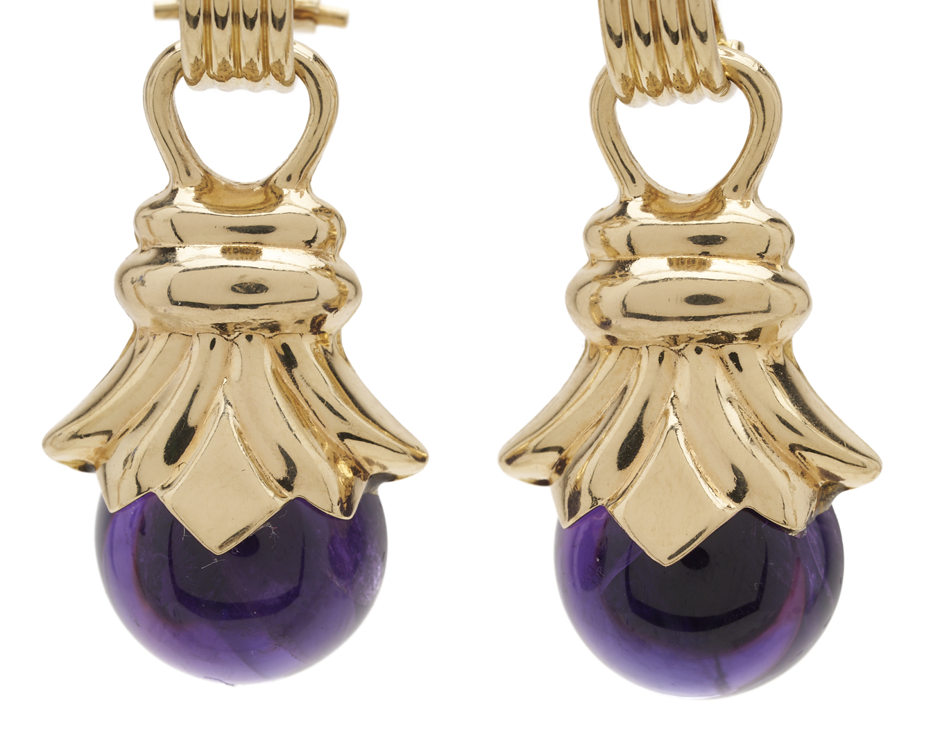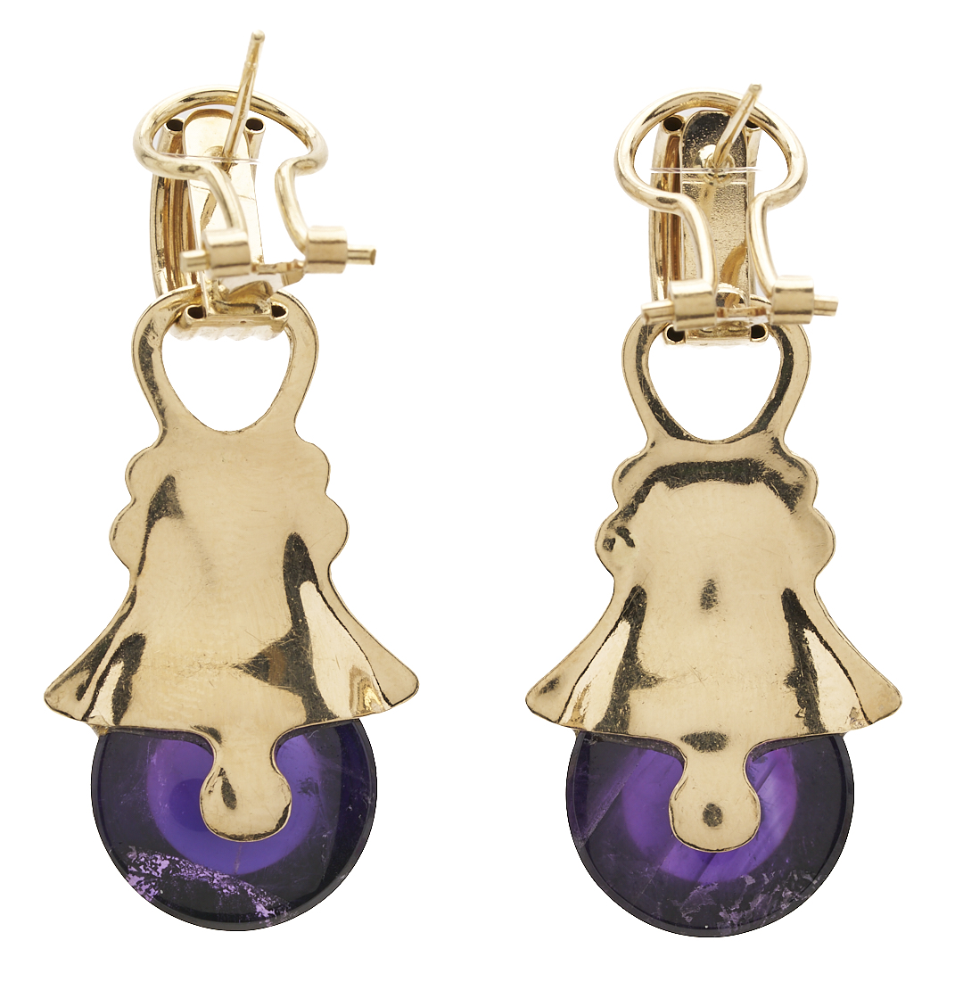 Ladies’ 14K yellow gold pair of pierced clip back drop earrings featuring two (2) amethyst. The earrings are marked “14K” and XRF test 14K gold. The earrings are 1 1/2 in. x 3/4 in. and have a gross weight of 11.96 grams.