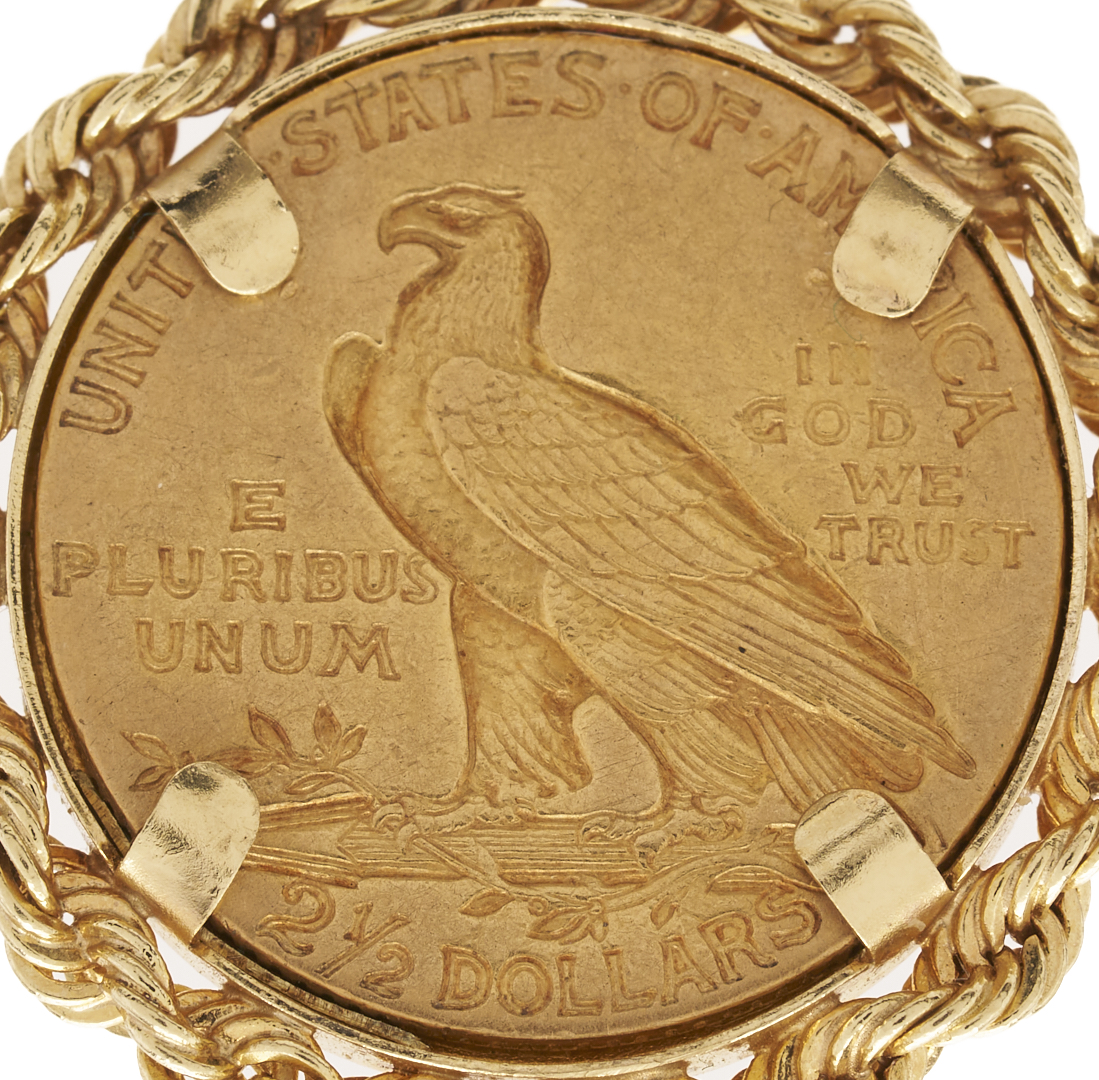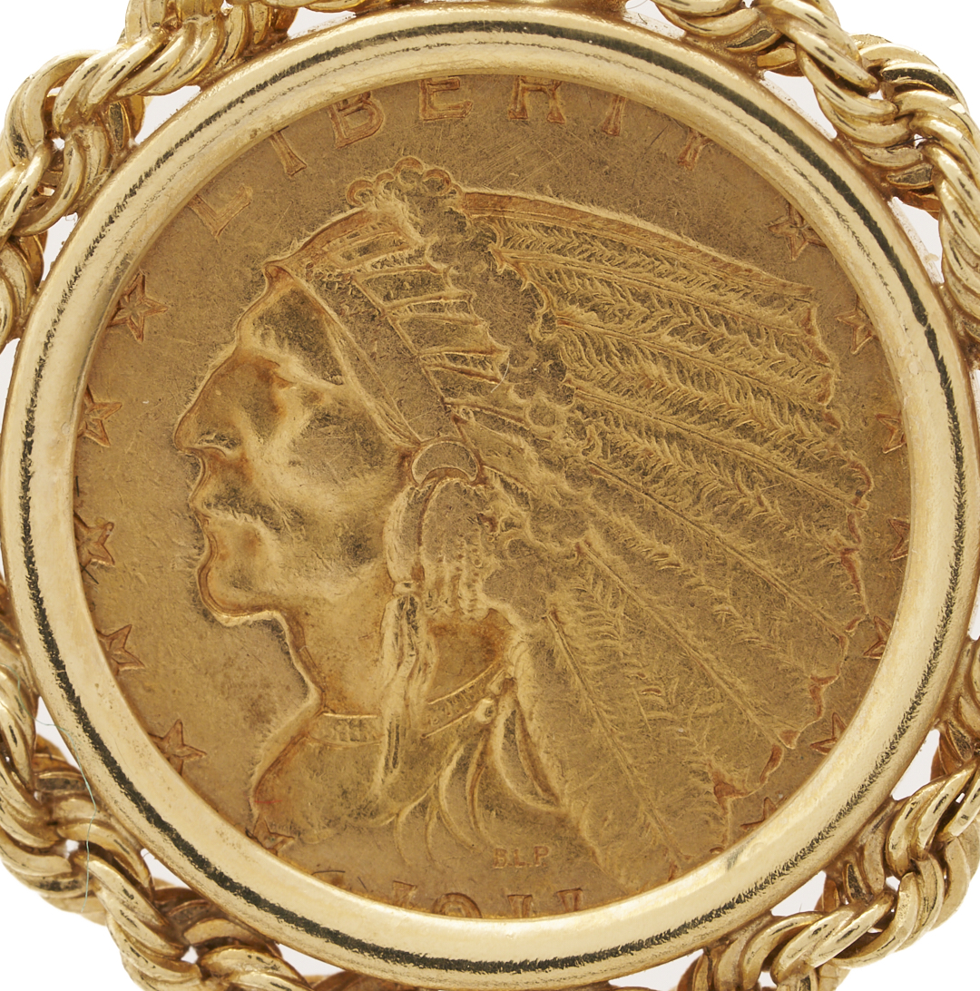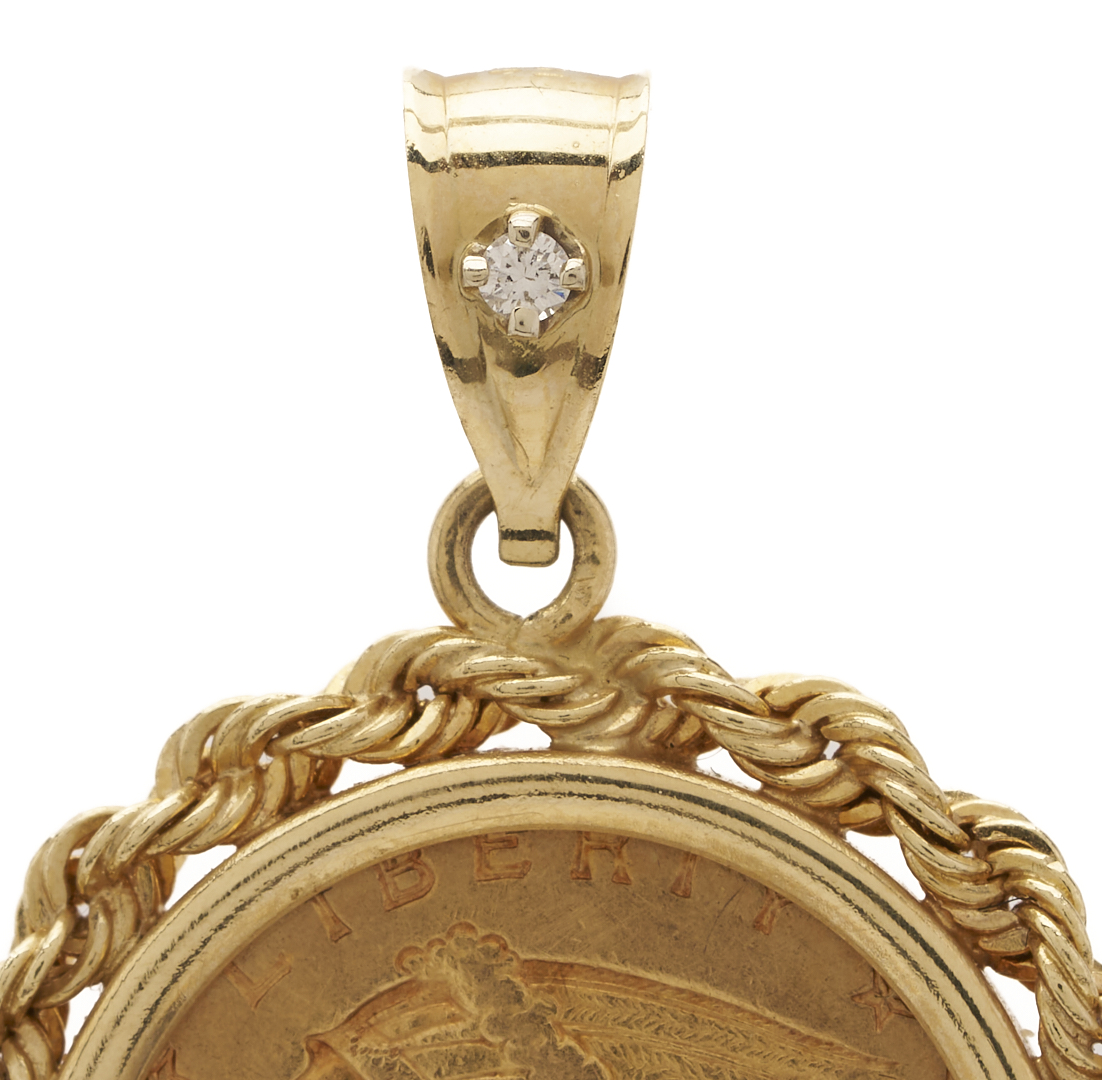 Ladies’ 14K yellow gold pendant bezel featuring one (1) 1911 Indian $5 gold piece. The pendant is marked “14K” and XRF tests 14K gold. The coin XRF tests 90% gold. The pendant is 1 1/4 in. x 7/8 in. and has a gross weight of 6.67 grams.