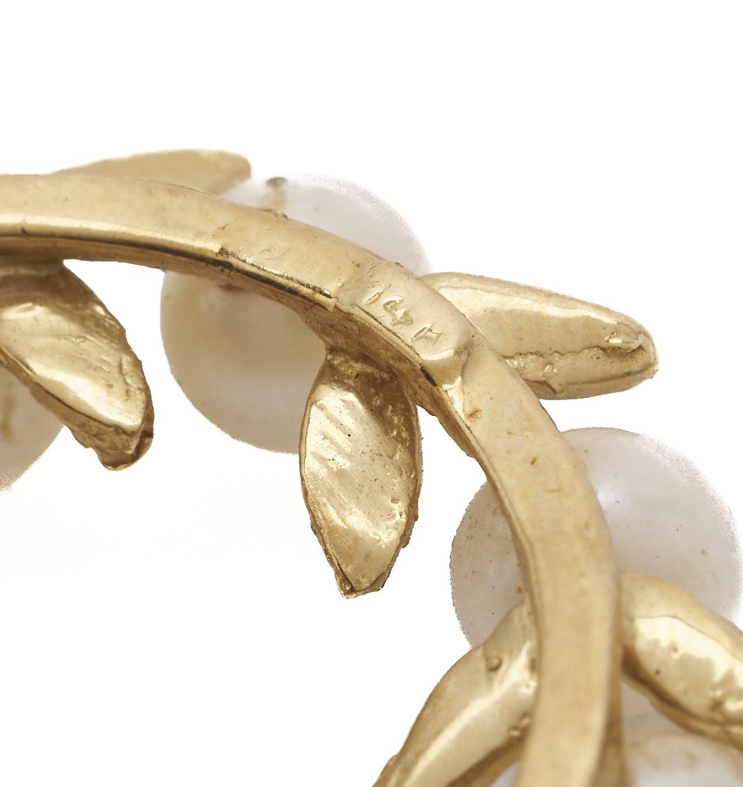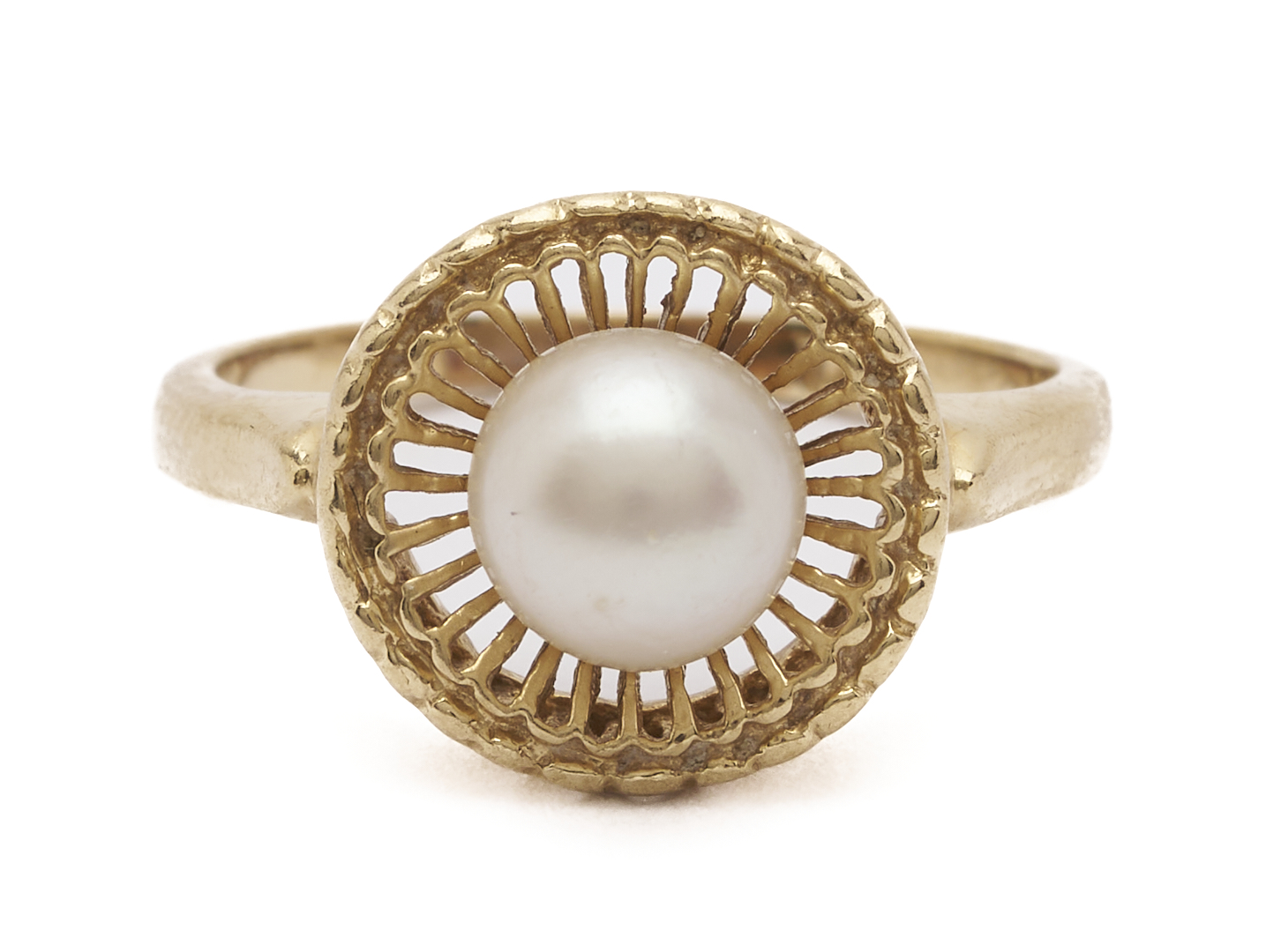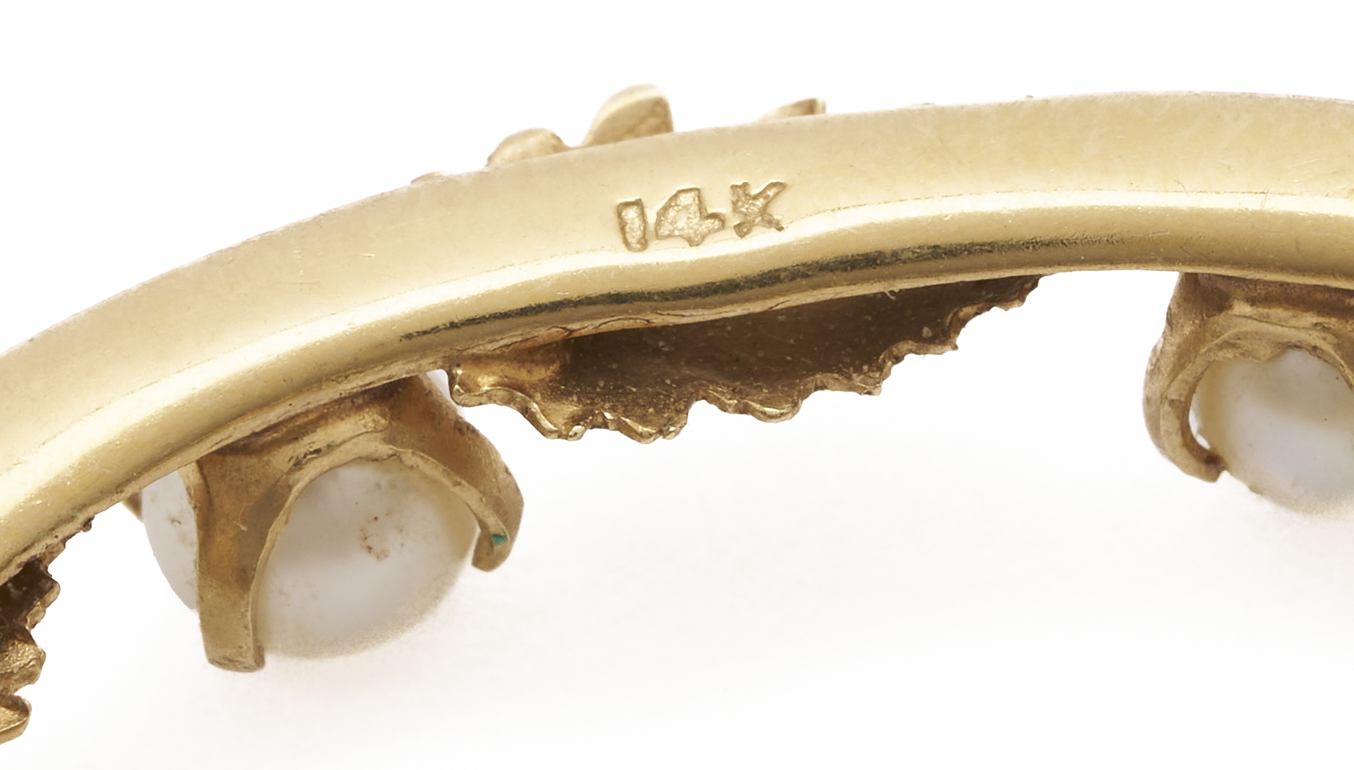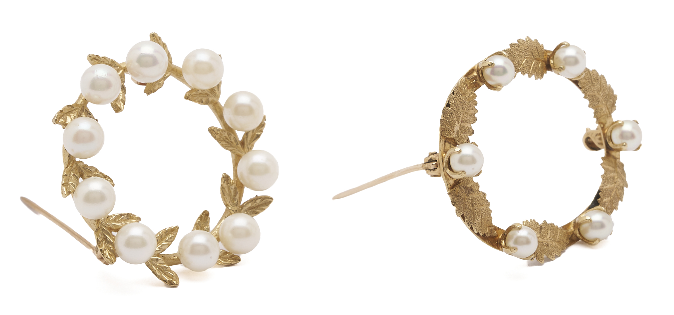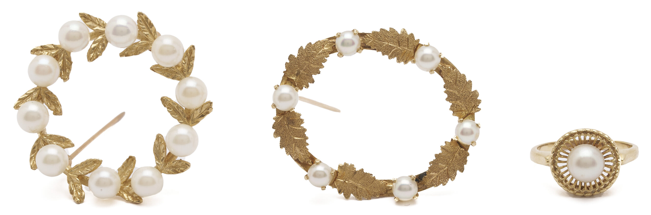 1st item: Ladies’ 14K yellow gold circular floral wreath brooch featuring ten (10) cultured pearls. The brooch is marked “14K” and XRF tests 14K gold. The brooch is 1 1/8 in. x 1 1/8 in. and has a gross weight of 6.05 grams. 2nd item: Ladies’ 14K yellow gold oval floral wreath brooch featuring six (6) cultured pearls. The brooch is marked “14K” and XRF tests 14K gold. The brooch is 1 1/4 in. x 1 in. and has a gross weight of 4.28 grams. 3rd item: Ladies’ 14K yellow gold ring featuring one (1) cultured pearl. The ring is marked “14K” and XRF tests 14K gold. The ring is size 3 3/4 and has a gross weight of 2.34 grams. Gross weight of the lot is 12.67 grams.