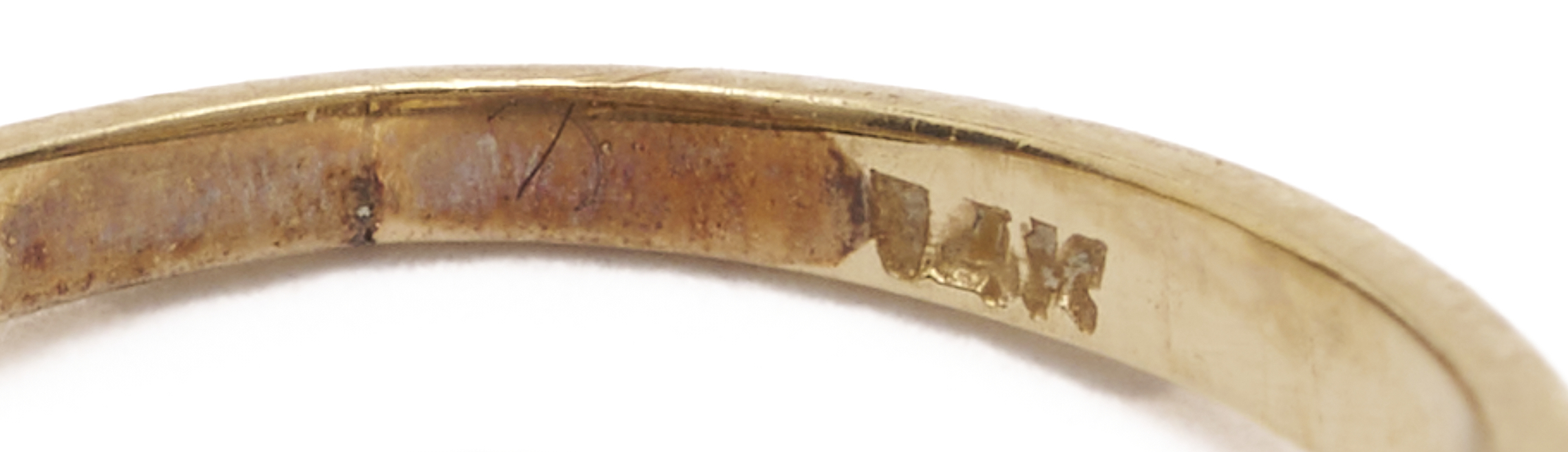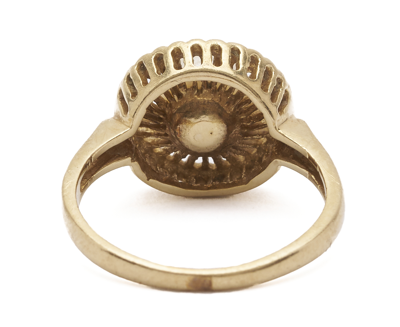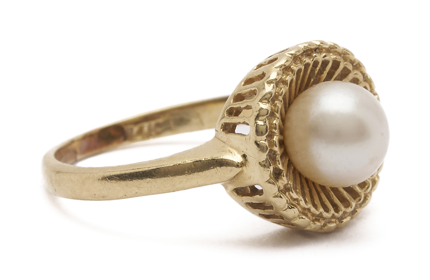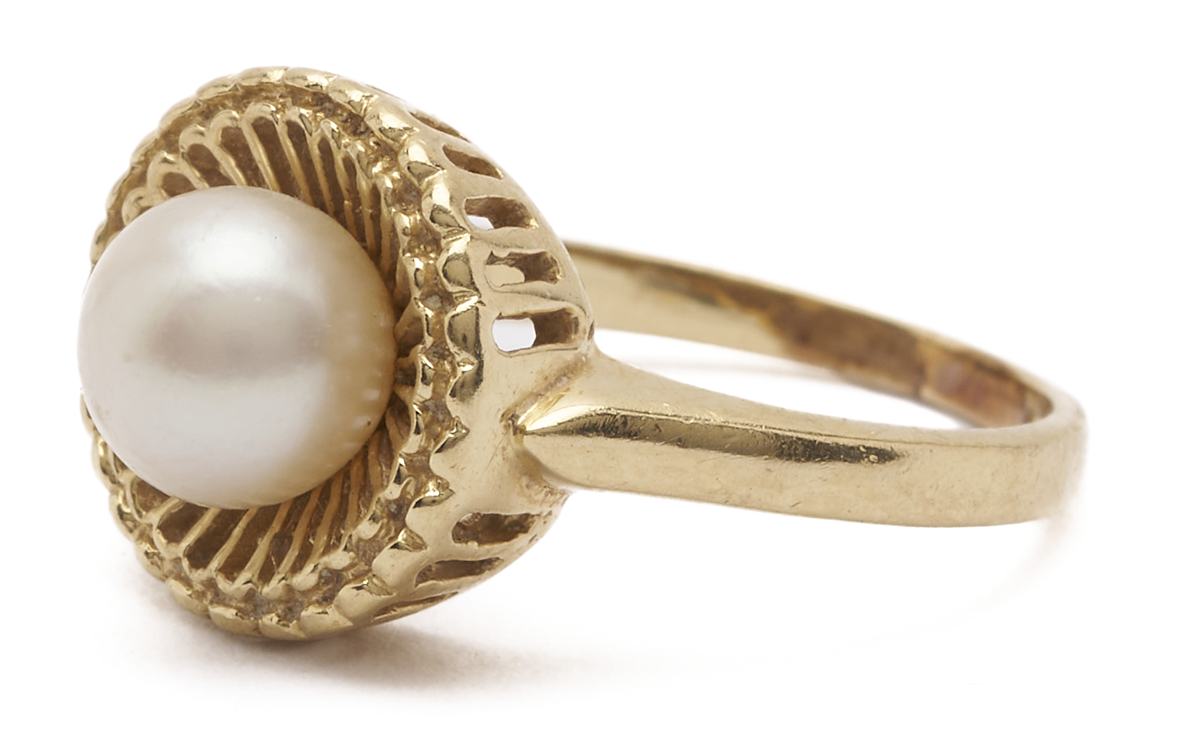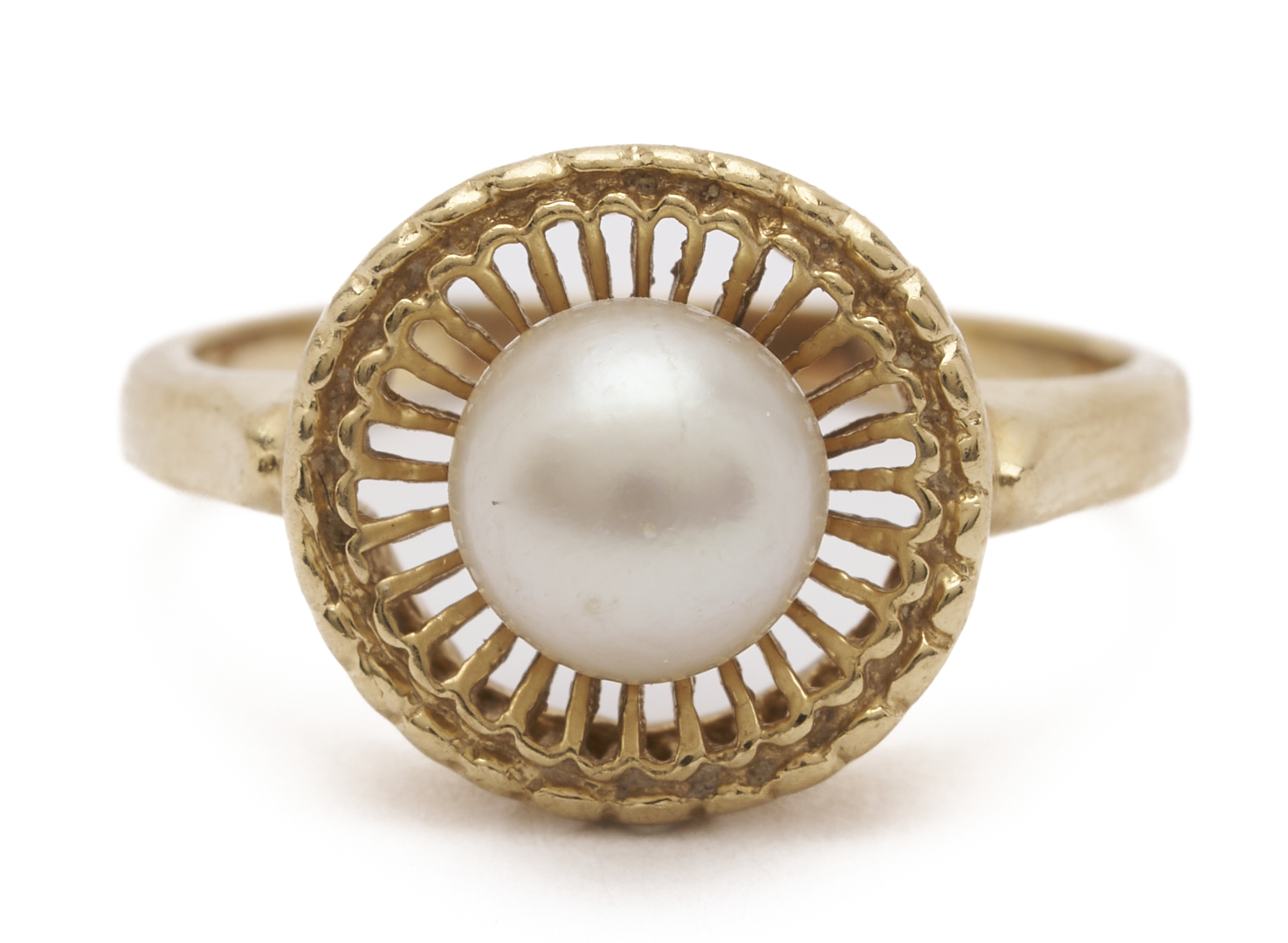 1st item: Ladies’ 14K yellow gold circular floral wreath brooch featuring ten (10) cultured pearls. The brooch is marked “14K” and XRF tests 14K gold. The brooch is 1 1/8 in. x 1 1/8 in. and has a gross weight of 6.05 grams. 2nd item: Ladies’ 14K yellow gold oval floral wreath brooch featuring six (6) cultured pearls. The brooch is marked “14K” and XRF tests 14K gold. The brooch is 1 1/4 in. x 1 in. and has a gross weight of 4.28 grams. 3rd item: Ladies’ 14K yellow gold ring featuring one (1) cultured pearl. The ring is marked “14K” and XRF tests 14K gold. The ring is size 3 3/4 and has a gross weight of 2.34 grams. Gross weight of the lot is 12.67 grams.