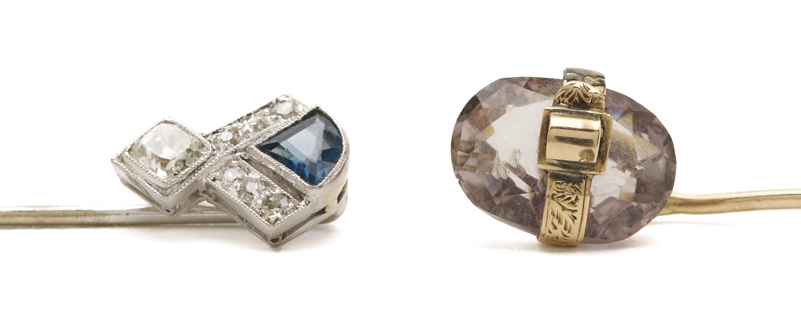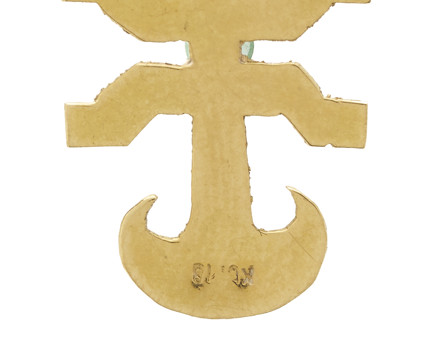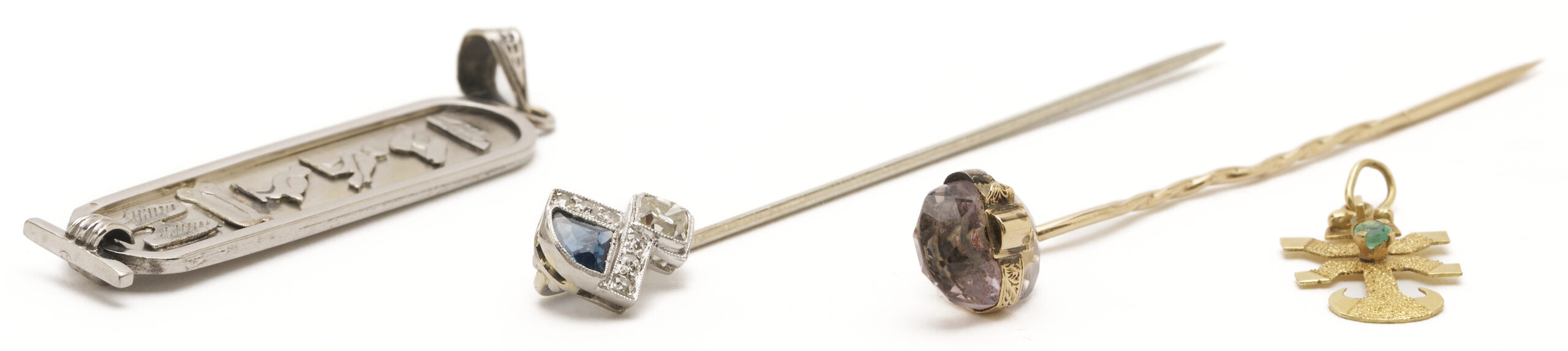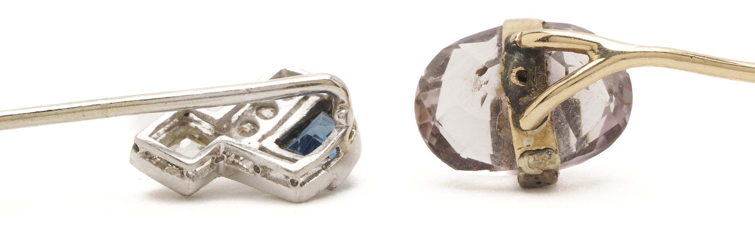 2nd item: Ladies 14K yellow gold and platinum pin featuring one (1) natural shield cut sapphire accented by one (1) square cushion modified mine cut diamond approximately 0.28 carats, Clarity-SI2, Color-L, and six (6) single cut melee diamonds. The pin XRF tests 14K gold, and the pin head XRF tests 90% platinum. The pin is 2 1/2 in. L. and has a gross weight of 1.97 grams. 3rd item: Ladies’ 10K yellow gold pin featuring one (1) oval cut amethyst. The pin XRF tests 10K. The pin is 2 1/2 in. L. and has a gross weight of 1.63 grams. 4th item: Ladies’ 18K yellow gold anchor pendant featuring one (1) natural round cut emerald. The pendant is marked “Kt.18” and XRF tests 18K gold. The pendant is 3/4 in. x 1/2 in. and has a gross weight of 0.60 grams. Gross weight of the lot is 4.20 grams.