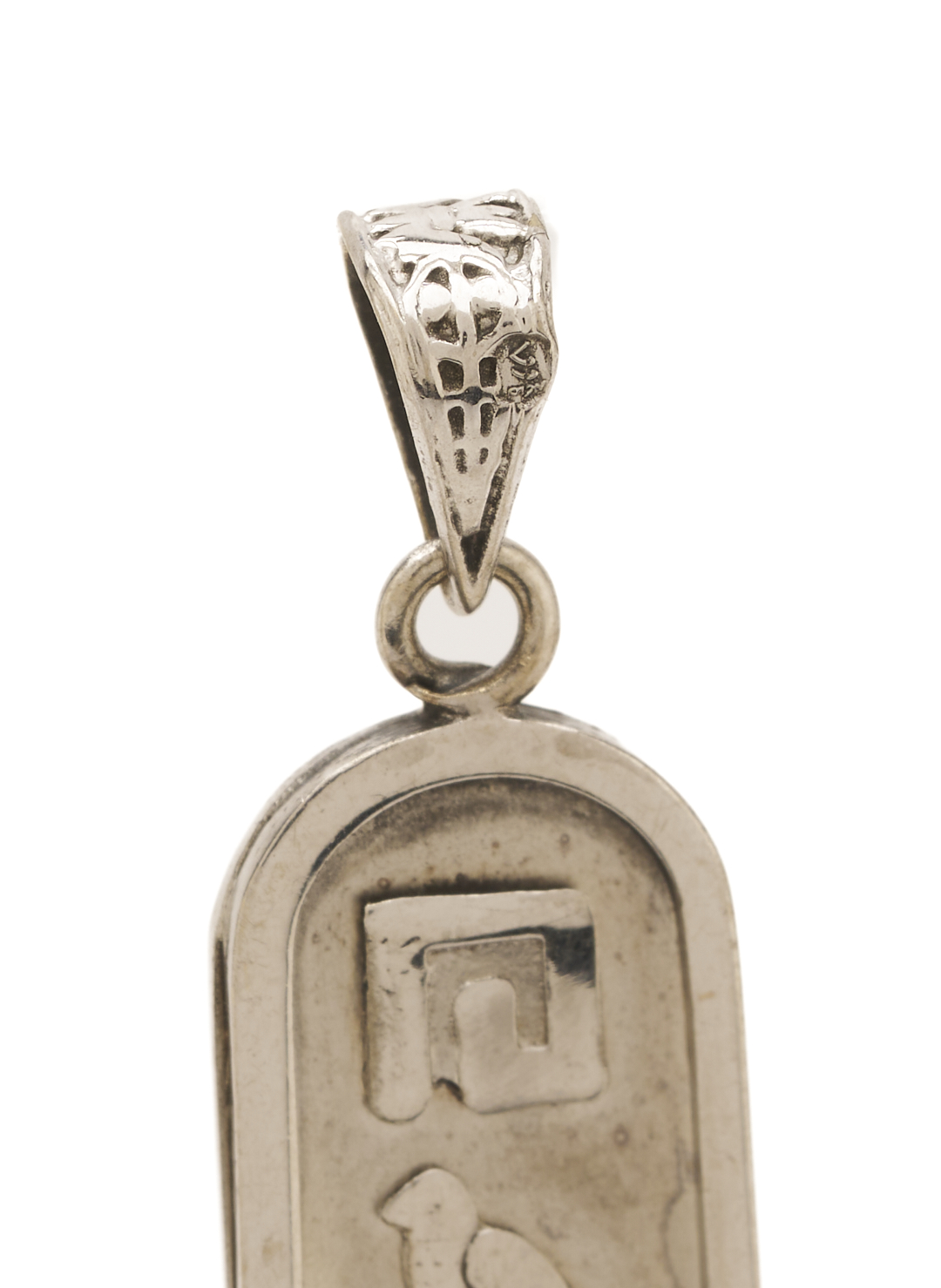 18K white gold hieroglyphic name pendant. The pendant is marked “18K” in Arabic and XRF tests 18K gold. The pendant is 1 7/8 in. x 3/8 in. and weighs 4.28 grams.