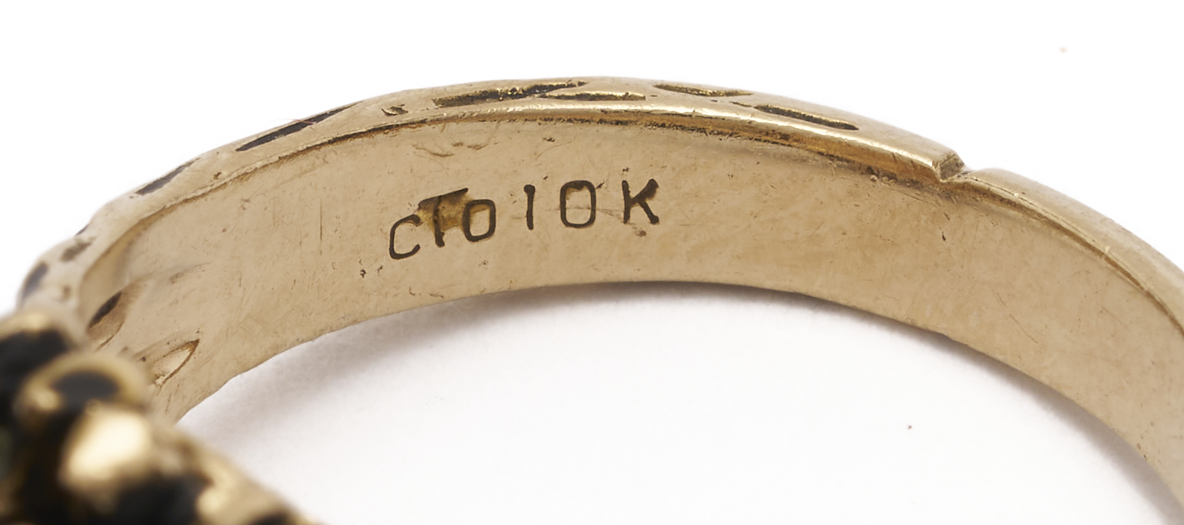 1st Item: Ladies’ 10K yellow gold Victorian ring featuring one (1) cabochon cut garnet accented by thirty-eight (38) rose cut garnets. The ring XRF tests 10K gold and is size 7. The gross weight of the ring is 8.38 grams. 2nd item: Ladies’ 10K yellow gold floral ring featuring one (1) synthetic ruby accented by stamen with carbonization between. The ring is marked “CTO 10K” and XRF tests 10K gold. The ring is size 7 3/4 and has a gross weight of 8.82 grams. Gross weight of the lot is 17.20 grams.