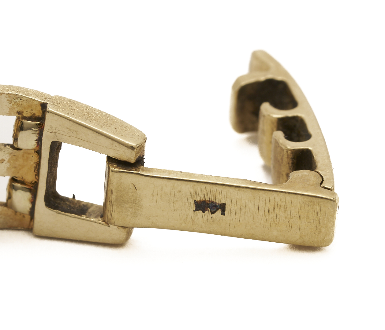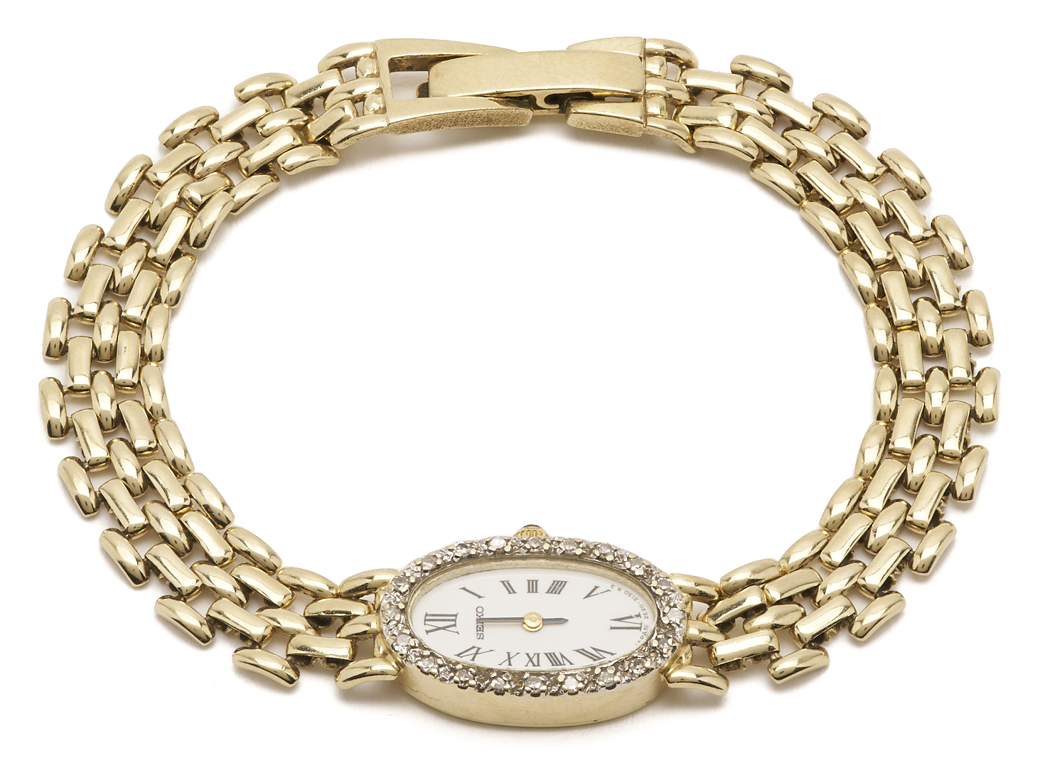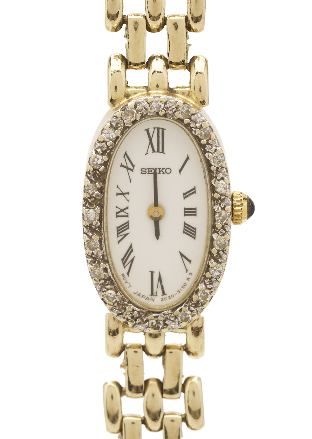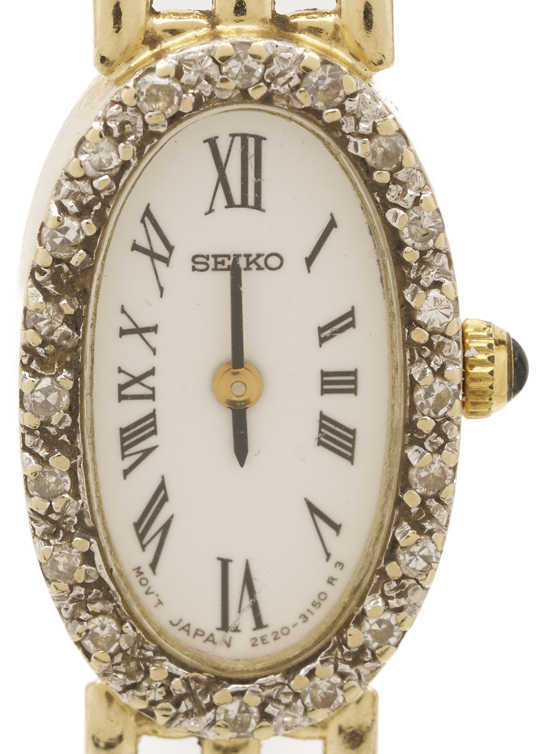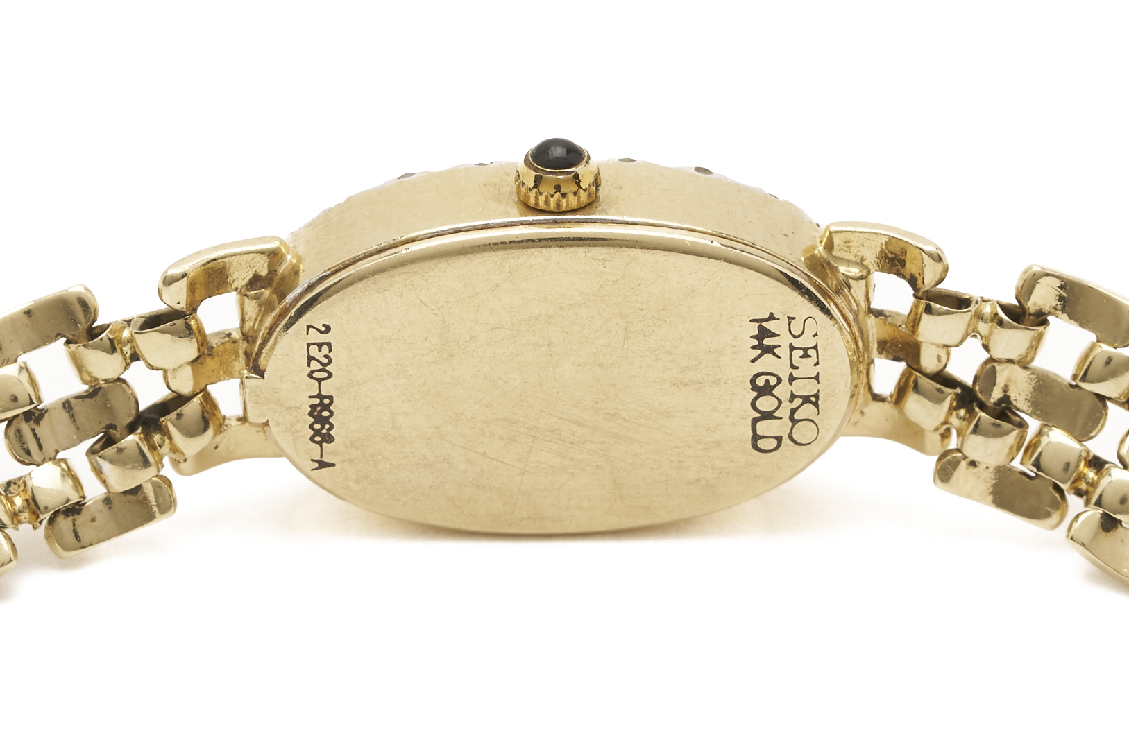Ladies 14K yellow gold Seiko wrist watch featuring a bezel with twenty (20) single-cut melee diamonds, a brick link band, and a white dial with black Roman numeral markers. The watch is marked “14K Gold SEIKO 2e20-r966-a” and XRF tests 14K gold. The watch is 7 in. L. and has a gross weight of 20.58 grams.