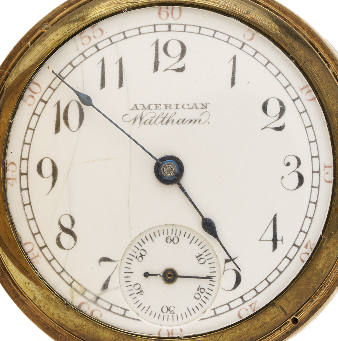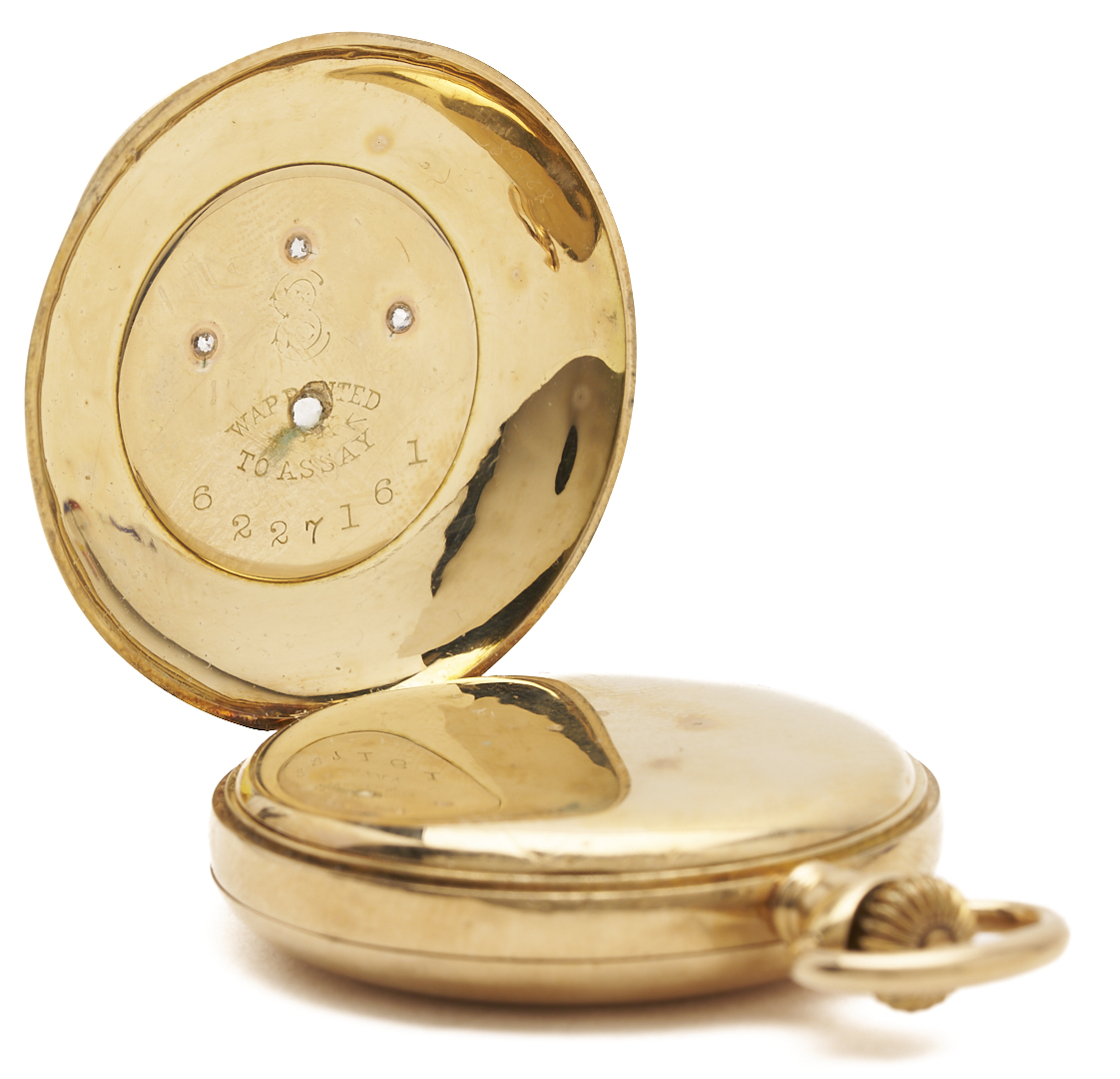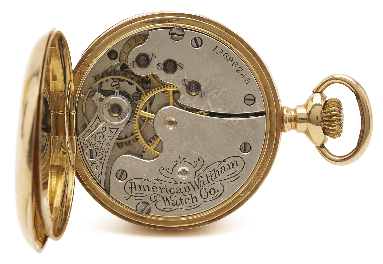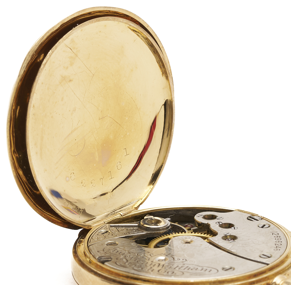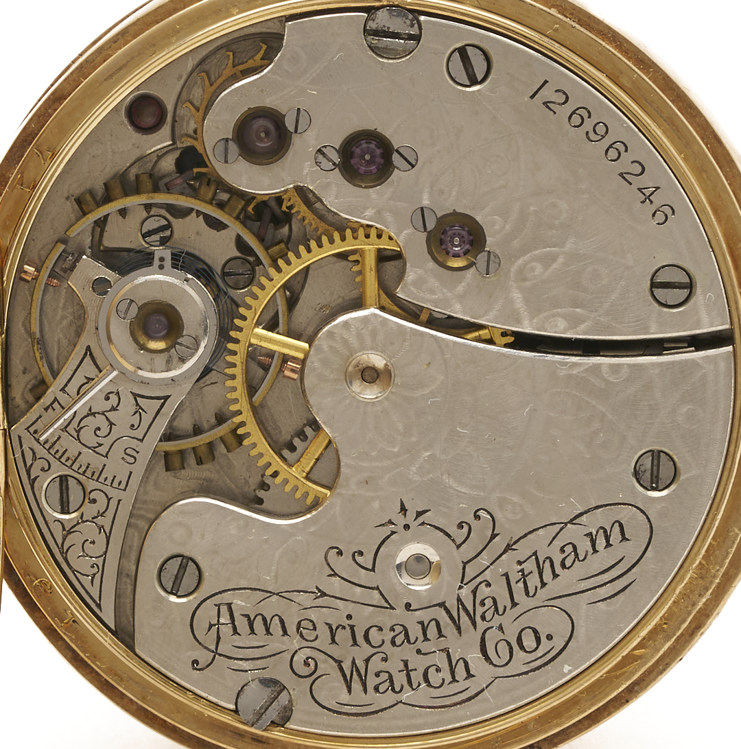 Waltham grade Seaside 7 jewel size 0s pocket watch. The watch is in a 14K yellow gold hunting case containing an engraved fleur-de-lis design with four encrusted stones. The case is marked “14K” and XRF tests 14K gold. The serial number is 12696246 and was produced in 1903. Gross weight of the watch is 30.04 grams.