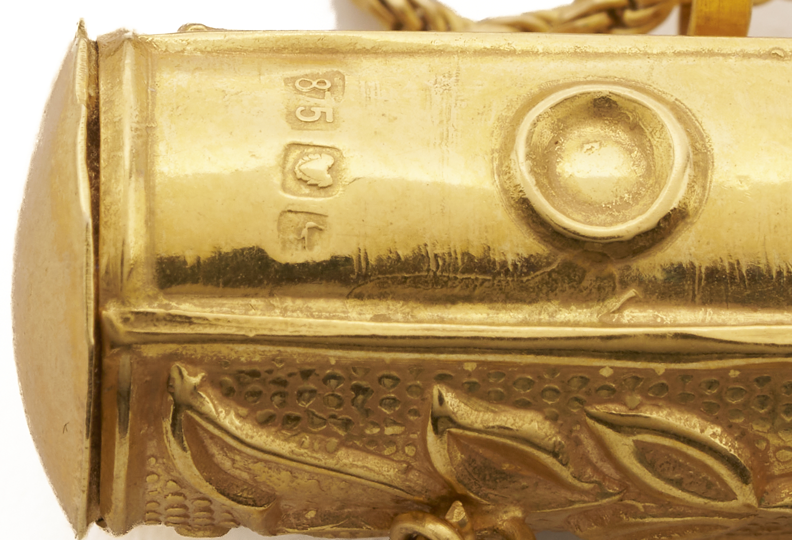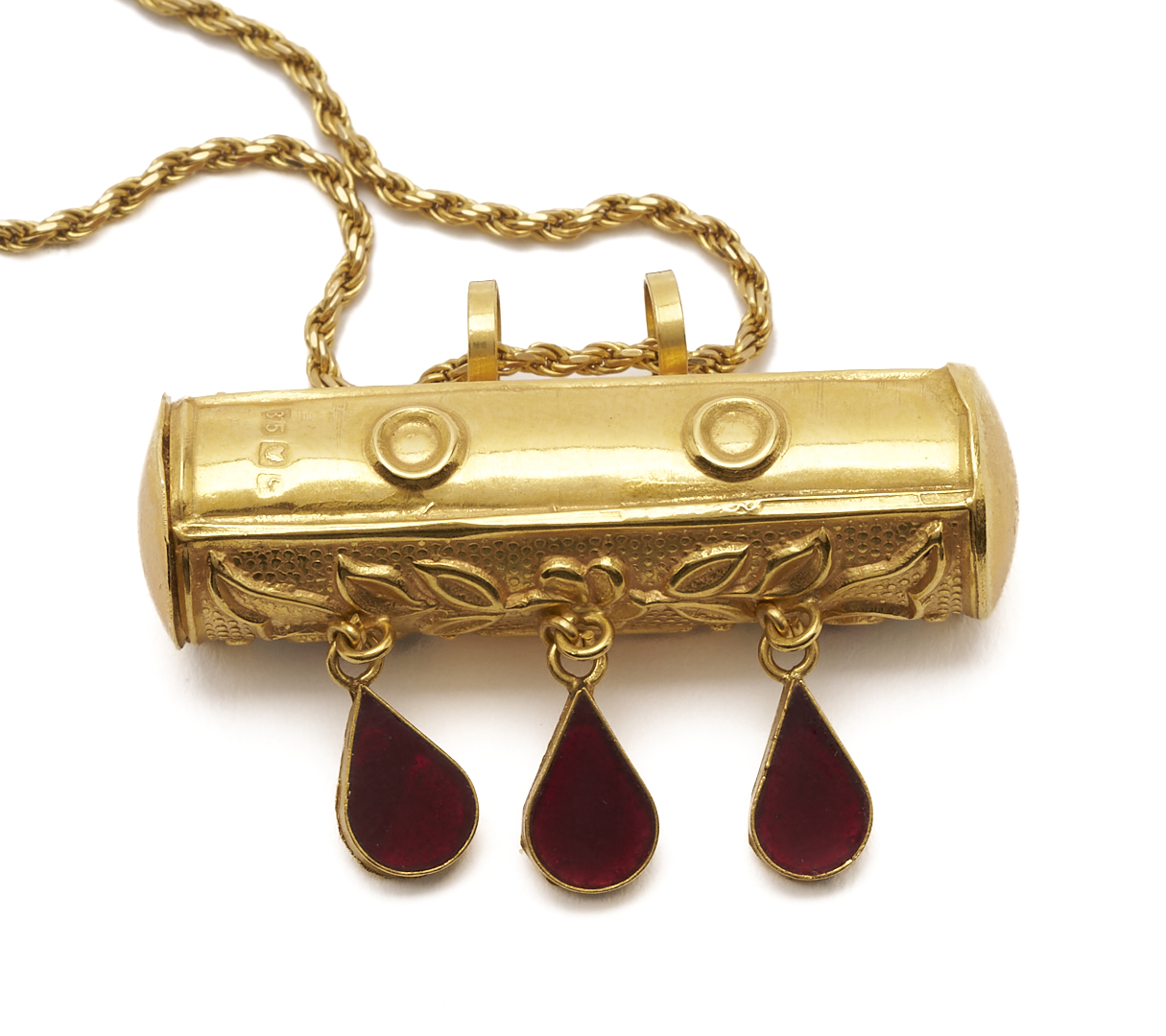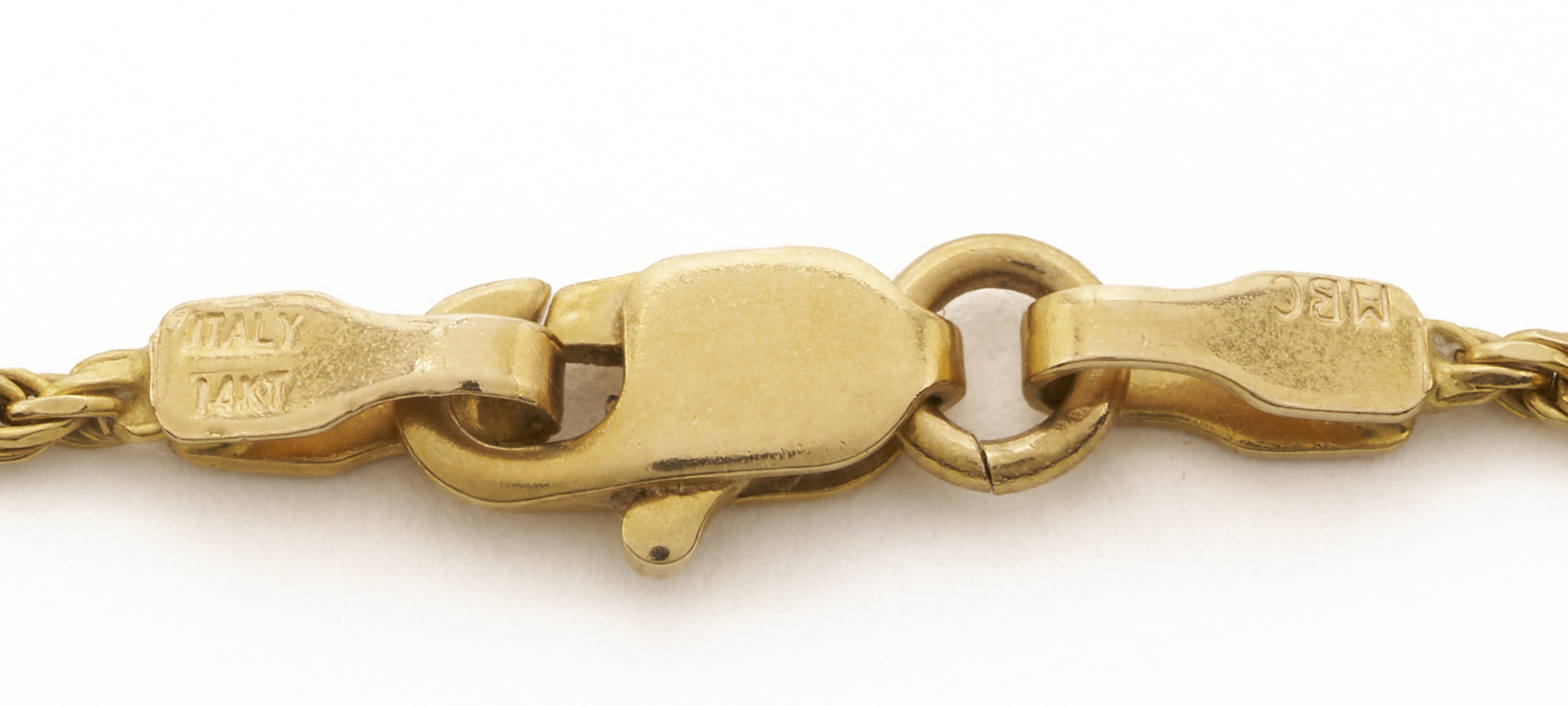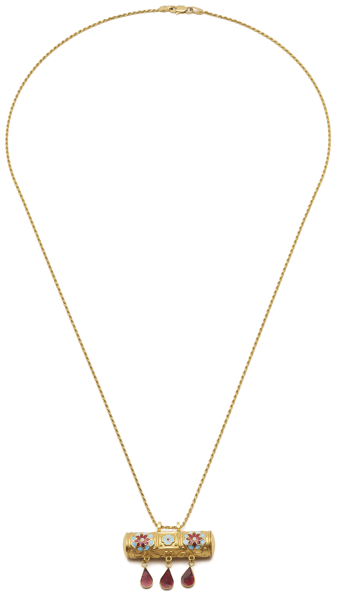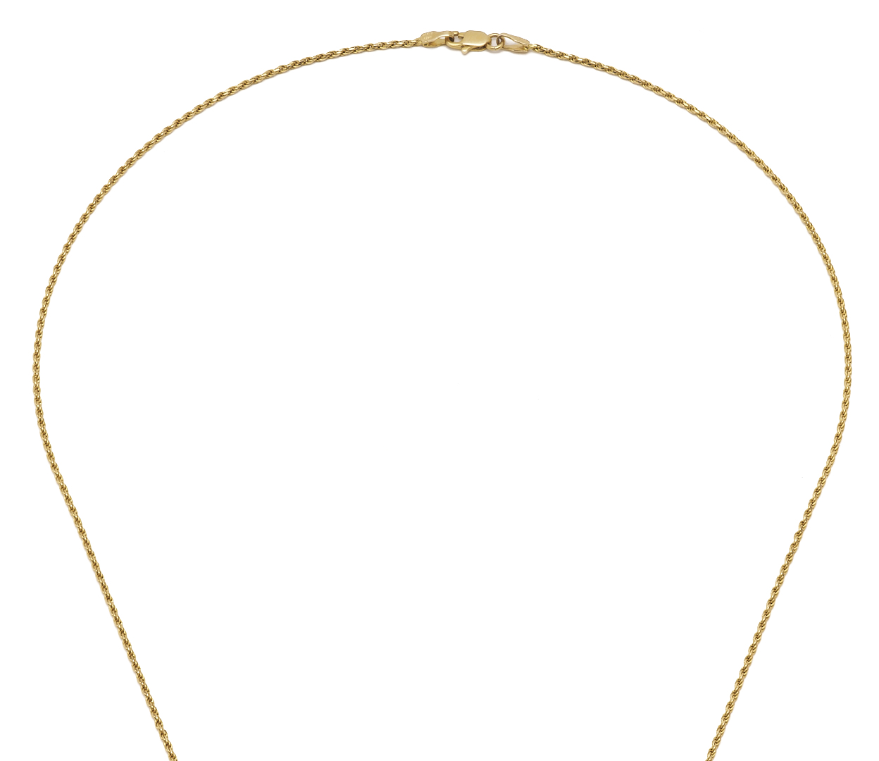 Ladies’ 14K yellow gold rope chain necklace with 21K yellow gold and enamel pendant. The necklace is marked “14K Italy” and XRF tests 14K gold, while the pendant is marked “875” and XRF tests 21K gold. The necklace is 24 in. L. and the pendant is 1 1/4 in. L x 3/8 in. diameter. The necklace and pendant together have a gross weight of 9.24 grams.