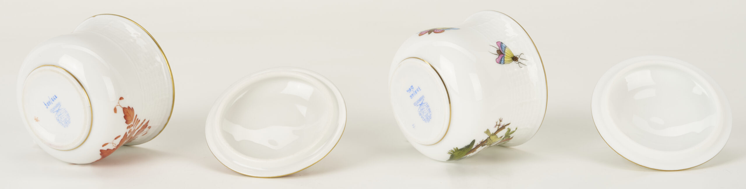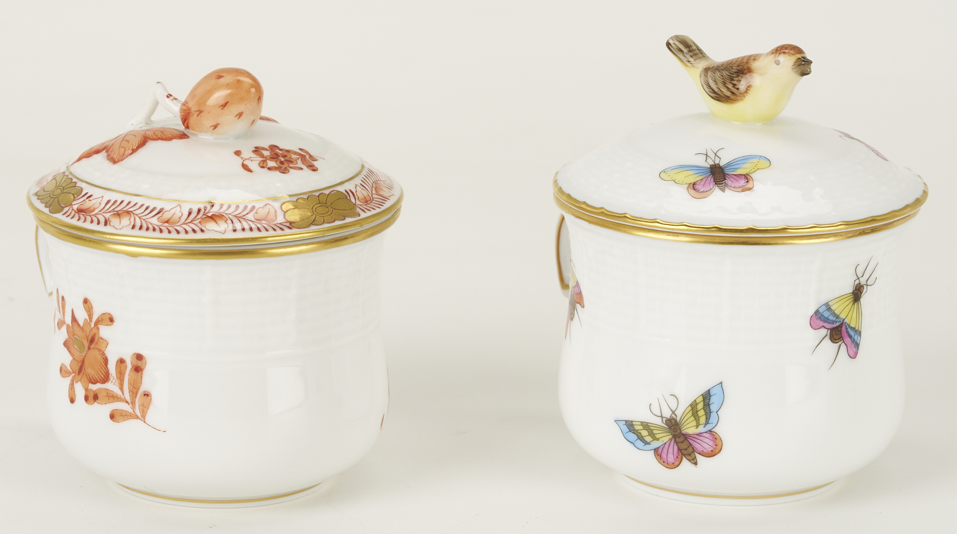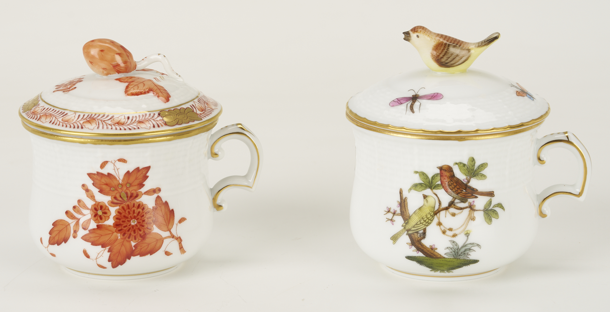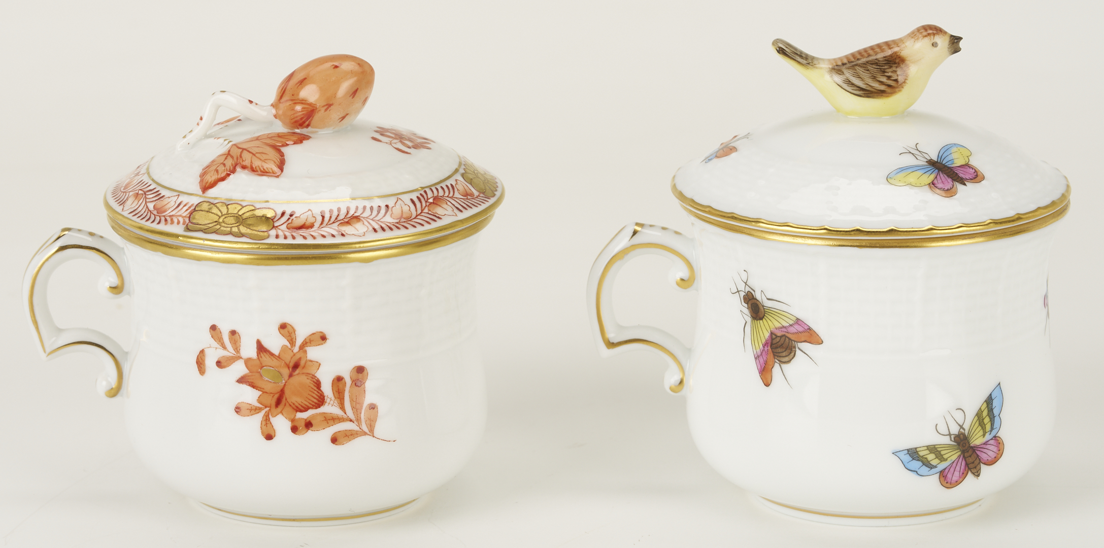 Grouping of seven (7) porcelain pots de creme from various makers. 1st – 2nd Items: Herend cups with covers, each hand-painted, one in rust-colored “Chinese Bouquet” pattern, marked with Herend stamp and 739/AOG, the other in their “Rothschild Bird” pattern with bird finial, marked 739/RO B94. 3rd – 4th Items: Pair of Limoges cups with covers, in bird and flowers motif, with gilt accents. Marked Limoges, France and with a “J” stamp in blue; 5th -6th Items: Pair of unmarked cups with covers, in a flower and garland design, each with gilt accents to handles and lids; 7th Item: Mottahedeh cup with cover in their Duke of Gloucester pattern, with fruit and insect motif, topped with a berry finial. Items range in size from 3 to 3 1/2 in H.